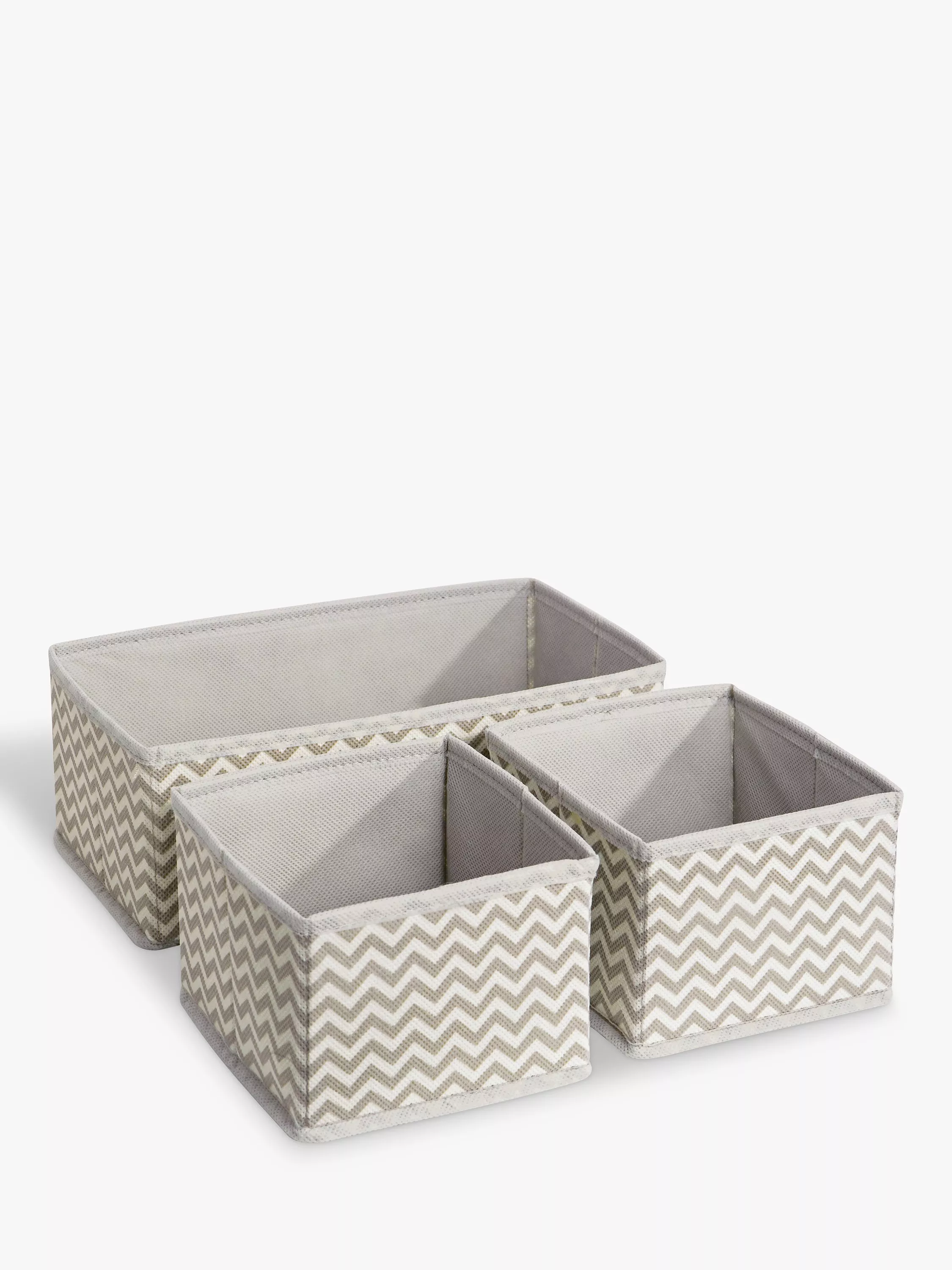 A three-piece set of stroage organisers, perfect for storing scarves, socks, undergarments, accessories, and much more. You can place them inside drawers, but they're also stylish enough for your dresser top.