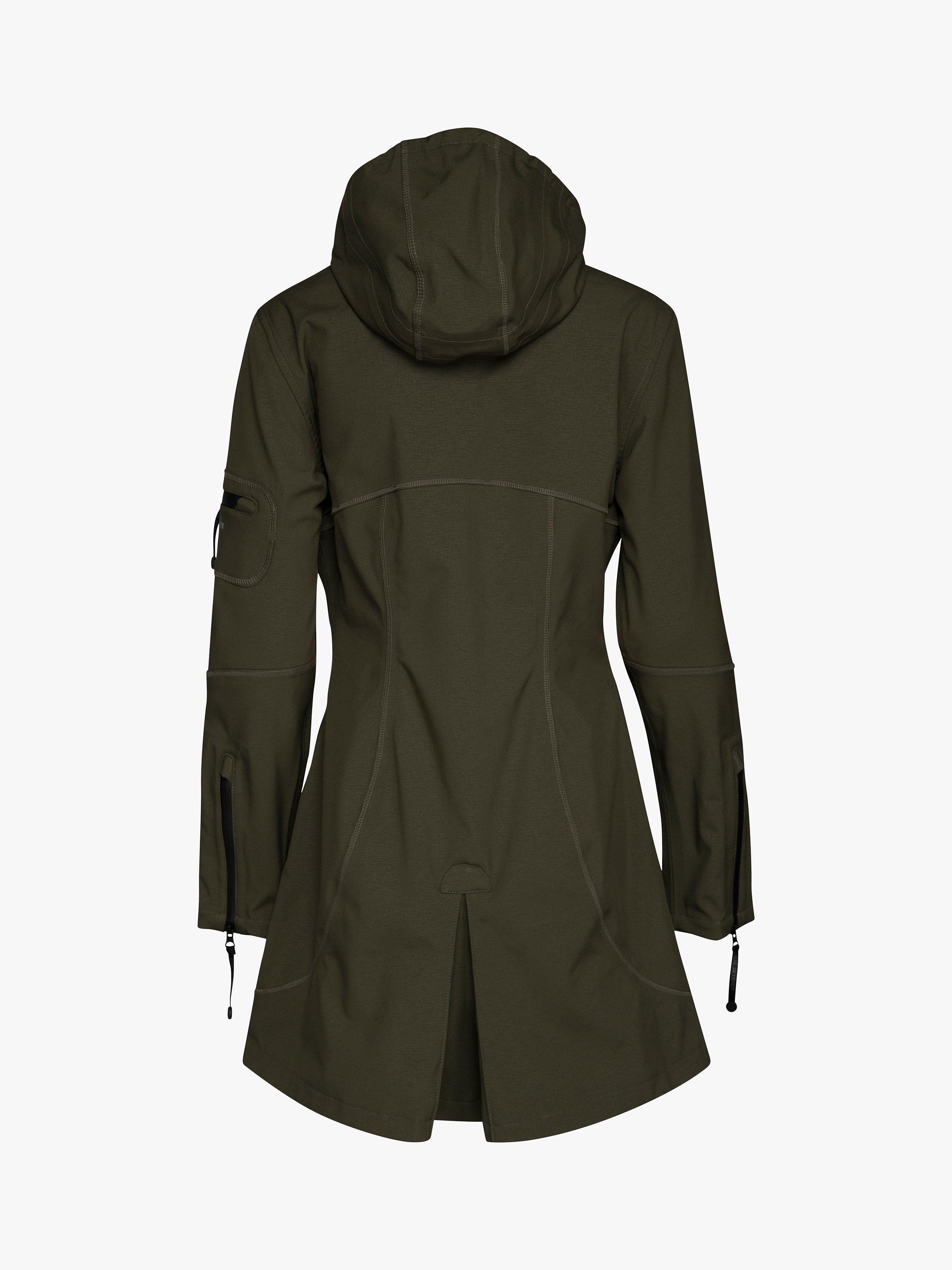 This functional raincoat, made of breathable and stretchable soft shell material, really emphasises the feminine silhouette with its cutlines and the rich double folded pleat at back for freedom of movement. All seams are taped.