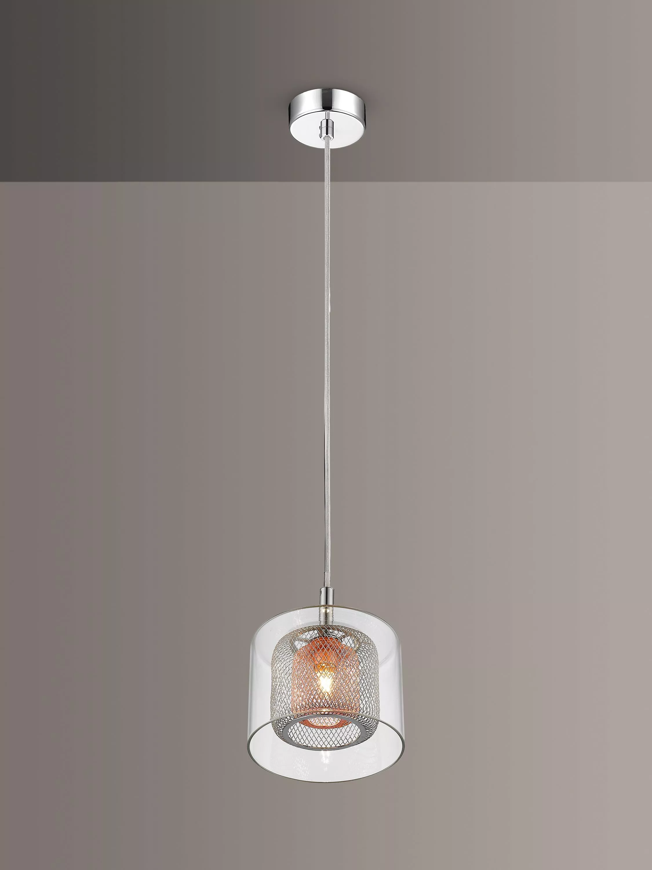 This pendant features a wired, mesh-style cage encased within a clear glass shade. This combination of materials and textures will draw the eye when the light is both switched on or off. It offers a warm, diffused glow of light and will suit modern interiors. Plus, the cable is height-adjustable at the point of installation.
