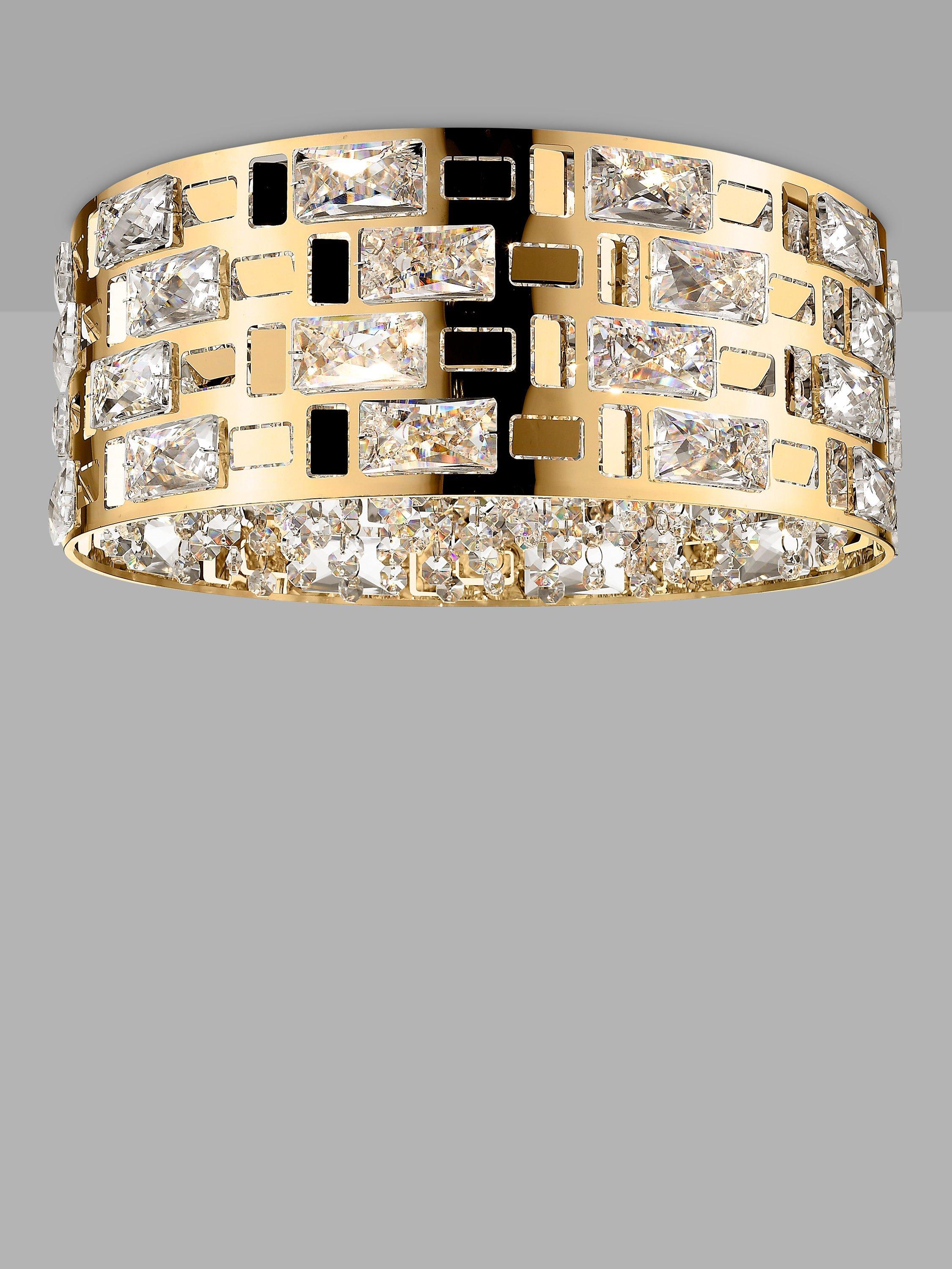 Made from metal in a gold or chrome finish, this flush ceiling light is designed with cut-out details and cascading crystals. When illuminated, it will sparkle and glow, adding a glamorous touch to your space and a warm output of light. Well-suited where space is limited thanks to its flush design, it requires a total of six LED bulbs and it's also available in a slightly smaller size.