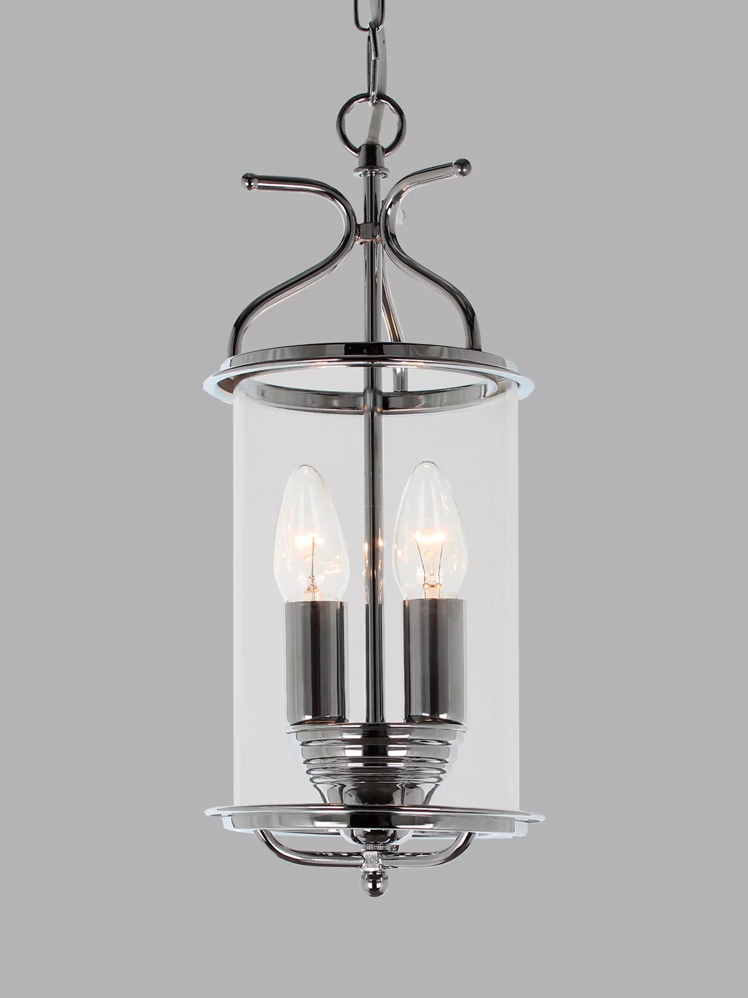 Available in a choice of metal finishes, this lantern-style pendant accommodates two LED bulbs. A traditional and elegant design, it's suspended from a height-adjustable chain and offers a warm glow of light.