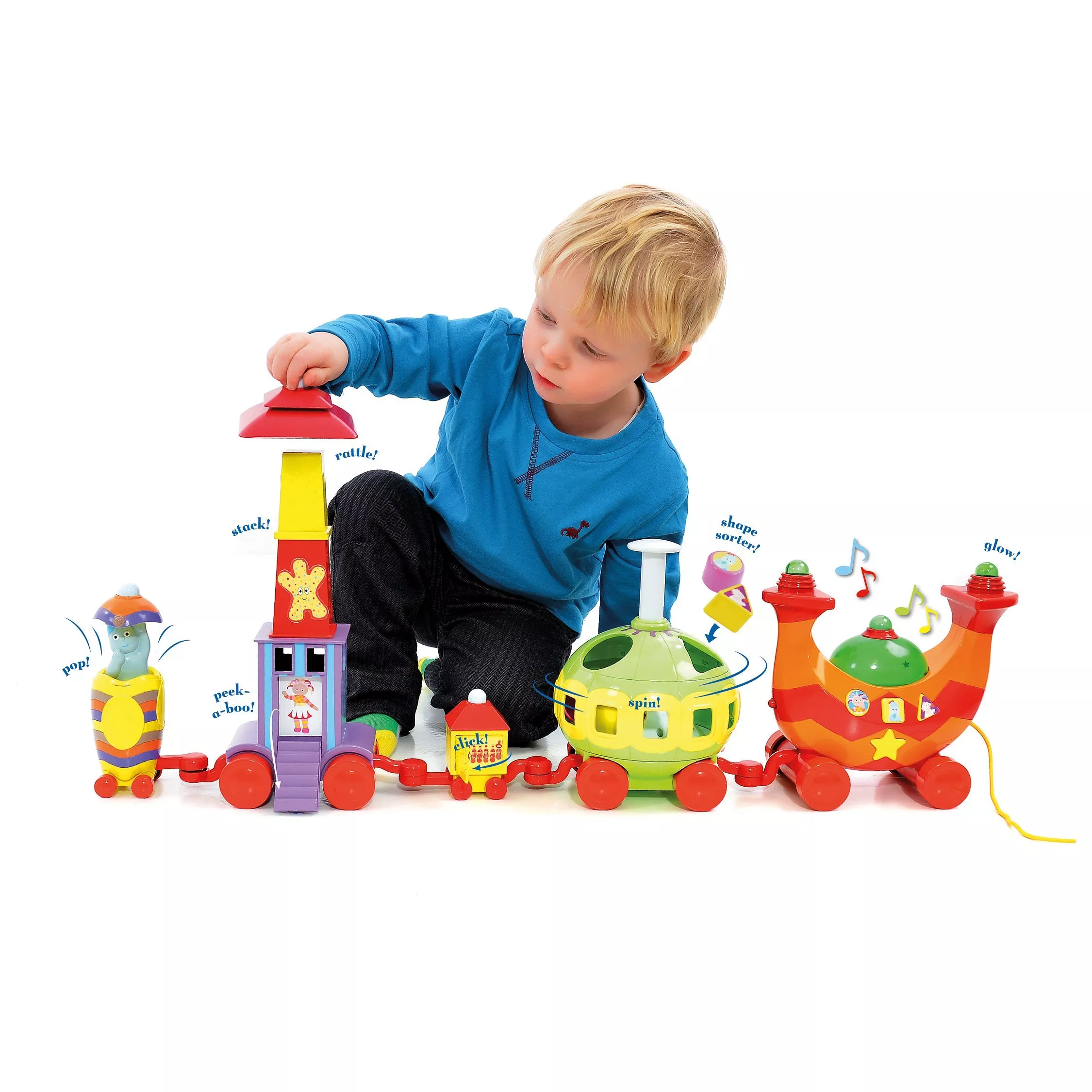 Made from brightly-coloured chunky plastic – ideal for little hands to grasp – the train has five activity carriages to explore: the musical pull-along engine; the spinning shape sorter; the Upsy Daisy stacking block carriages and the pop-up Igglepiggle and Peek-a-Boo carriage.