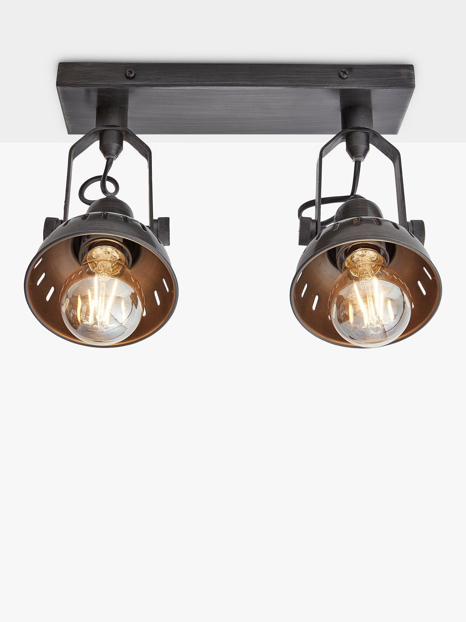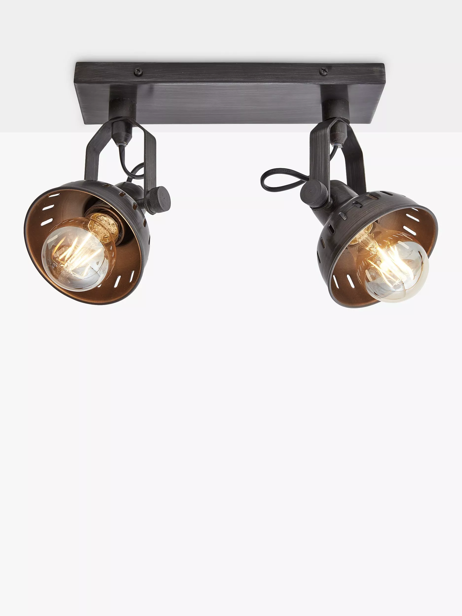 Industrial-inspired double spotlight that allows you to control the light thanks to the adjustable swivel heads. Can be fitted as a wall light or flush-mounted on the ceiling. The retro fixture suits various spaces and interior decor. IP20 rated for indoor use only.