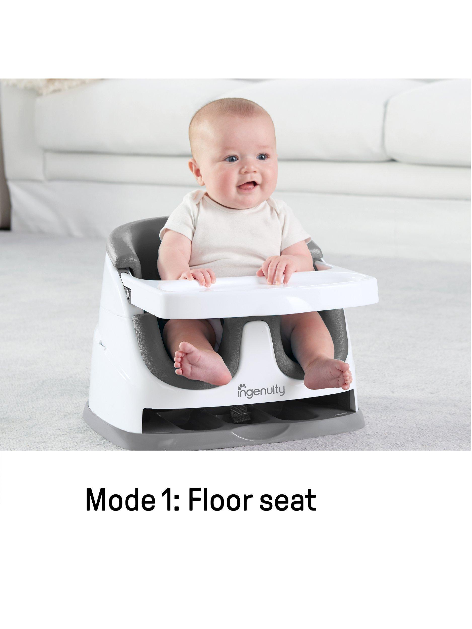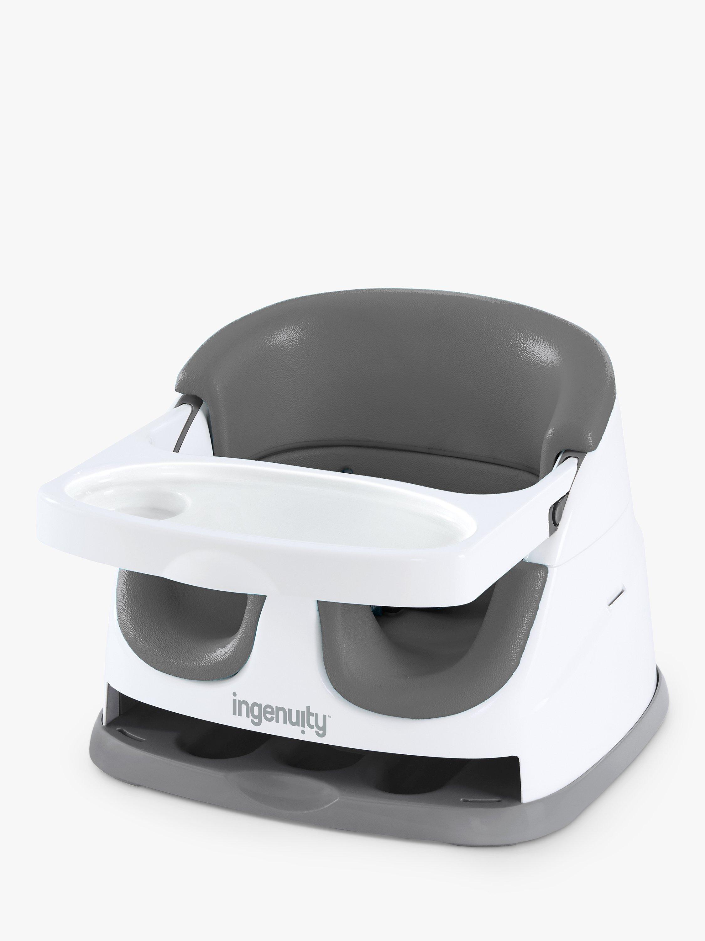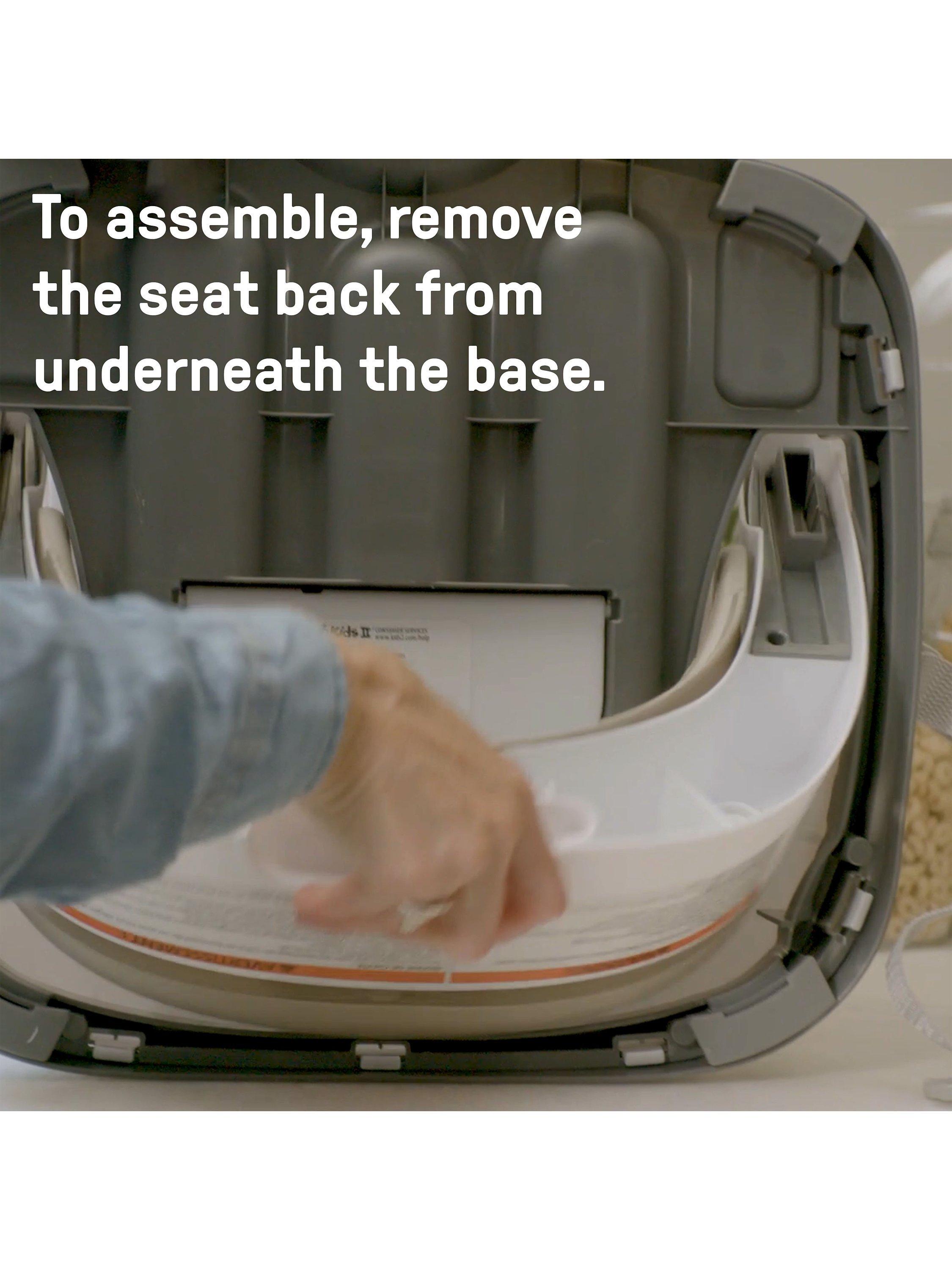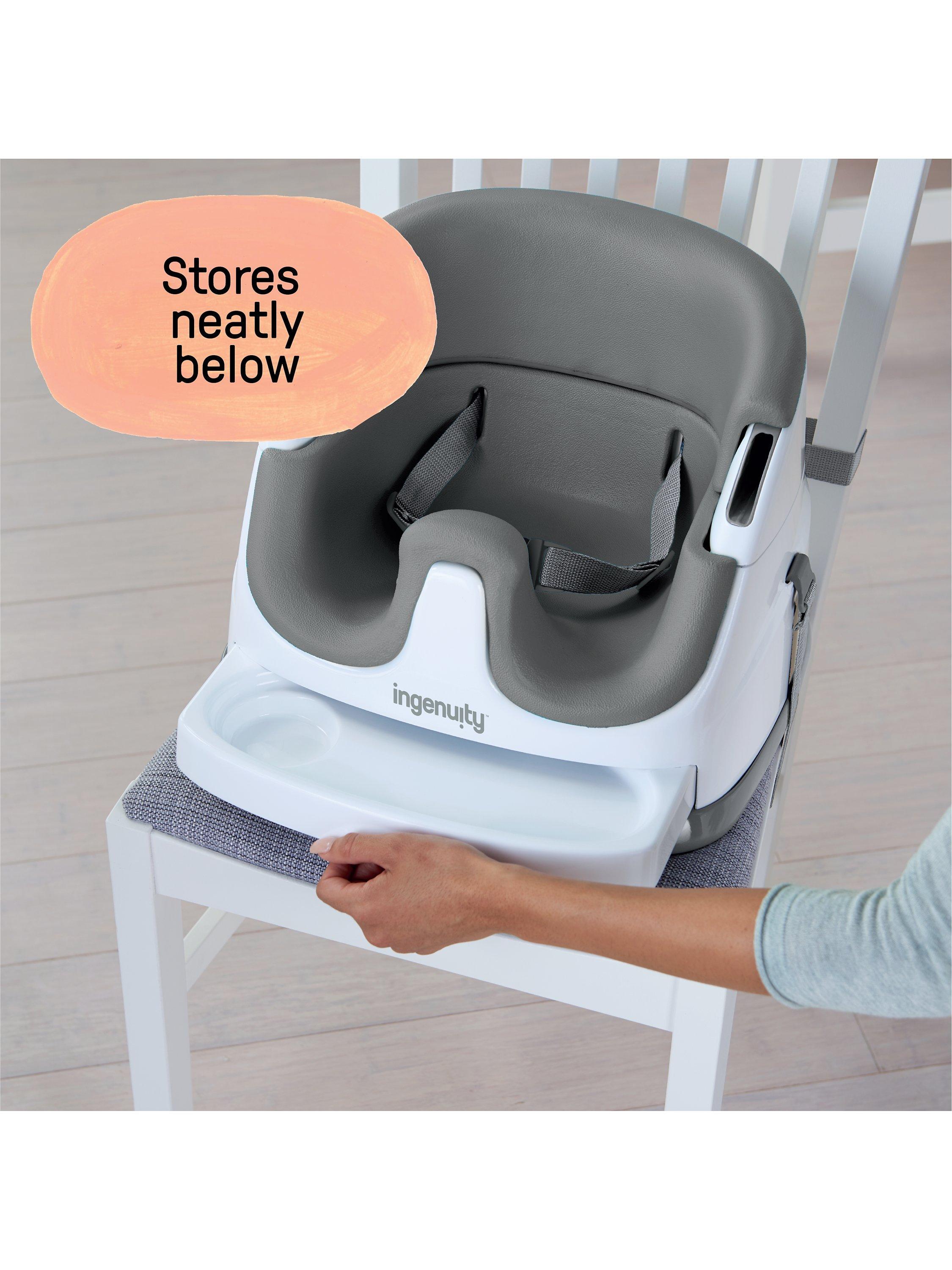 To assemble the Ingenuity Baby Base, remove the tray, turn the seat over and remove the seat back from underneath the base (tip: chair straps are also stored under the seat), and place the seat back onto the top of the base. The back is not removable after installation. Converts from baby booster to toddler seat by removing the foam insert and supports up to 15kg.