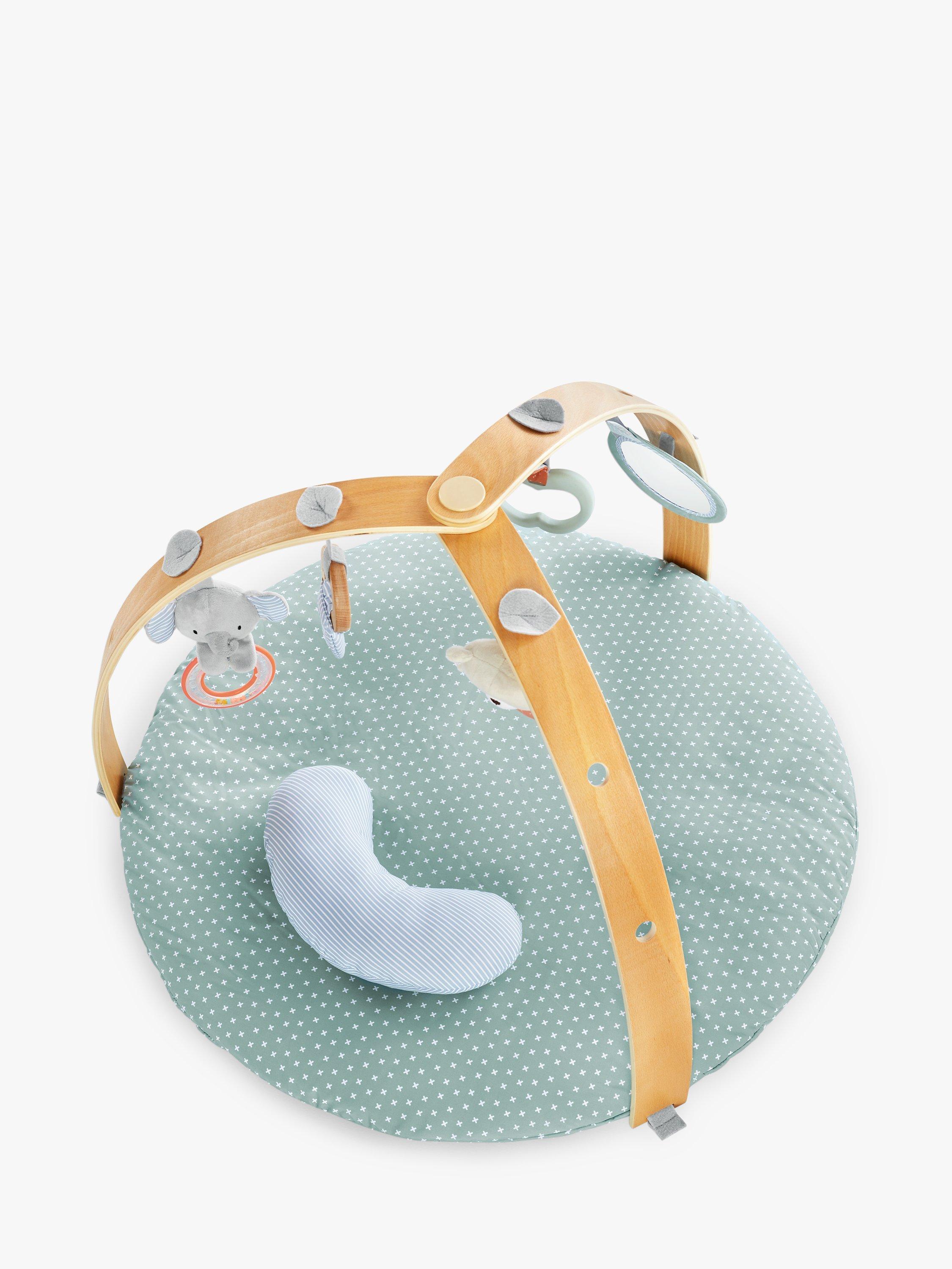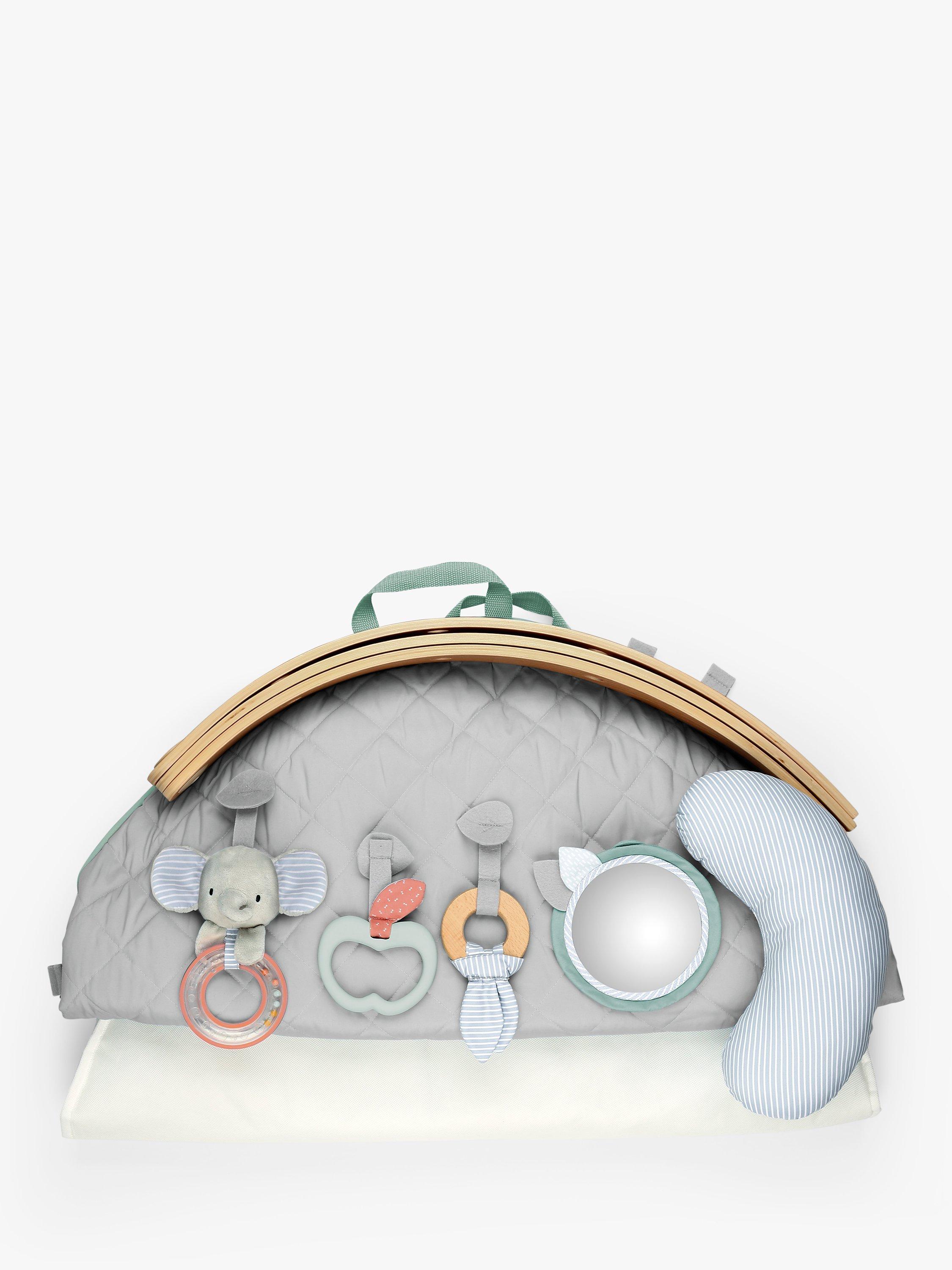 - Includes 6 removable activity toys: plush bear, bead rattle, mirror, natural rubber apple toy, wooden ring toy and tummy time pillow