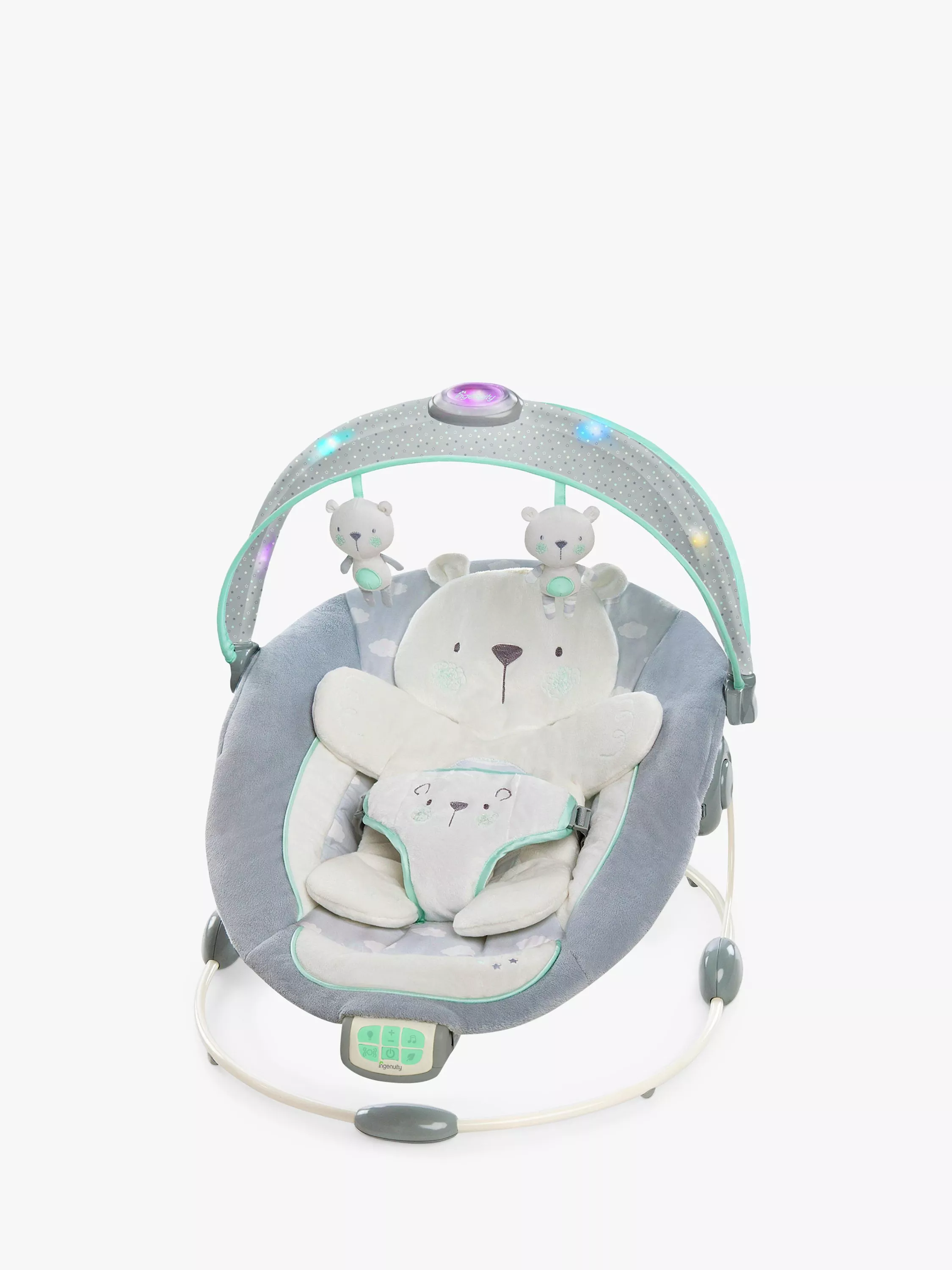 The Ingenuity Twinkle Bouncer is designed with easy parenthood in mind. A bouncer designed to comfort baby through touch, sounds, and lights!