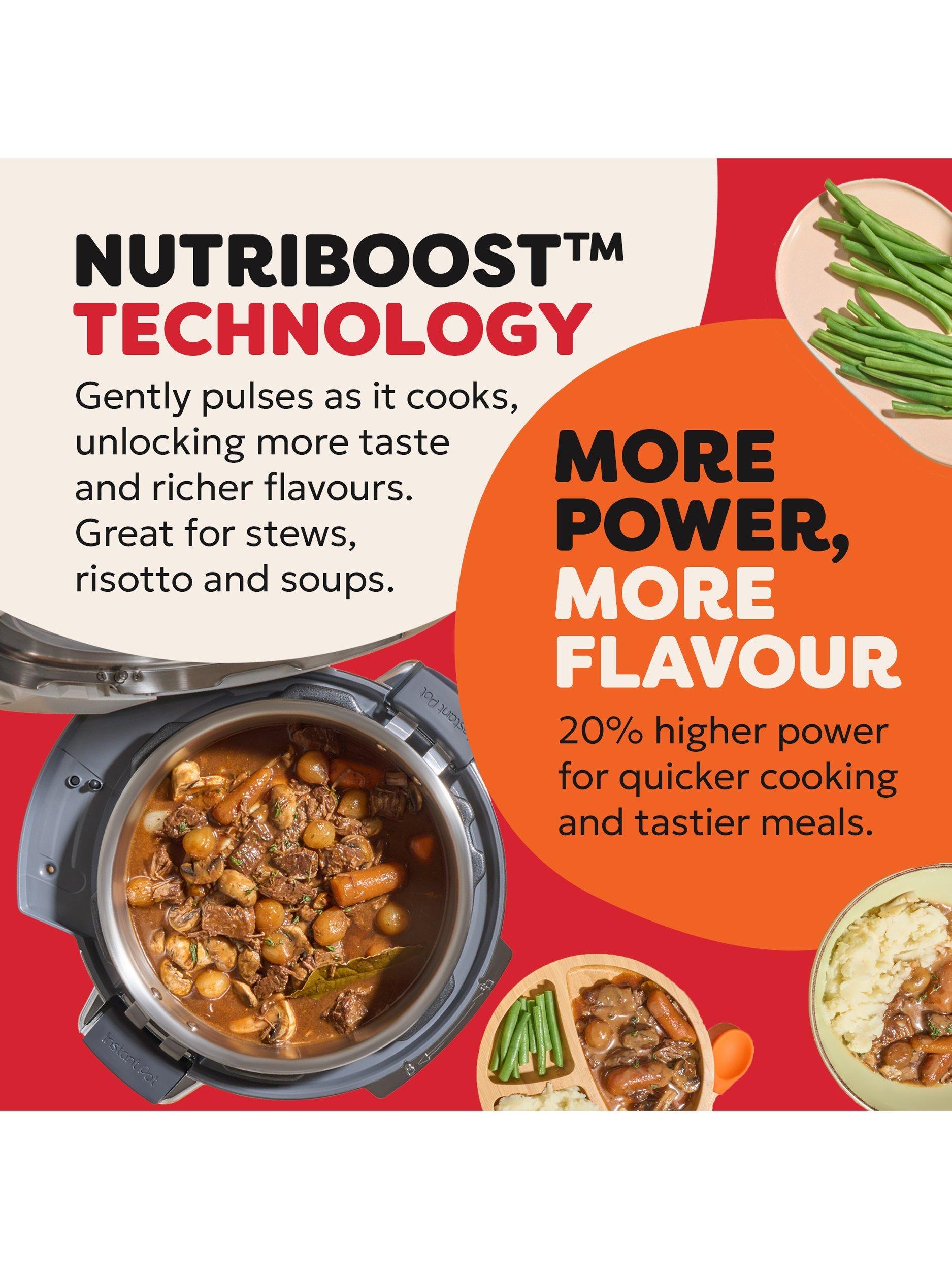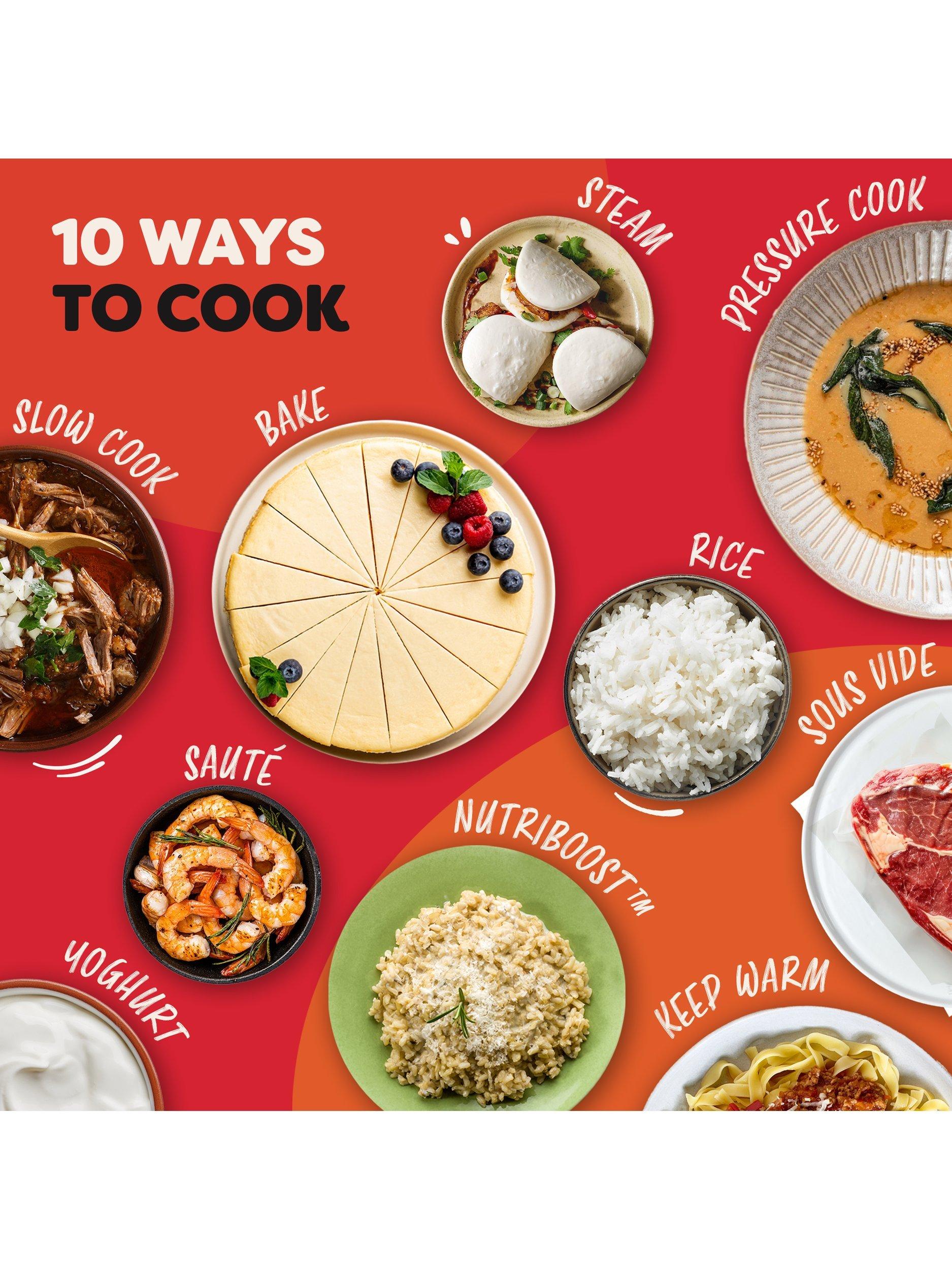 10 functions in one; pressure cook, slow cook, sauté, rice, steam, sous vide, bake, yoghurt, keep warm and Nutriboost.