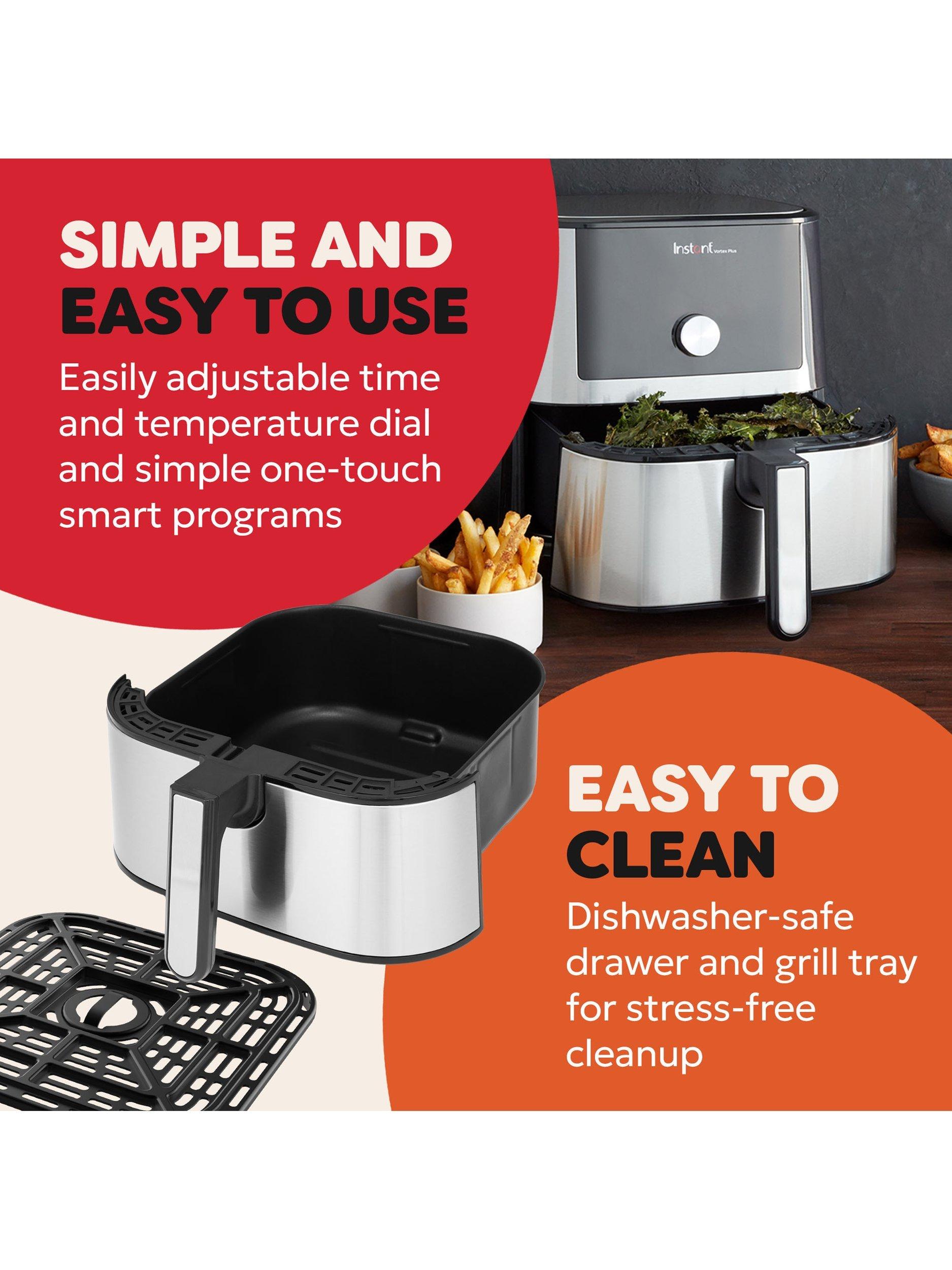 The brushed stainless-steel finish is stylish and fingerprint resistant, and both the basket and cooking tray are dishwasher-safe for easy cleaning.