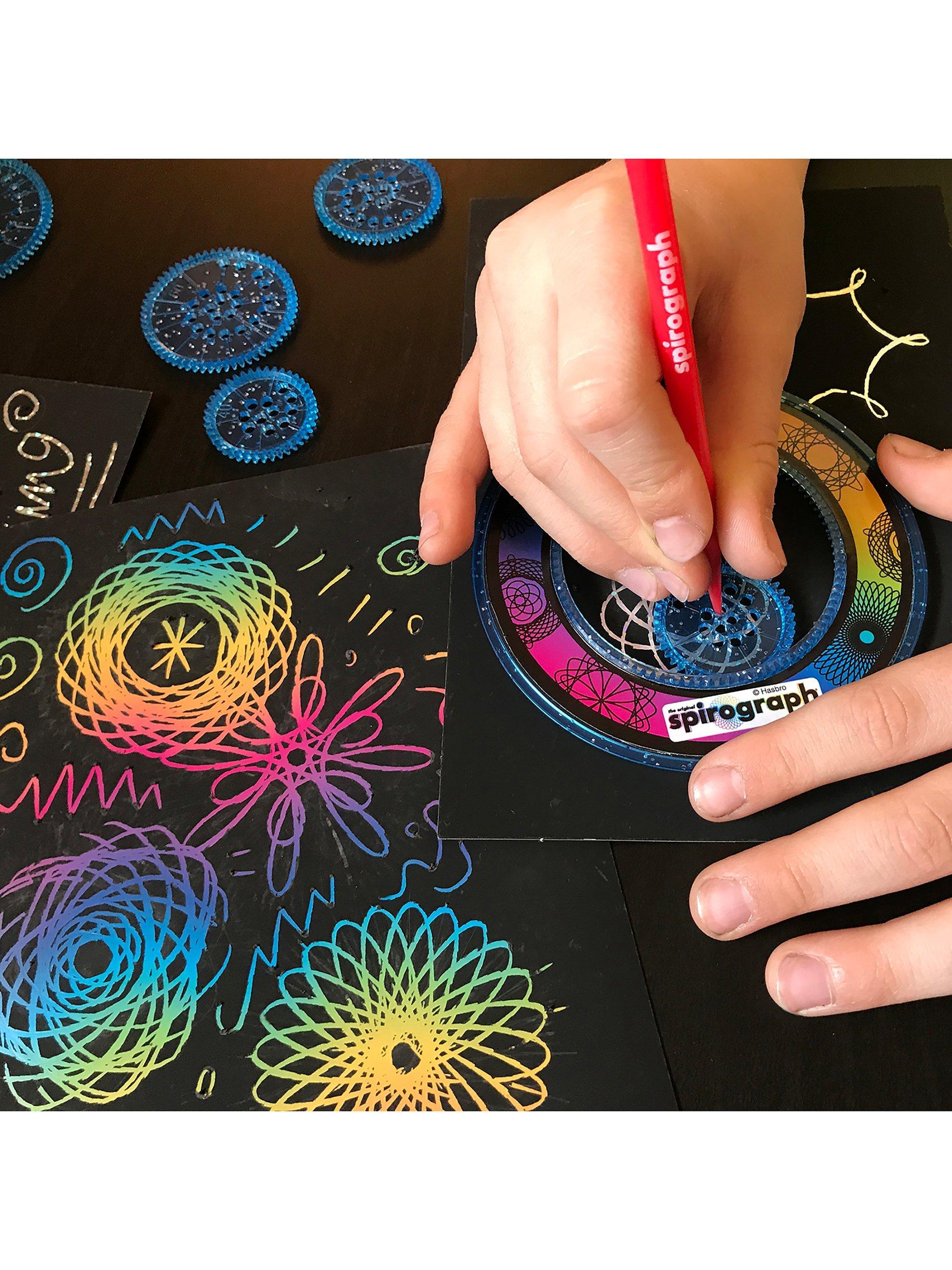 Take your Spirograph designs to the next level with this exciting set. It's got everything you need to make the coolest stickers and designs ever. Use the special stylus tool with the included wheels to scratch off the black paper. A shimmering rainbow look will be revealed!