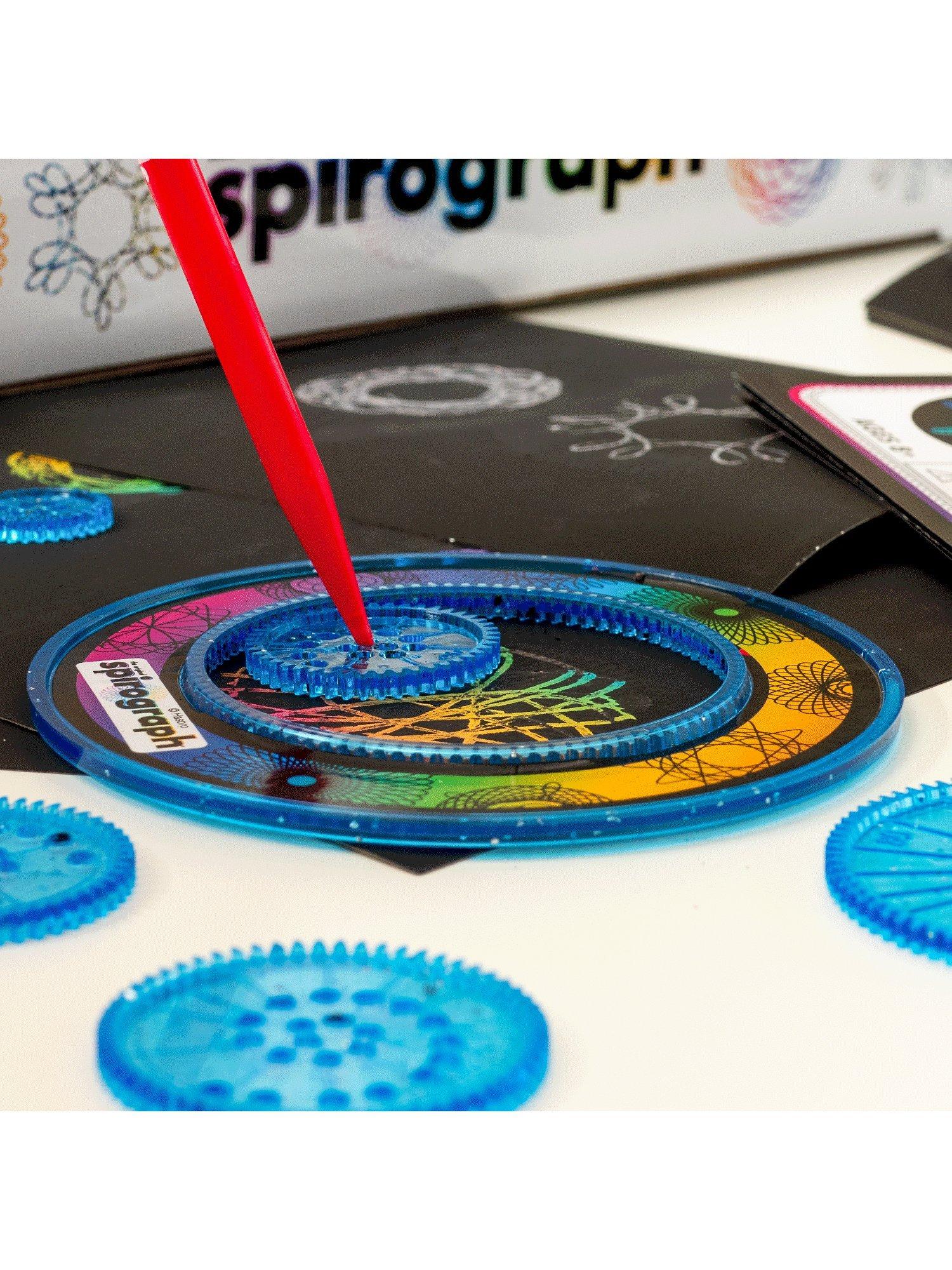 This set comes with 6 wheels, 1 glittery gear, a sticker book, black scratch-off paper and a stylus tool. You can use this Spirograph set in the normal way too.