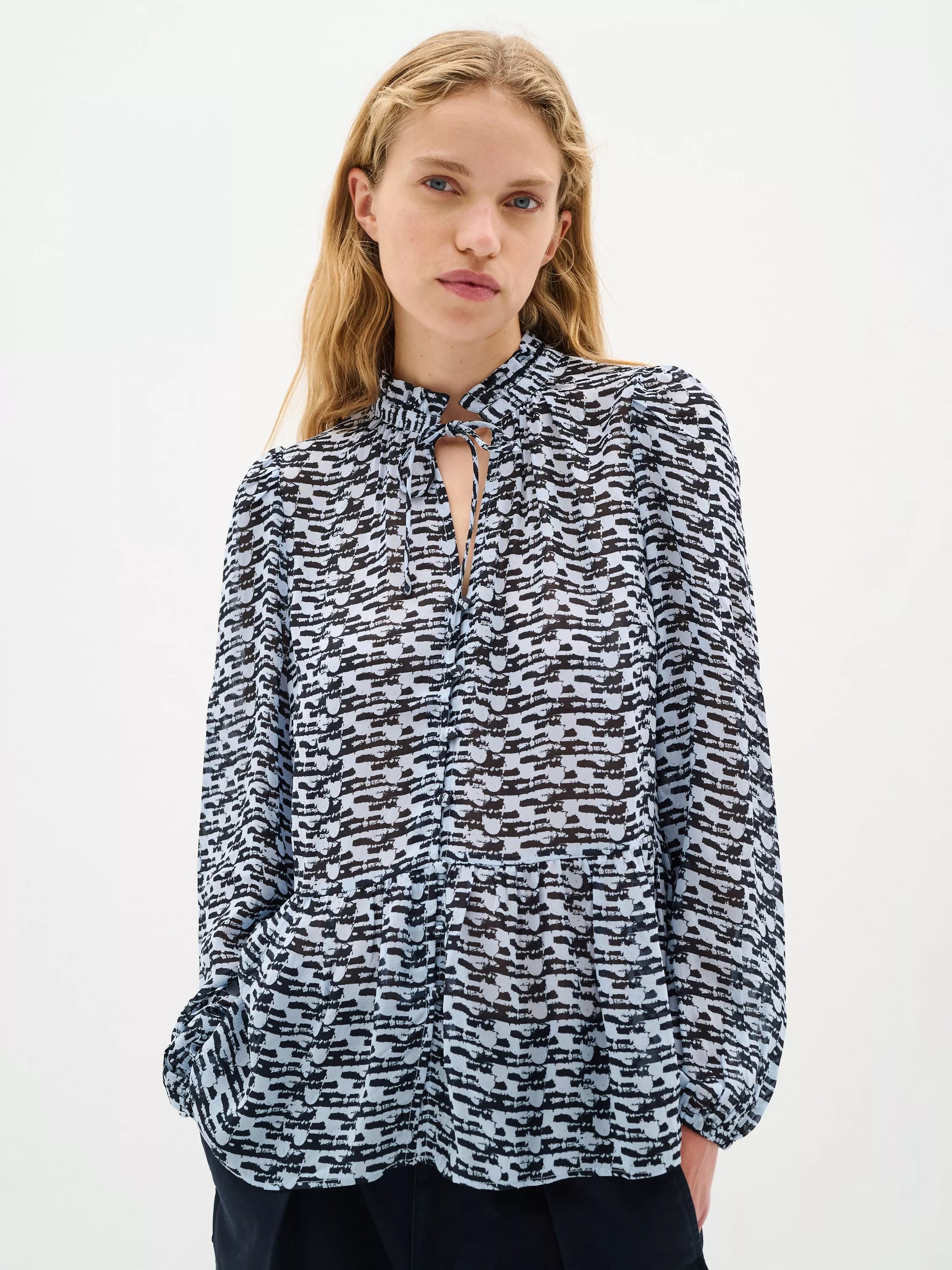 The Cessie shirt is a feminine chiffon shirt in a cool, graphic print. It has a V-notch neck with a tying string and a stand collar, and it has button fastening. The sleeves are long and loose with elastic sleeves edges, and the shirt is sheer and has a regular fit with a flared tier from the waist.
