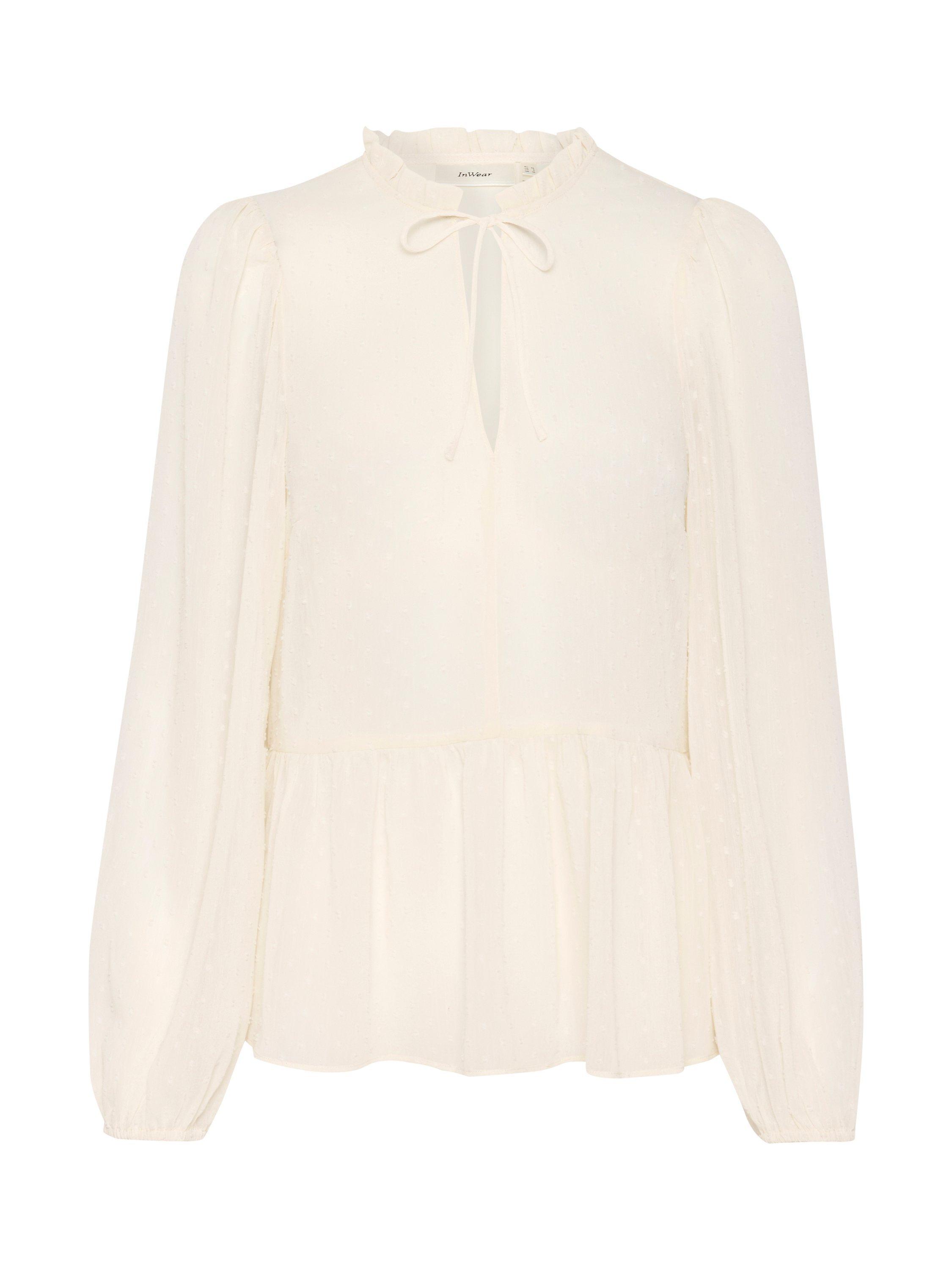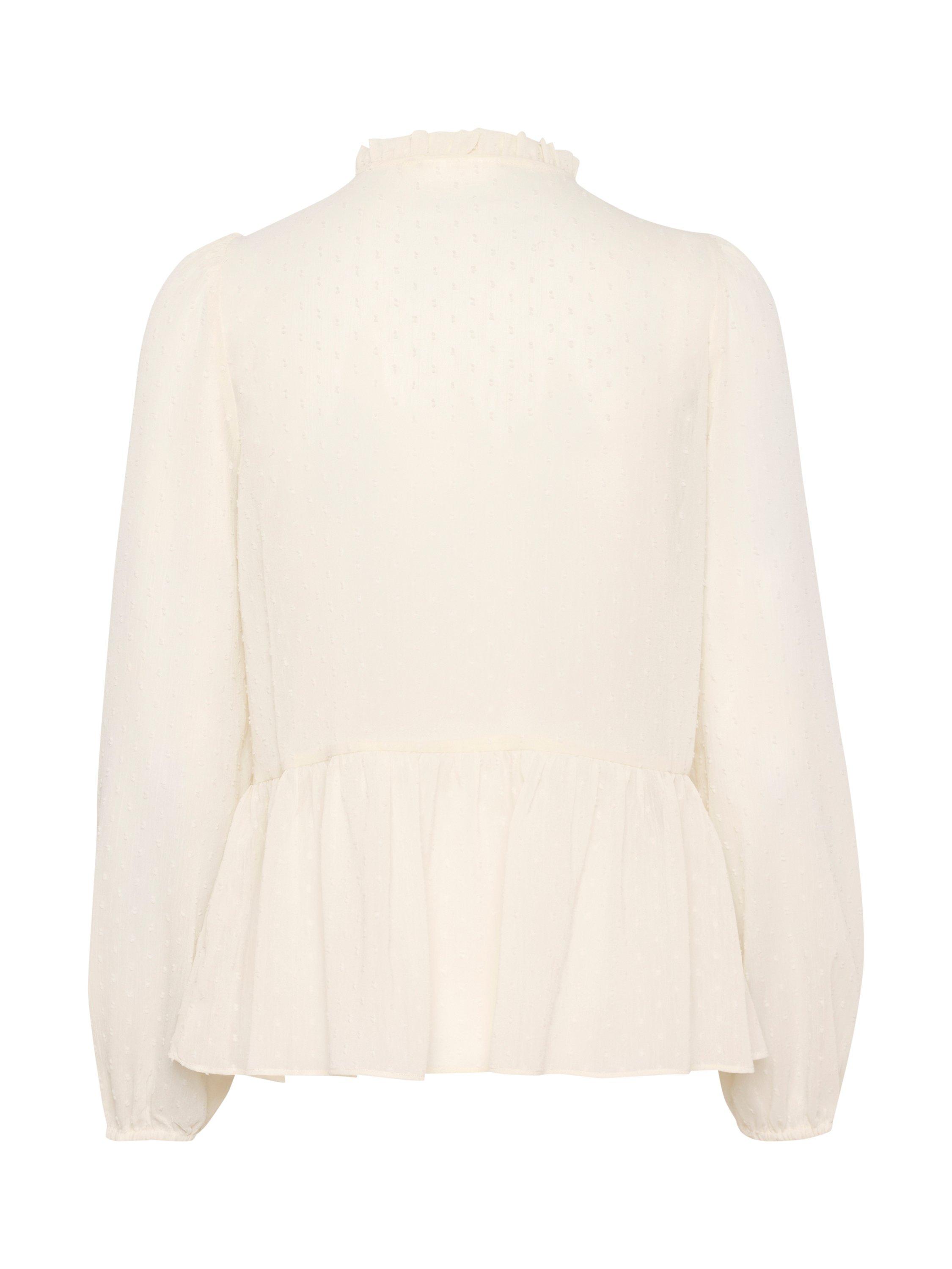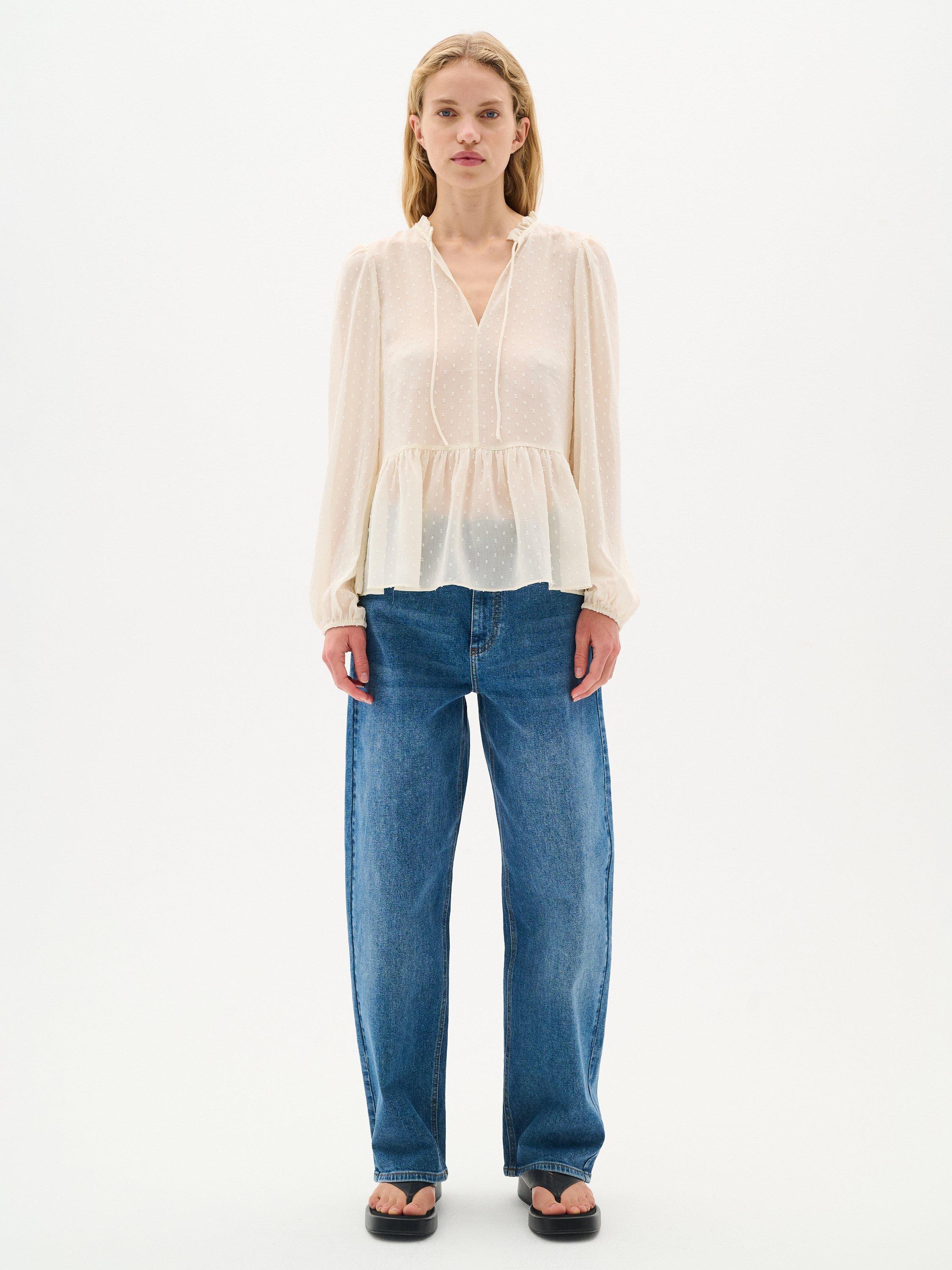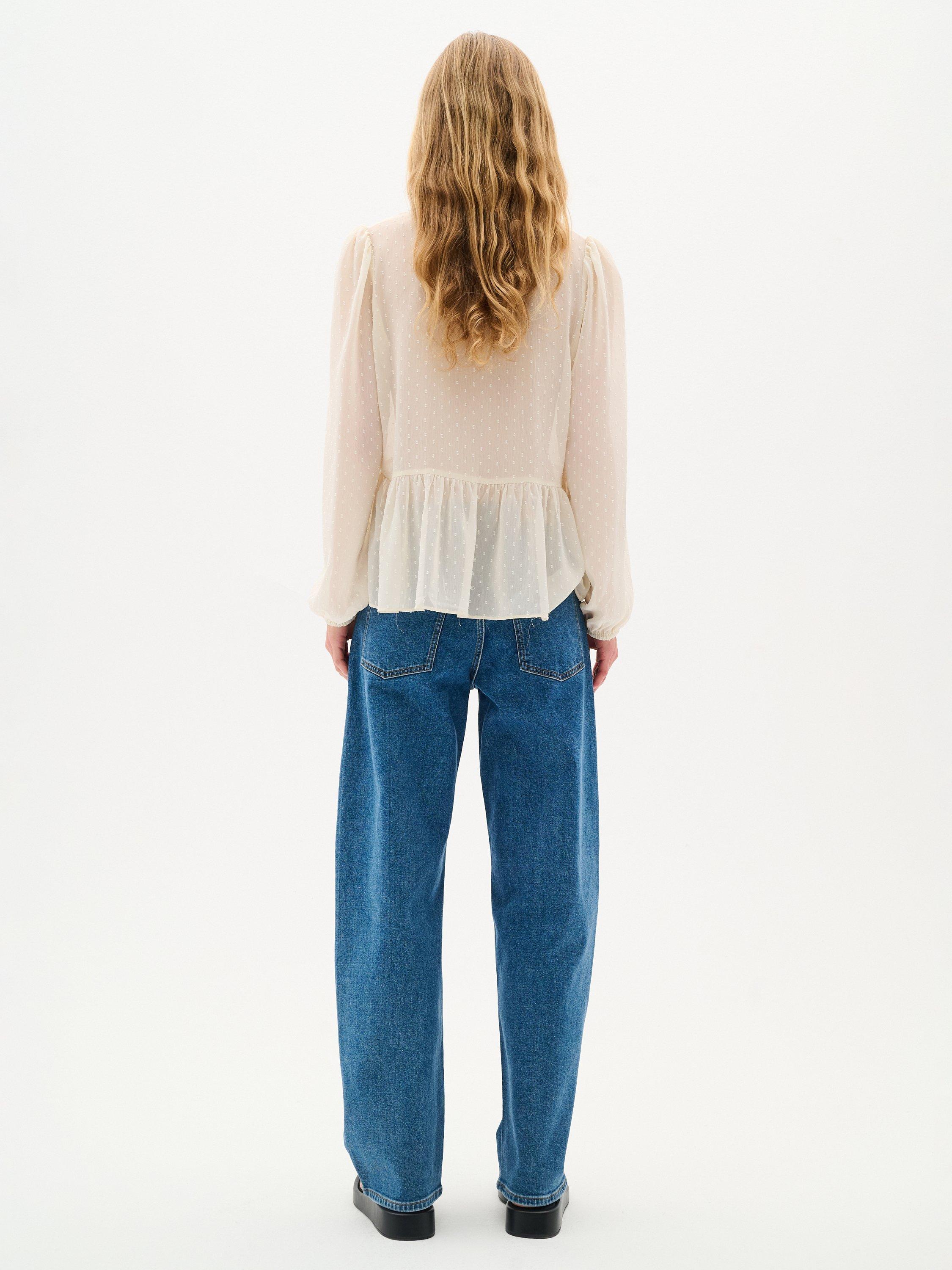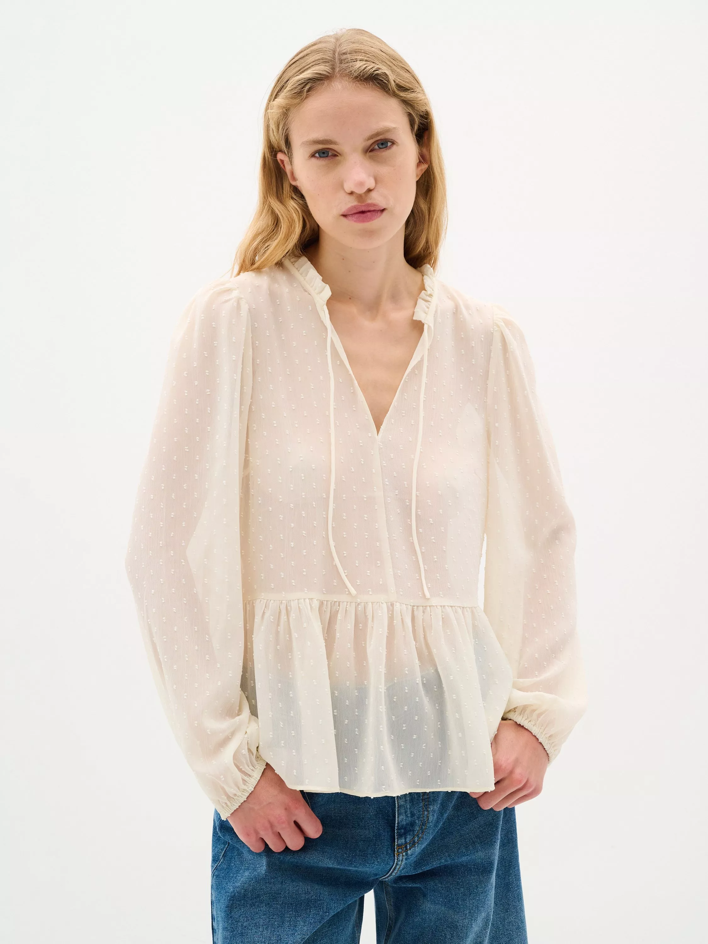 The Cibil blouse is a feminine top that will look great with any outfit. It has a V-notch neck with a frilled collar and a tying string, and it has a regular fit and a flared tier at the waist. The sleeves are long and loose with elastic sleeves edges, and the blouse is made in a sheer swiss dot fabric.