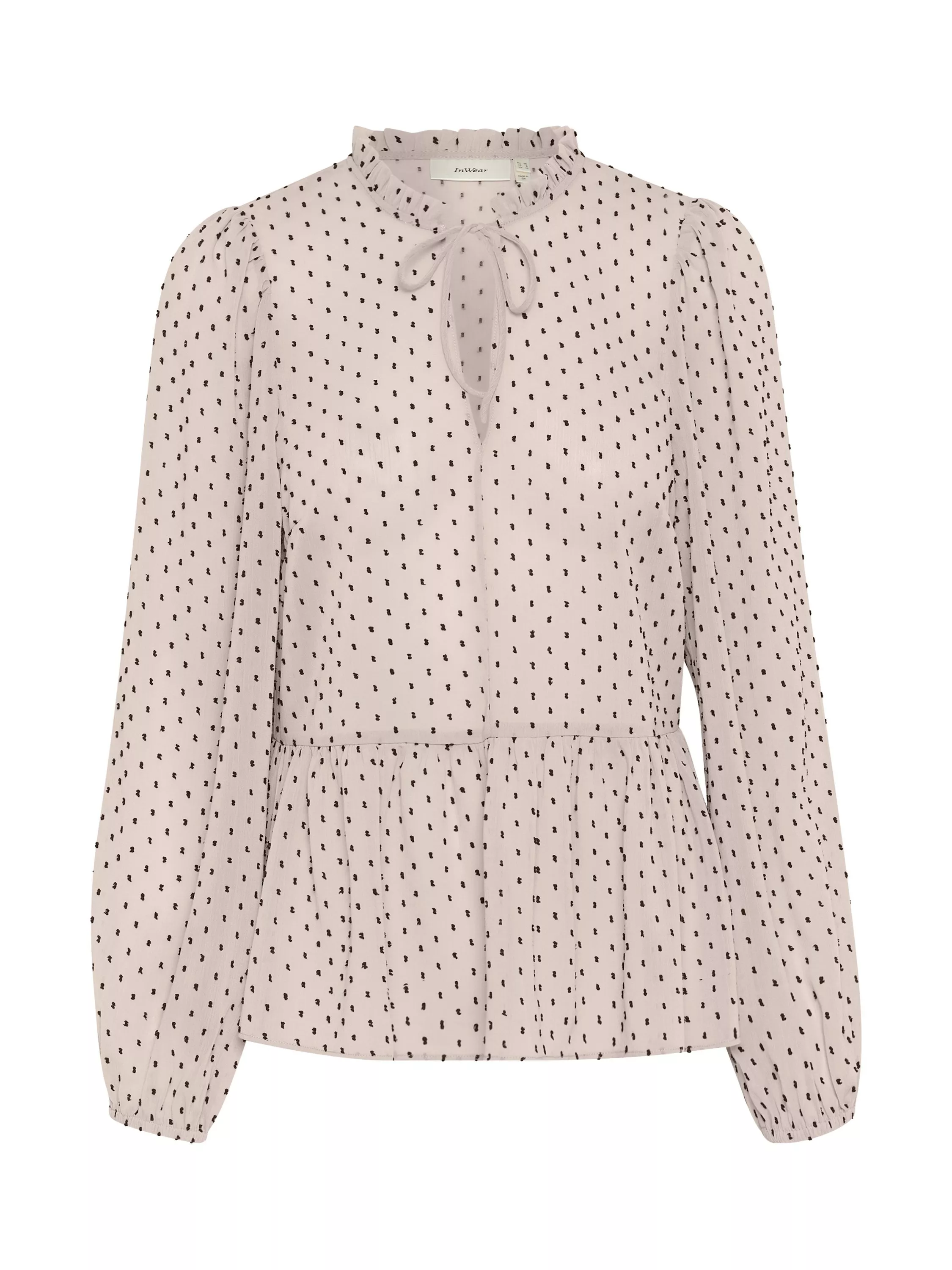 The Cibil blouse is a feminine top that will look great with any outfit. It has a V-notch neck with a frilled collar and a tying string, and it has a regular fit and a flared tier at the waist. The sleeves are long and loose with elastic sleeves edges, and the blouse is made in a sheer swiss dot fabric.