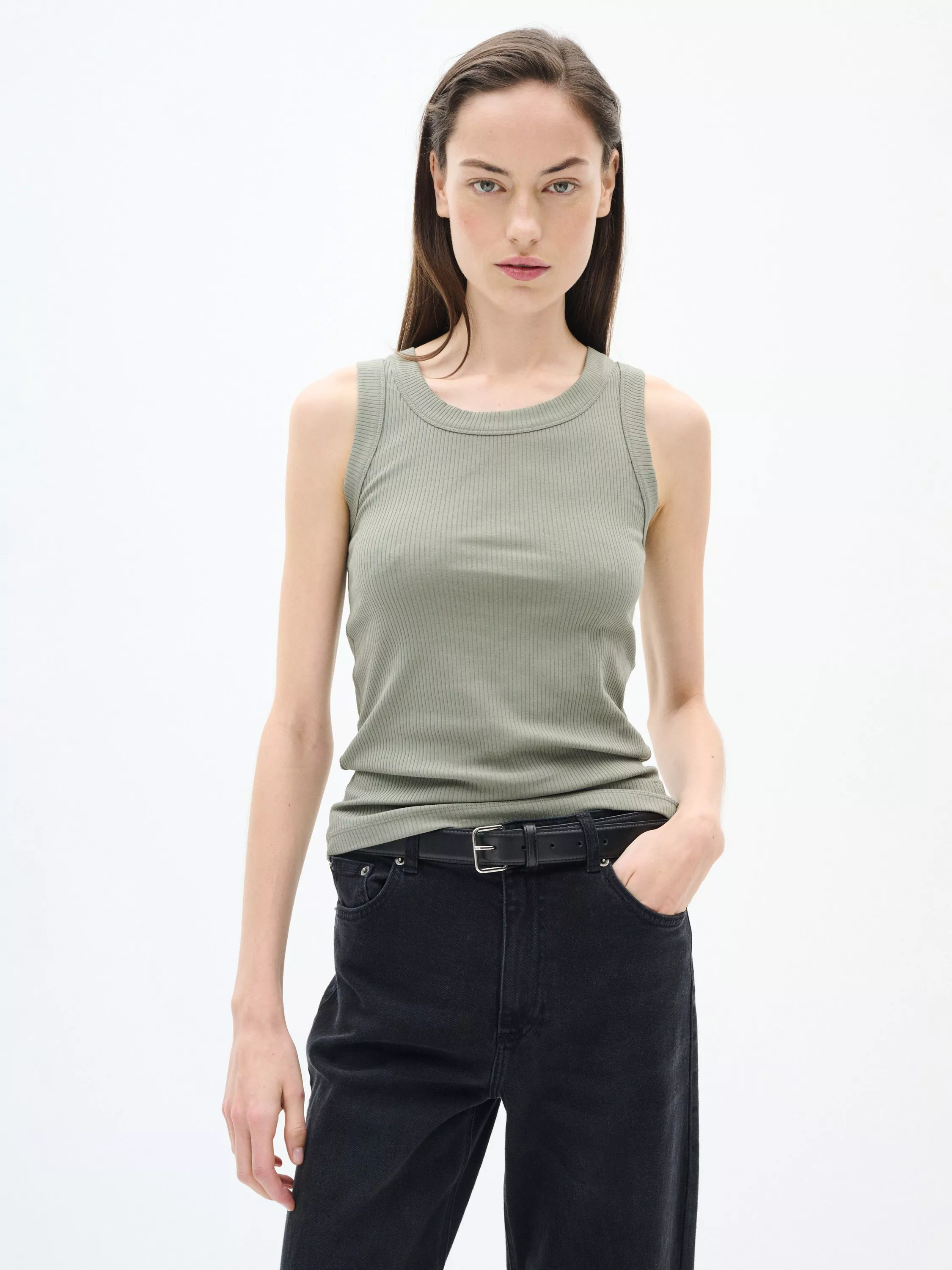 The Dagna top is a casual tank top and a musthave in your wardrobe. It is sleeveless and has a scoop neck, and it has a wide rib edge. The tank top has a slim fit and it is made in a soft and stretchy rib cotton jersey.