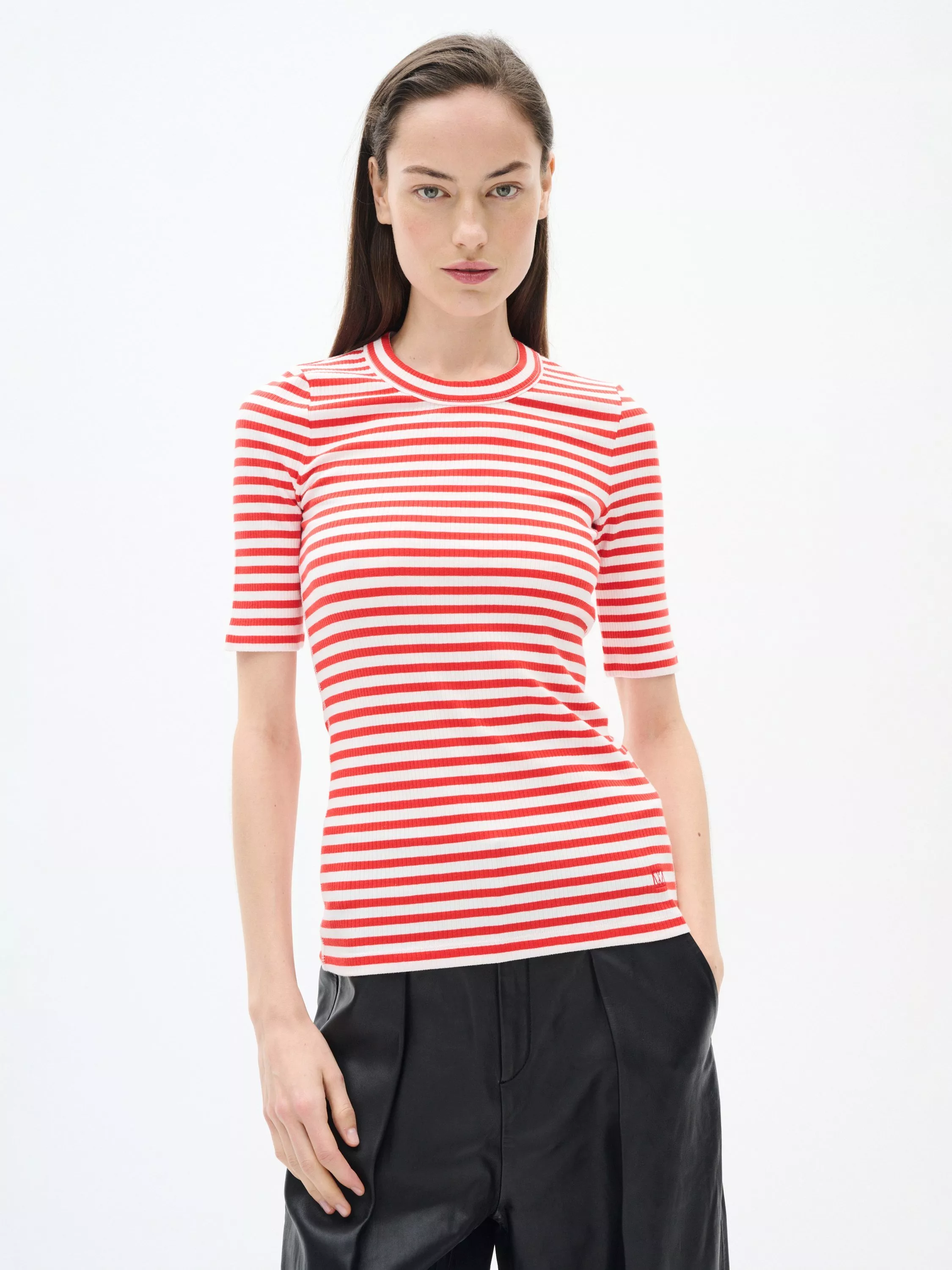 The Dagna T-shirt is a simple and casual Tee, with a chic Parisian vibe. It has a crew neck with a wide rib edge, and it has a slim fit. The sleeves are cut above the elbows and the T-shirt is cut at the hips. It is made in a soft cotton rib jersey with narrow horizontal stripes.