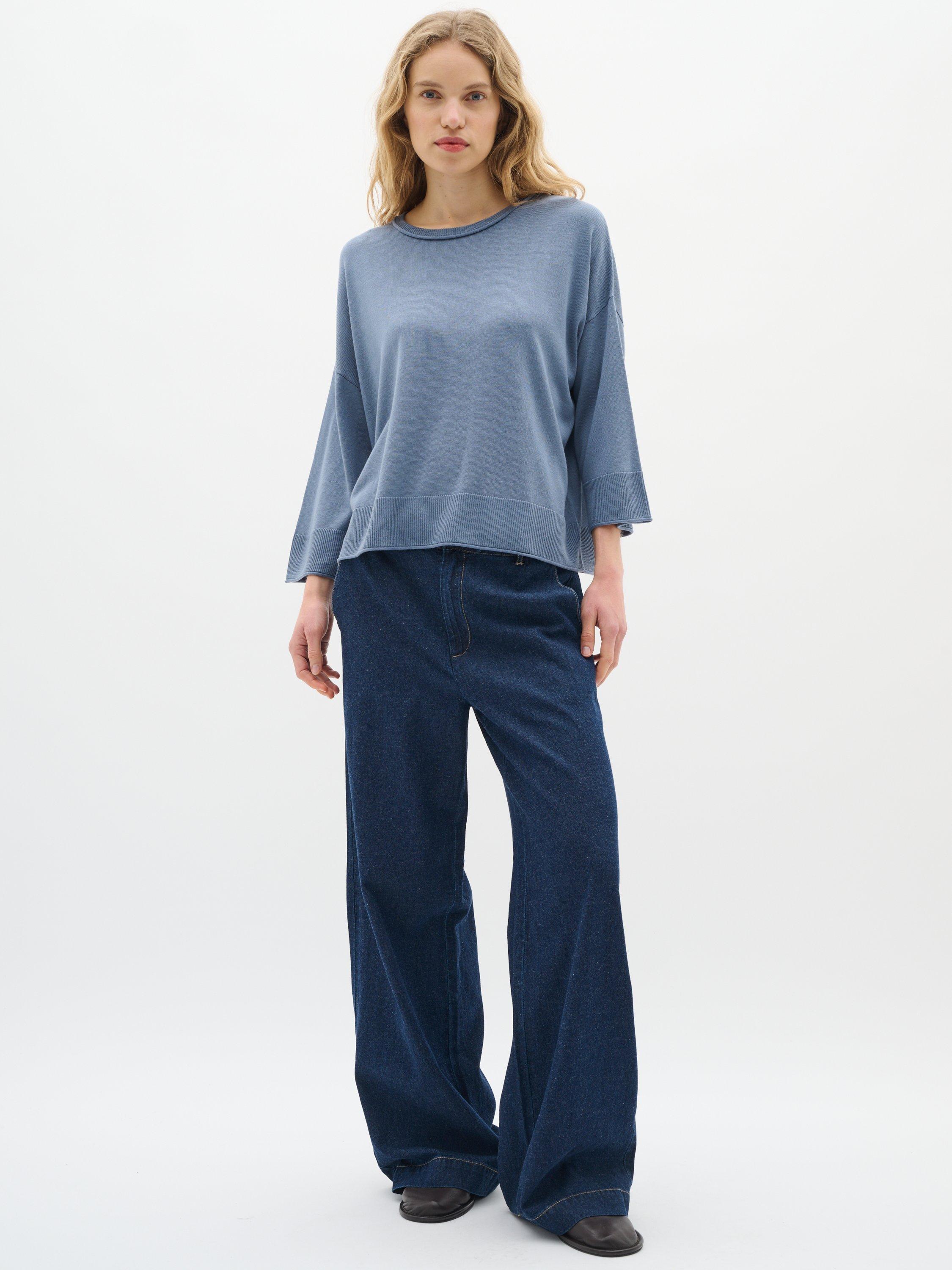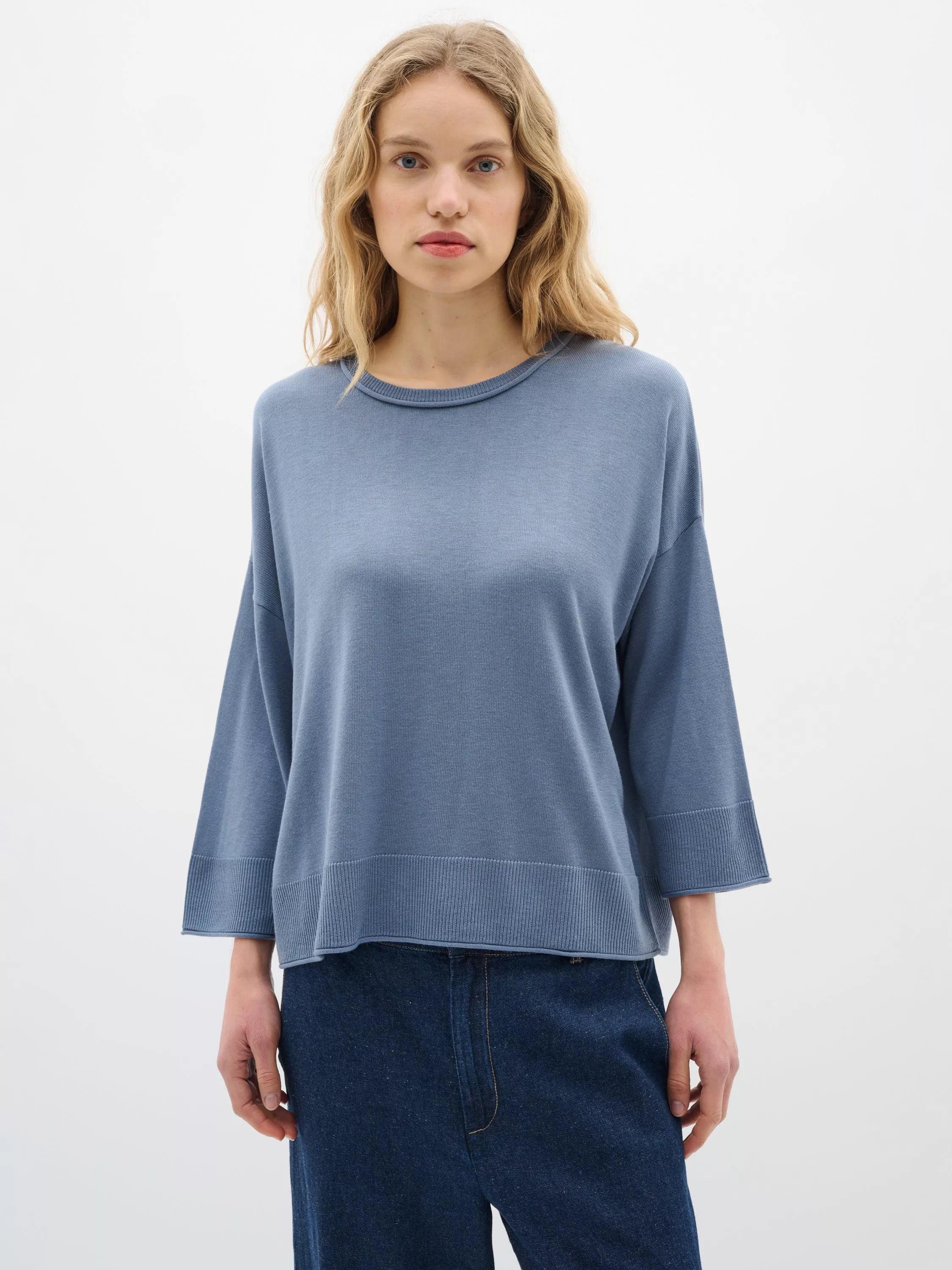 This Ilze soft knit sweater is designed for comfort and style with its relaxed fit and loose three-quarter length sleeves. The simple round neckline and lightweight material make it ideal for cooler evenings. Pair it with jeans for a casual look or layer over a dress for added coziness.