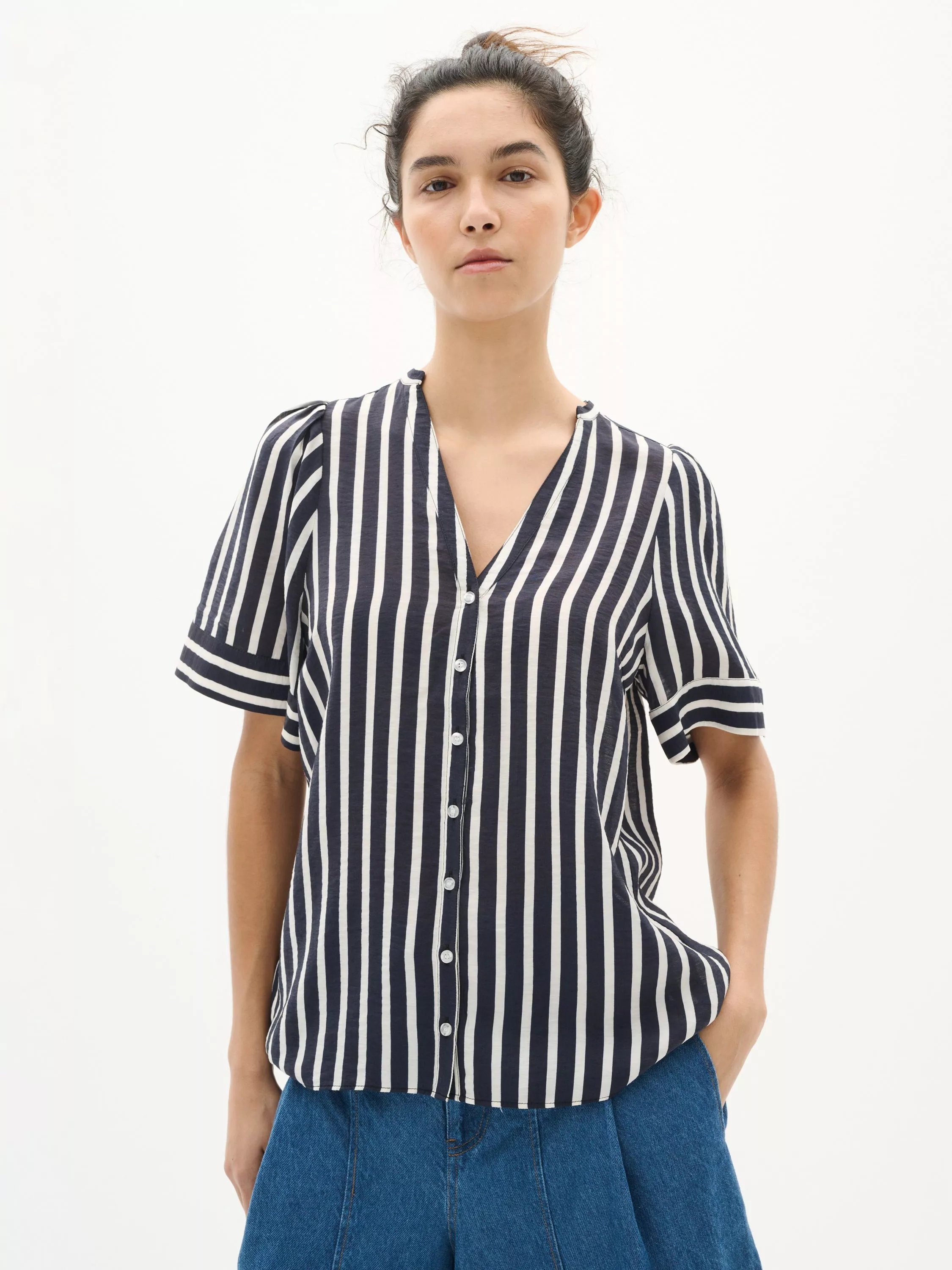 Discover elegance in every stripe with this chic blouse, perfect for both work and leisure.