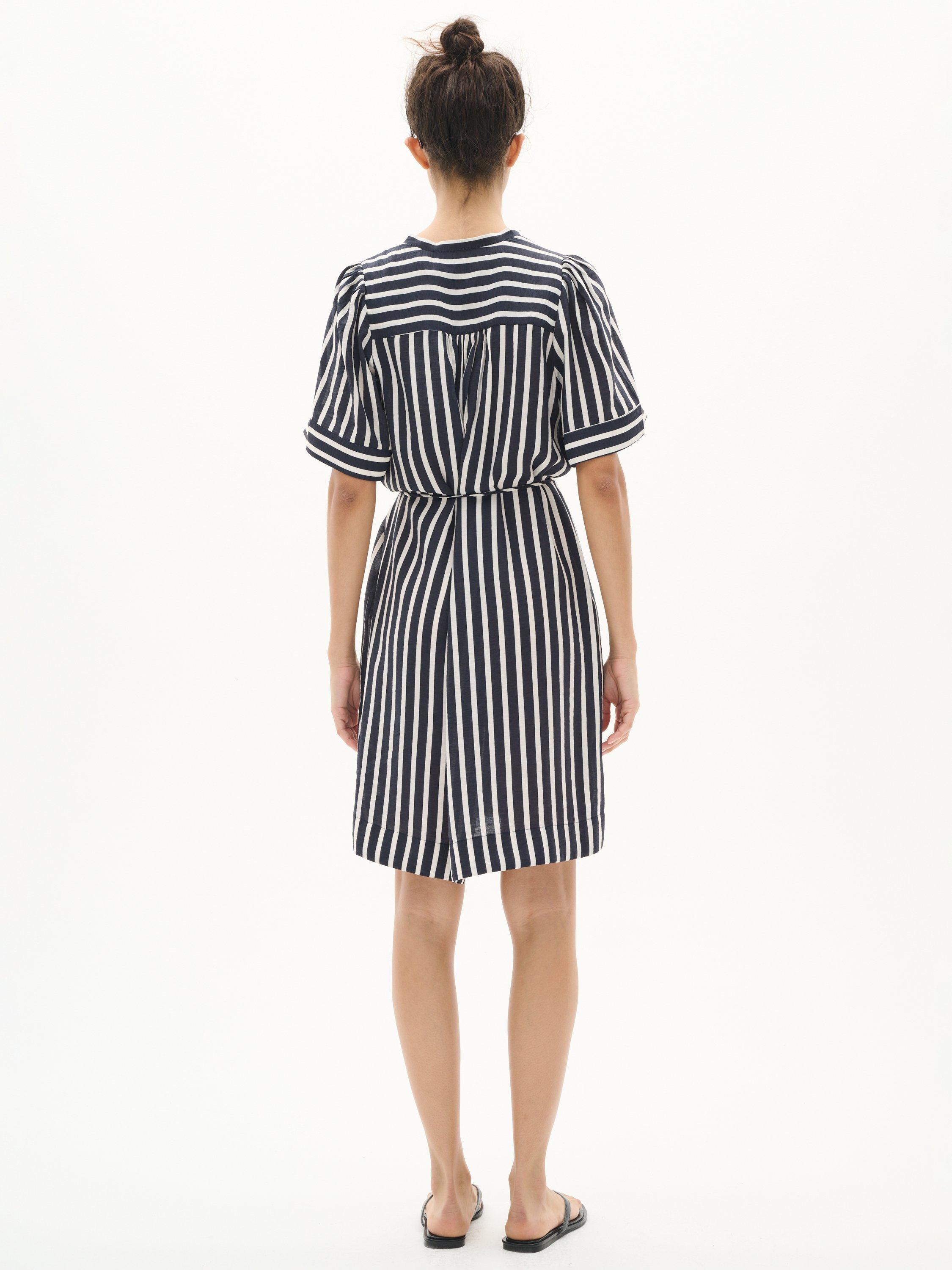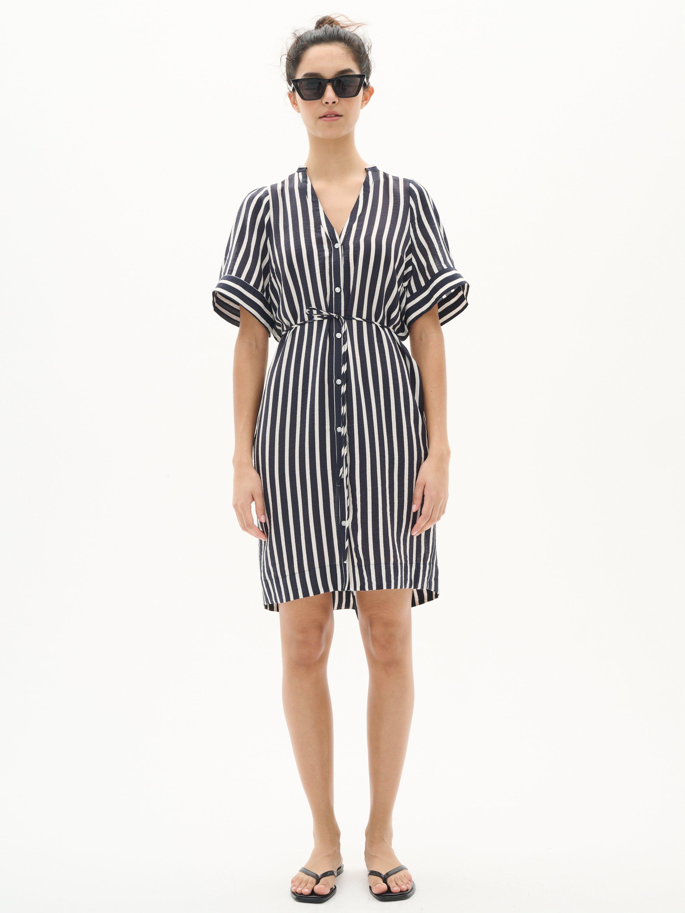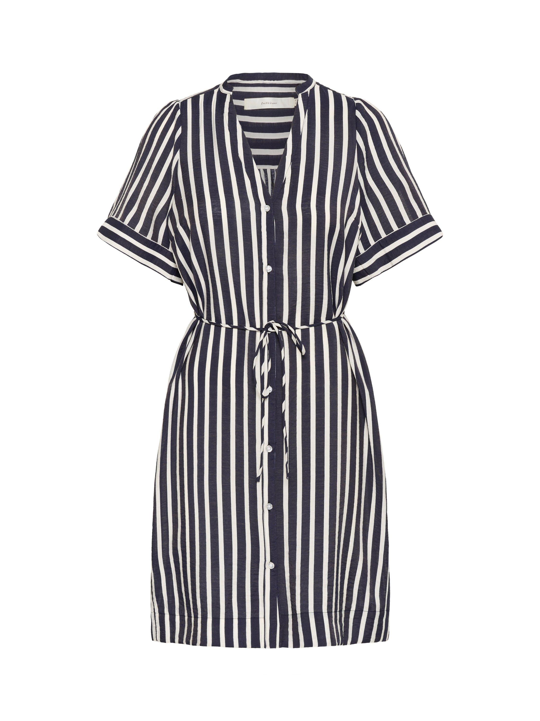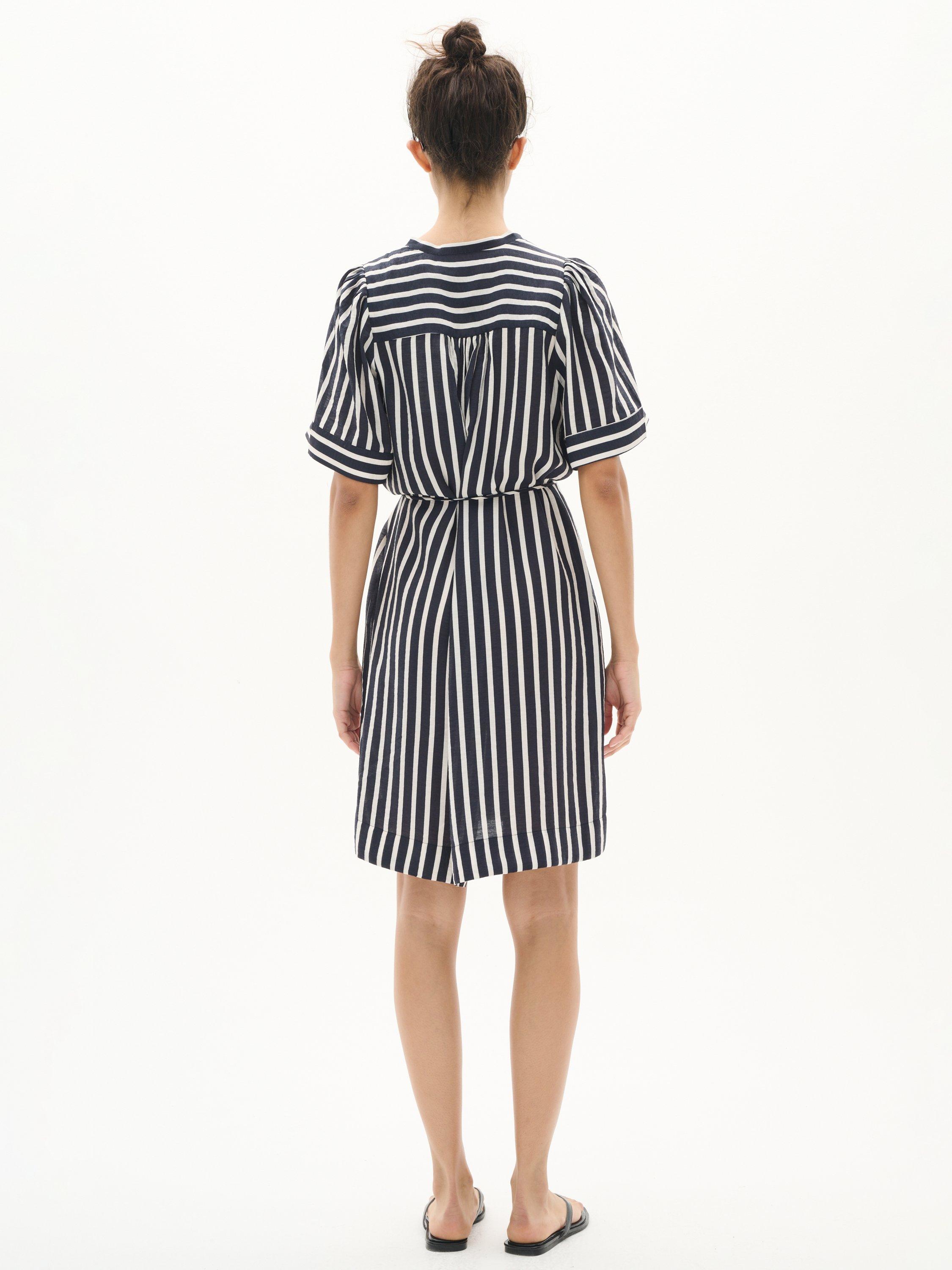 Introducing the KilloIW Dress: a chic mini dress in Marine Blue Stripe, perfect for day-to-night elegance. Dress features breathable woven fabric.