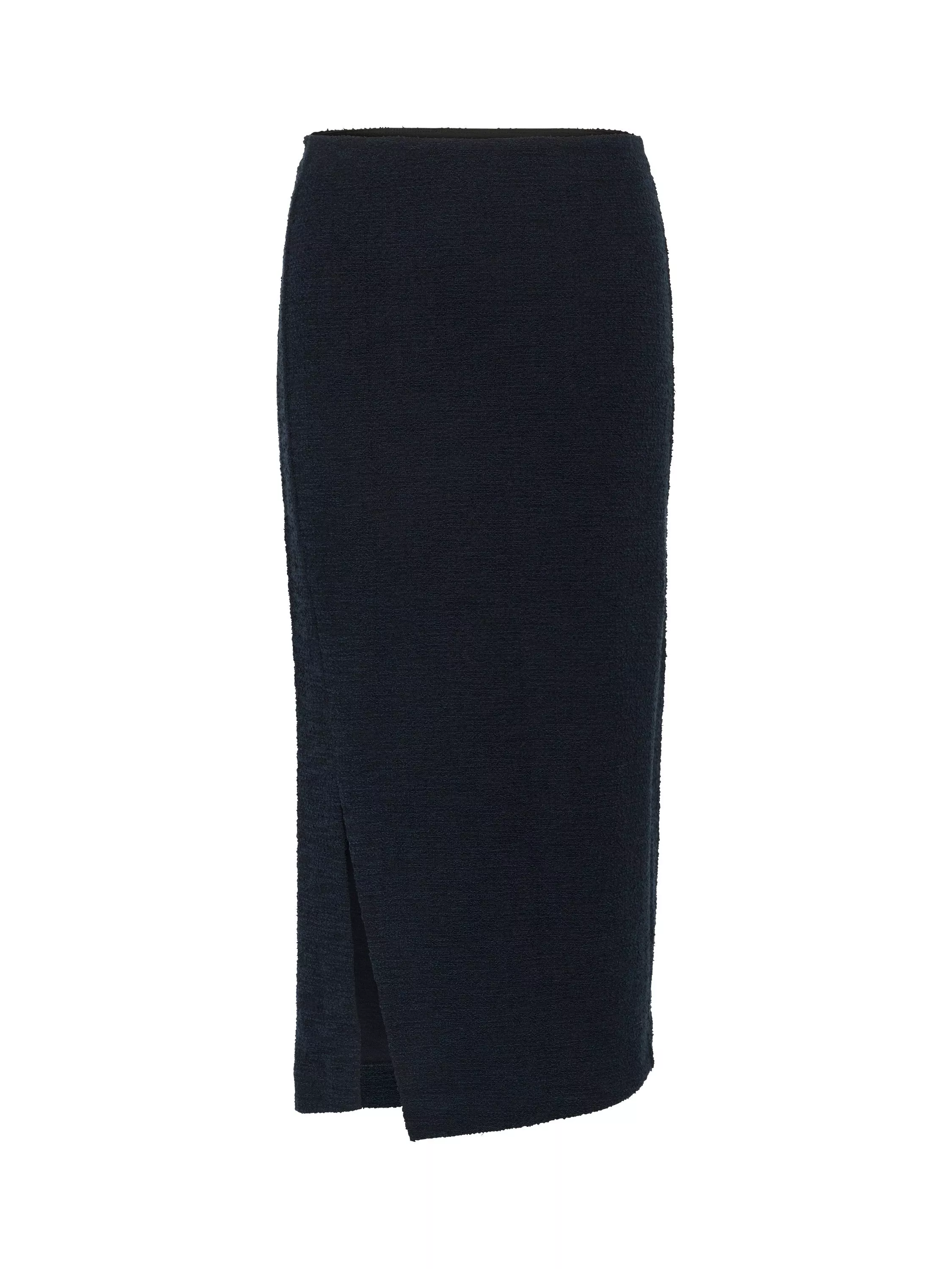 The Leema skirt is a timeless and comfortable style, that will make you look and feel great all day long. It is high-waisted and has a slim fit, and it is made in a soft, knitted fabric. It has a wrapover front that is fastened at the side seam, and it is cut at the mid-calves.