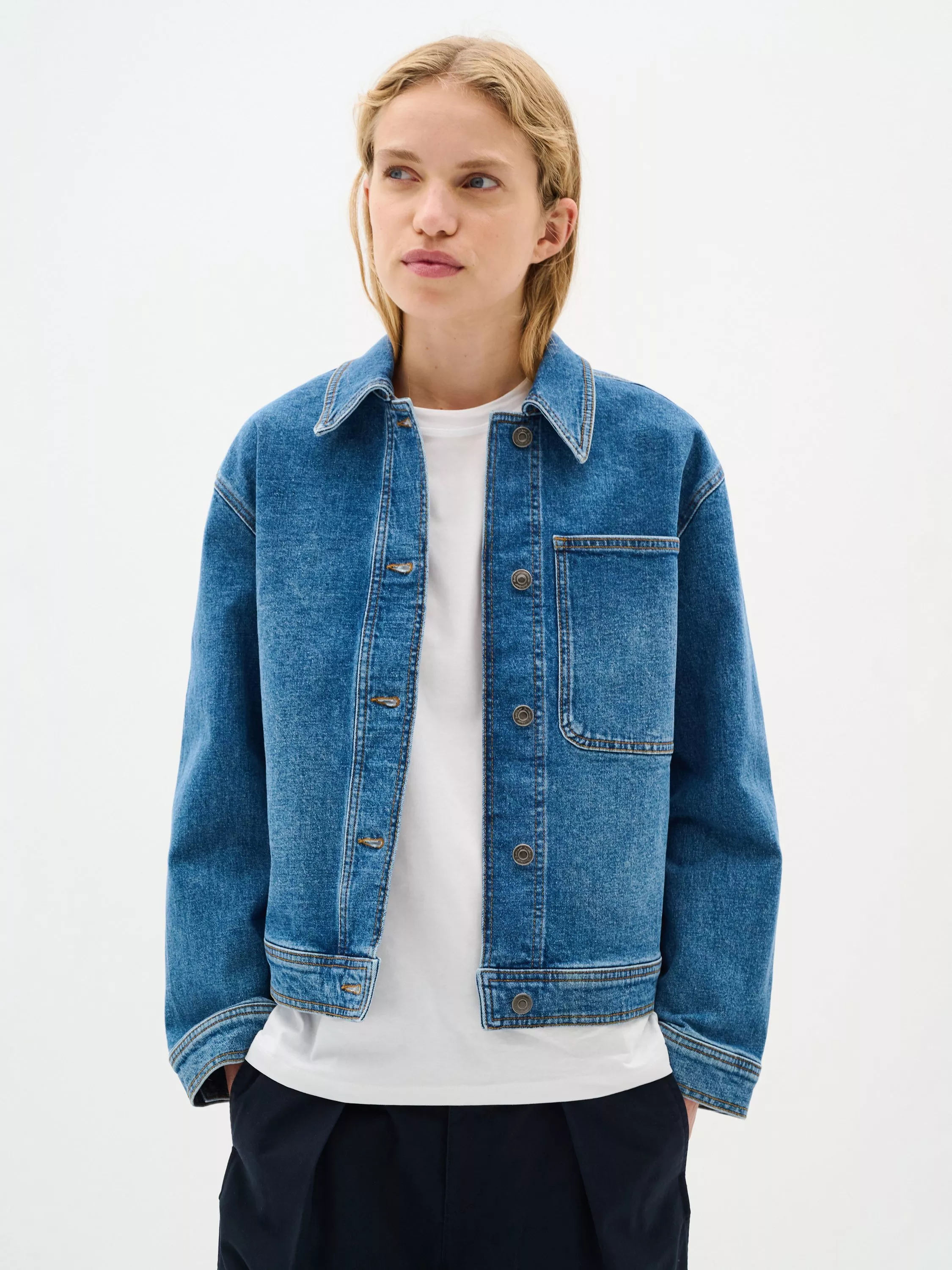 The Pheiffer jacket is a casual and cool denim jacket. It has a spread collar and button fastening, and it has a casual fit with a tapered waistband. The sleeves are long and straight with buttoned cuffs, and the jacket has a back yoke and a plain front with a large patch pocket on the left side chest.