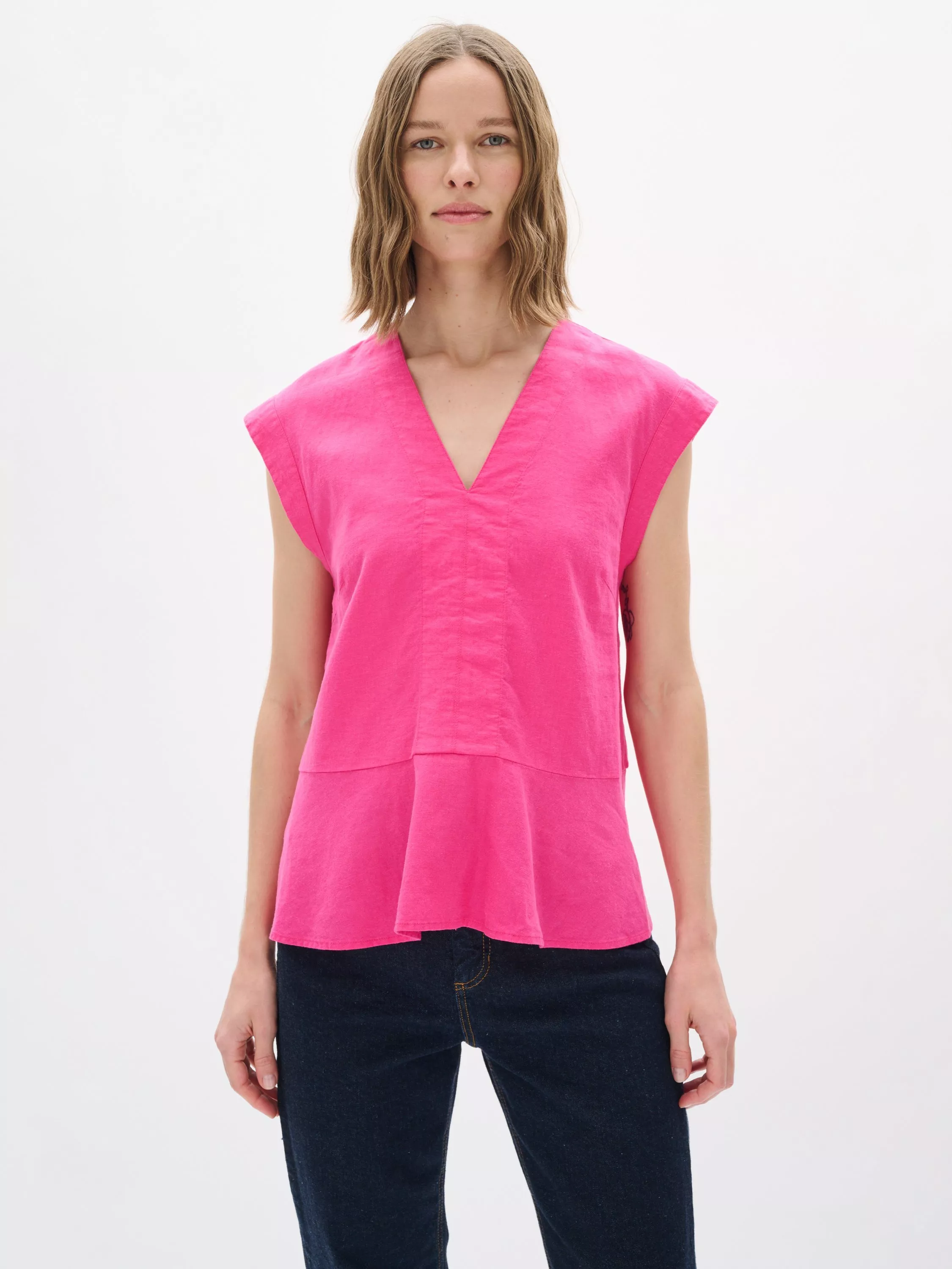 An essential addition to your wardrobe, this blouse from InWear is plain for easy mixing and matching. Framed with a v-neckline and a sleeveless design, the linen blend fabric gives it a breathable, airy quality and slips on well with tonal denim ready for the summer.