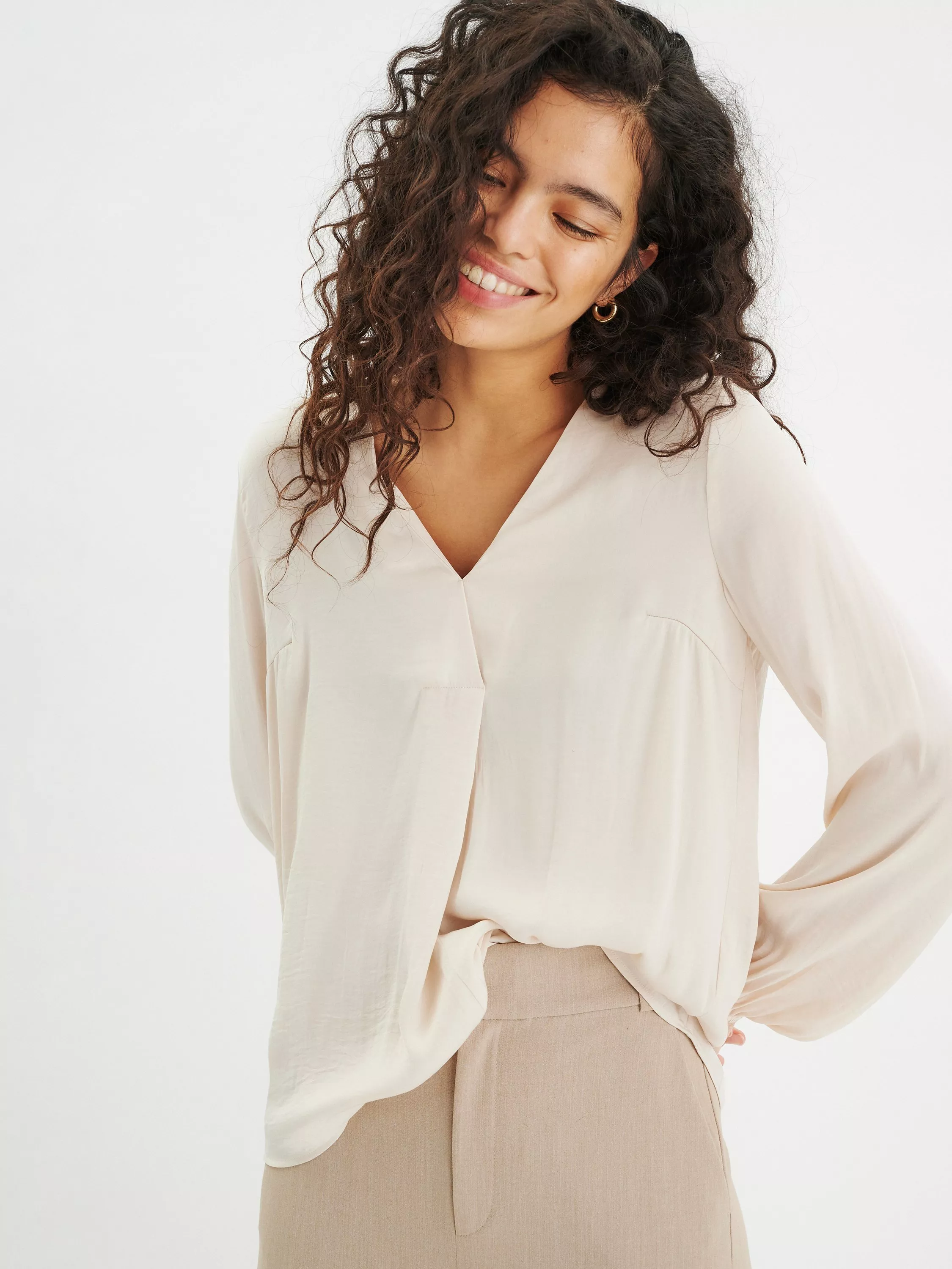 A classic blouse with a loose regular fit and a 3/4 length sleeve. The blouse has a V-shaped neckline.