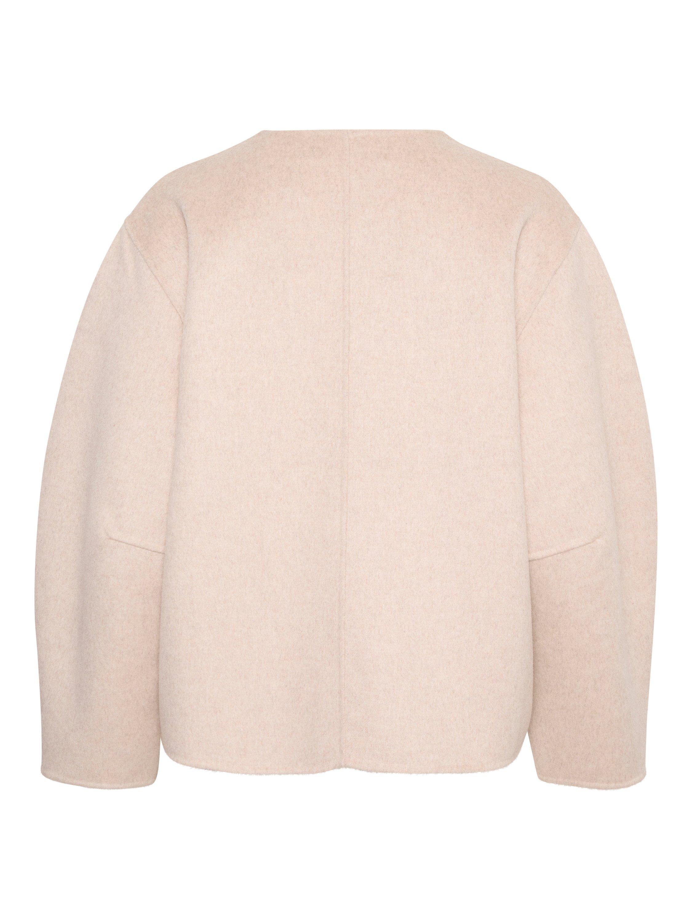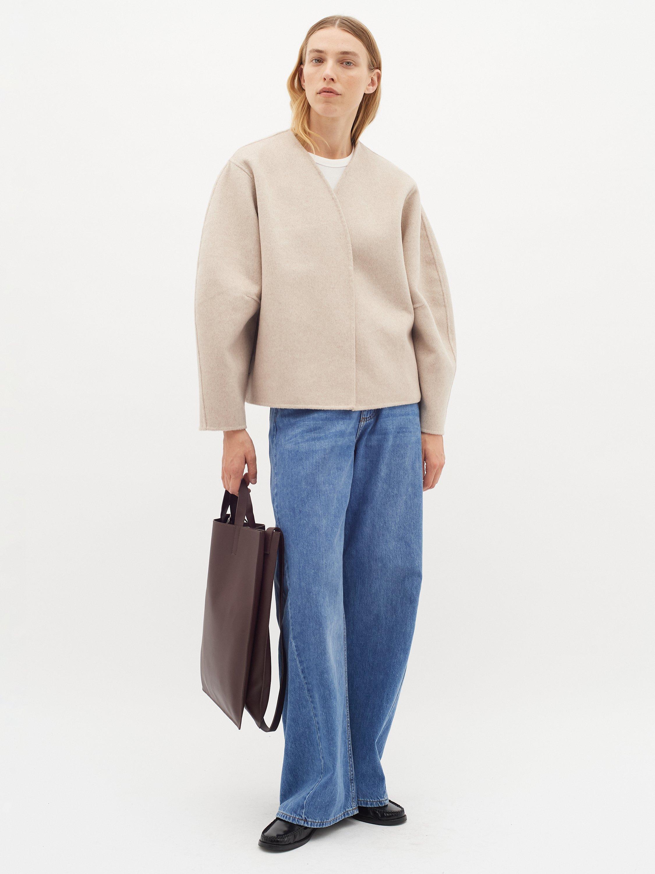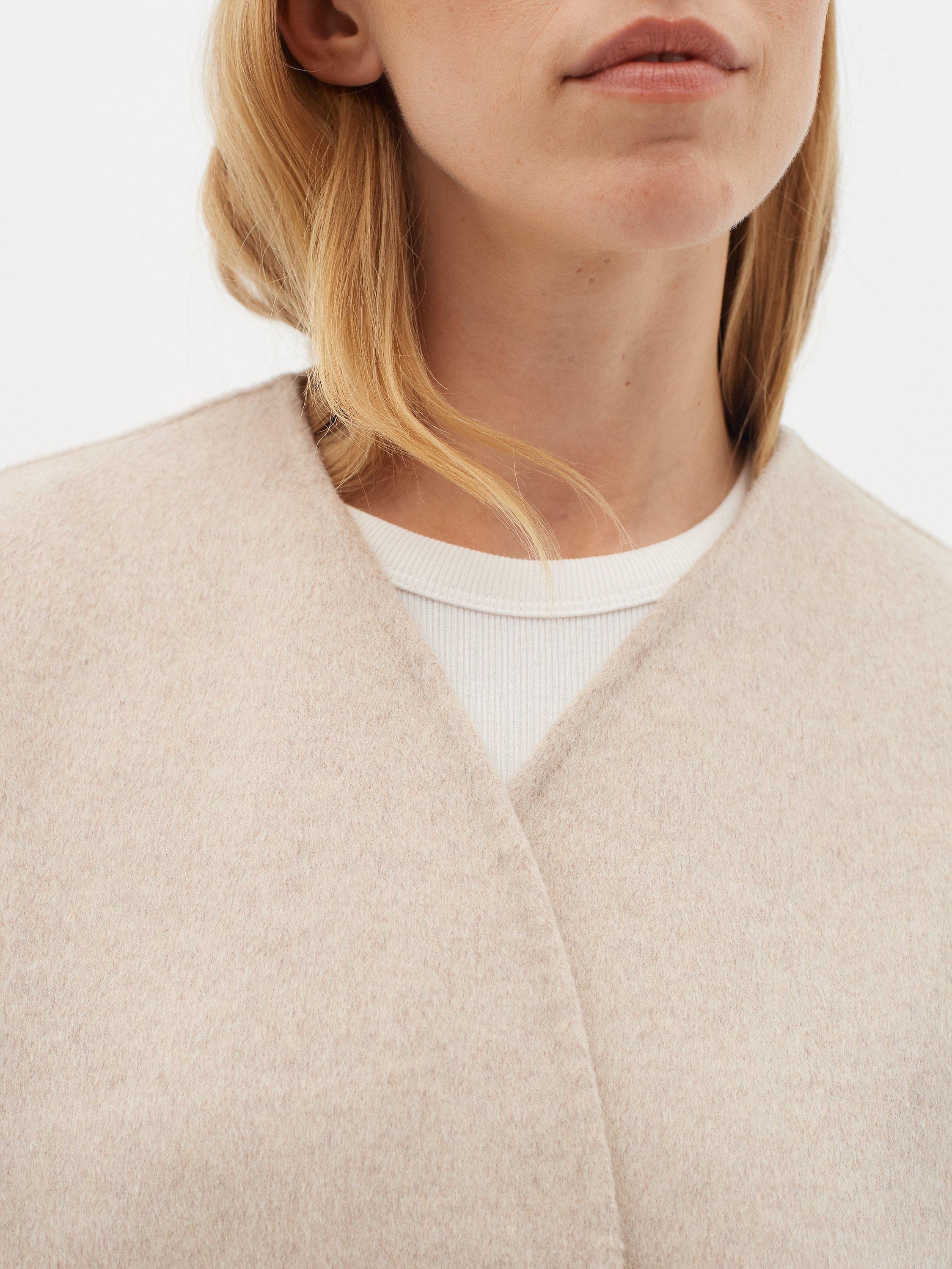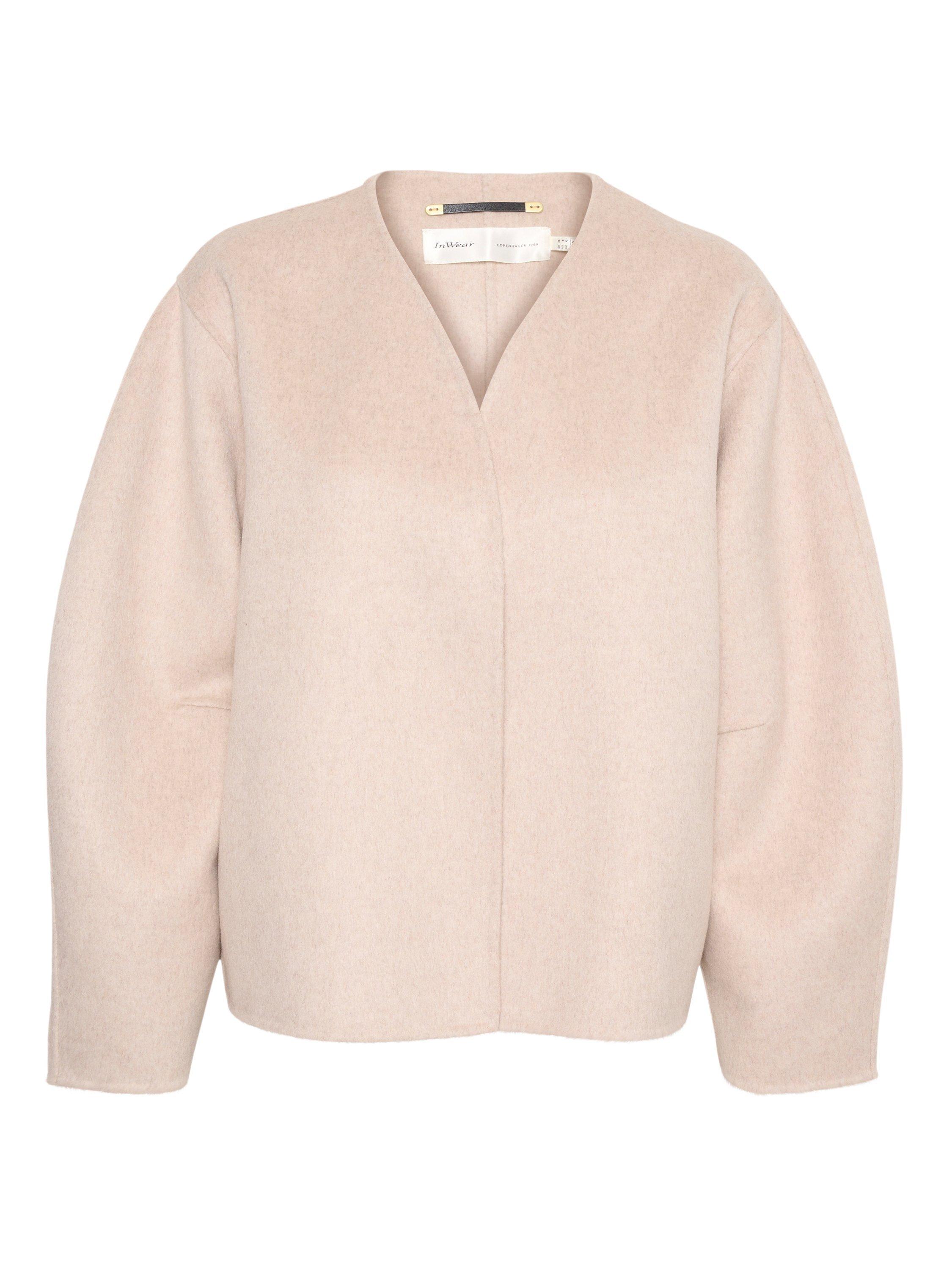 The Tilla jacket is a simple and feminine car coat with a soft silhouette. It has a V-neck and an open front, and it has a casual fit. The sleeves are long and voluminous with a round shape, and the jacket is cut at the hips.