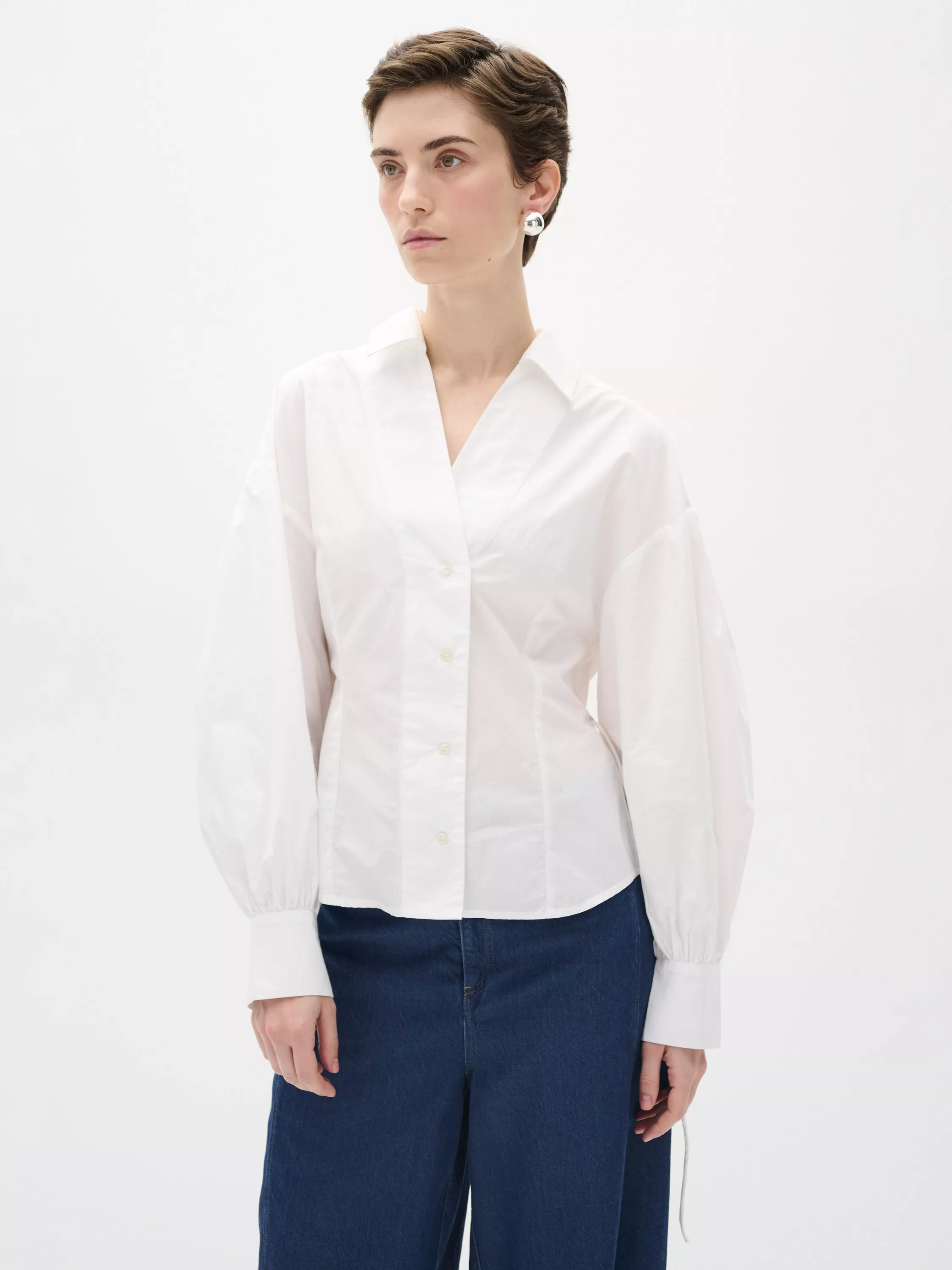 The ValleyIW shirt is a feminine alternative to the classic button-up shirt. It has a V-neck with a Johnny collar and button fastening, and it has a drawstring waist that is fastened at the front. The sleeves are long and voluminous with buttoned cuffs, and it has a back yoke with lots of soft pleats.