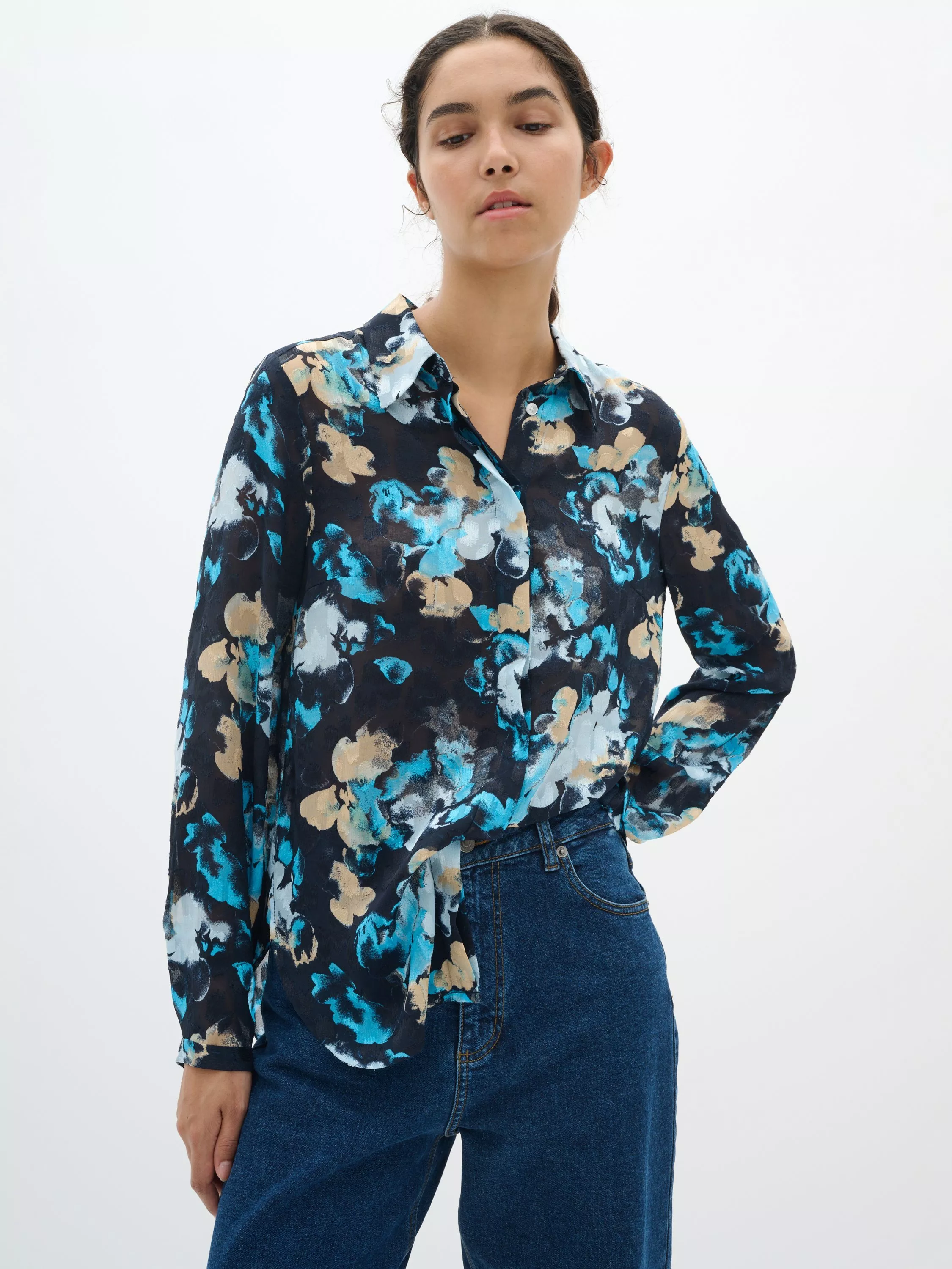 The Vielle shirt is a feminine version of the classic button-up shirt. It has a spread collar and button fastening, and it has a regular fit. The shirt is made in a beautiful print, and the sleeves are long with a loose fit and narrow, buttoned cuffs.