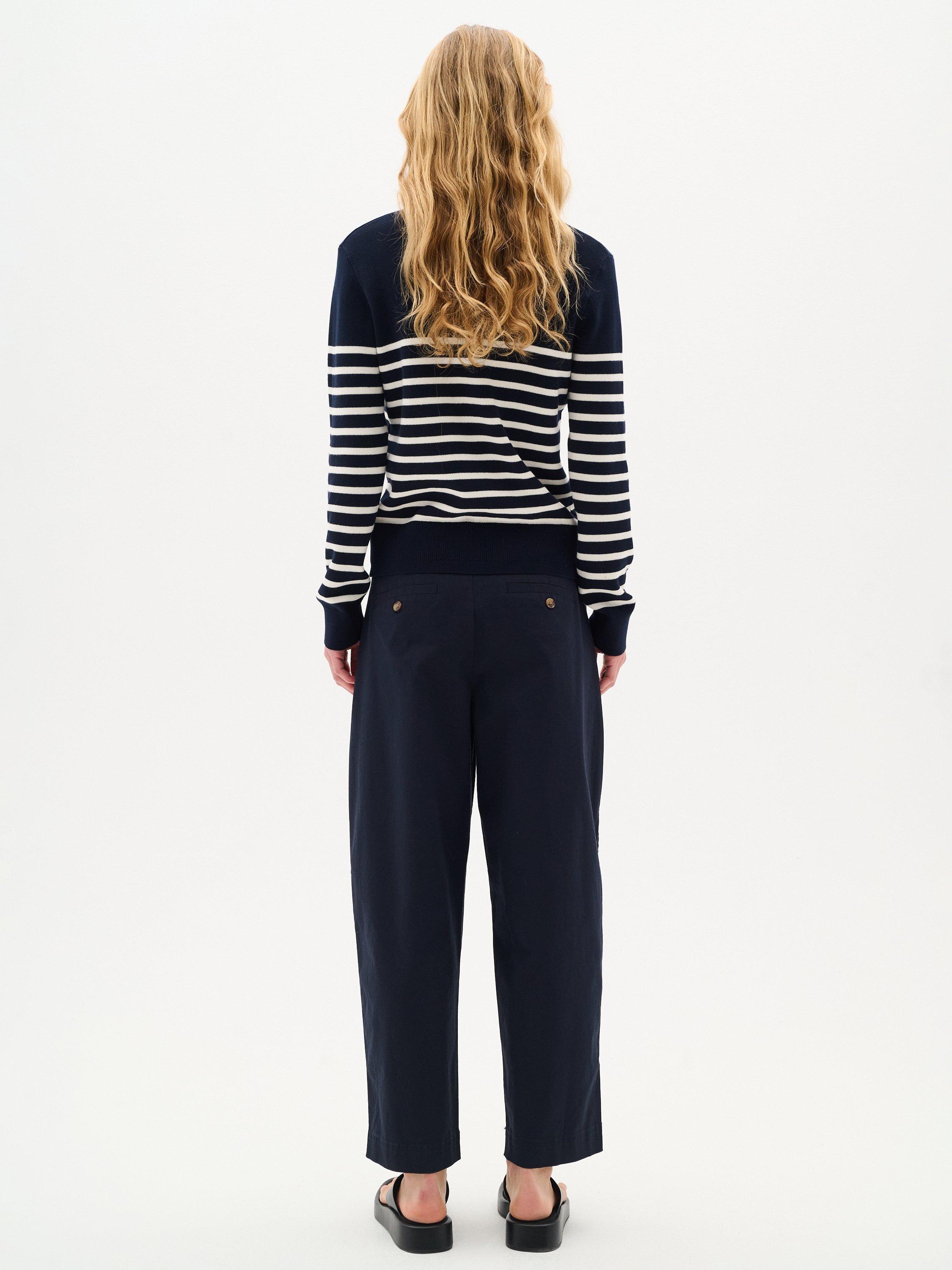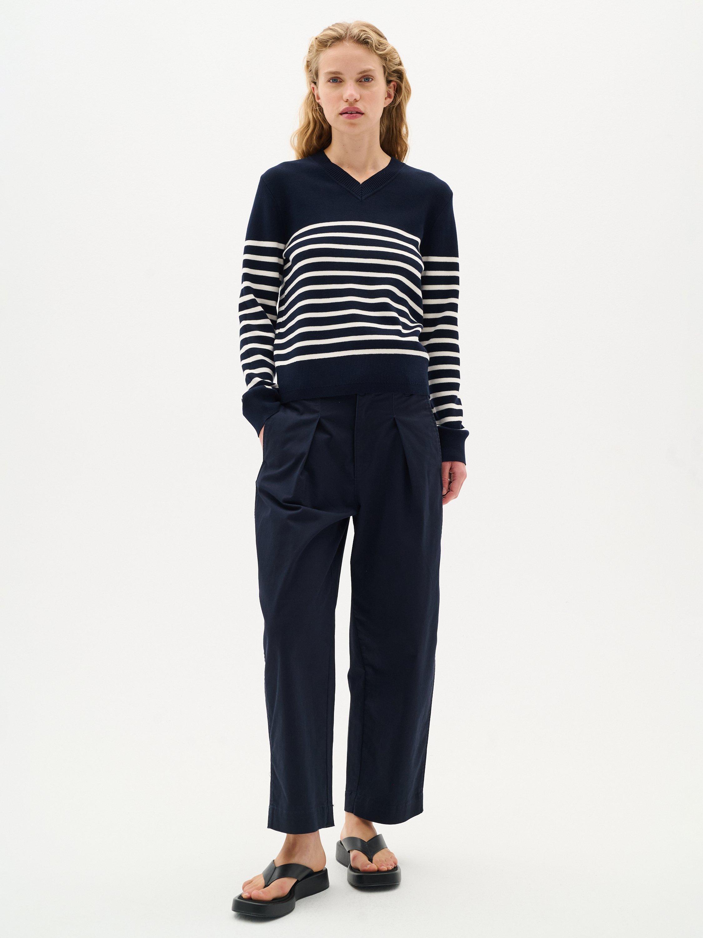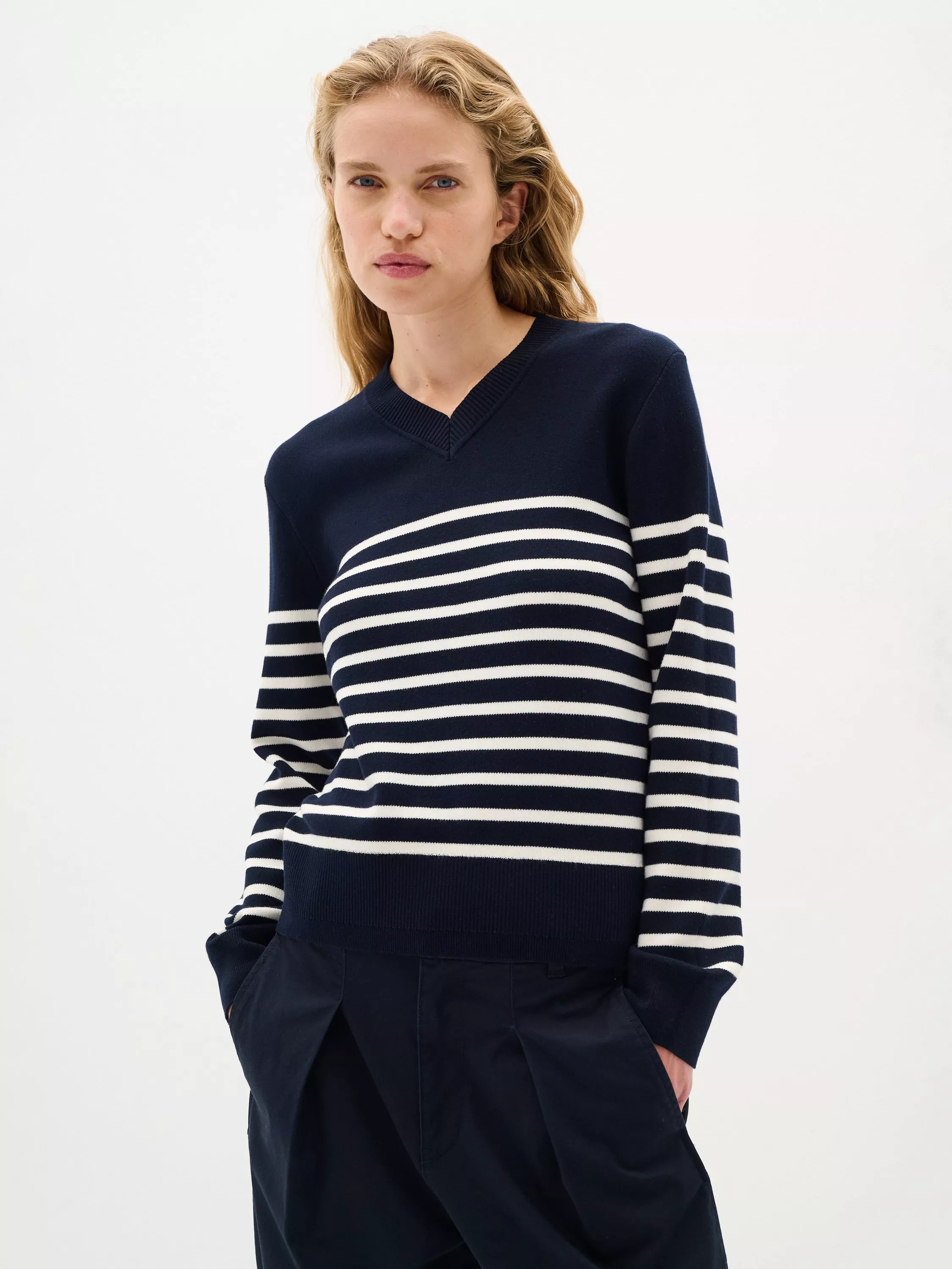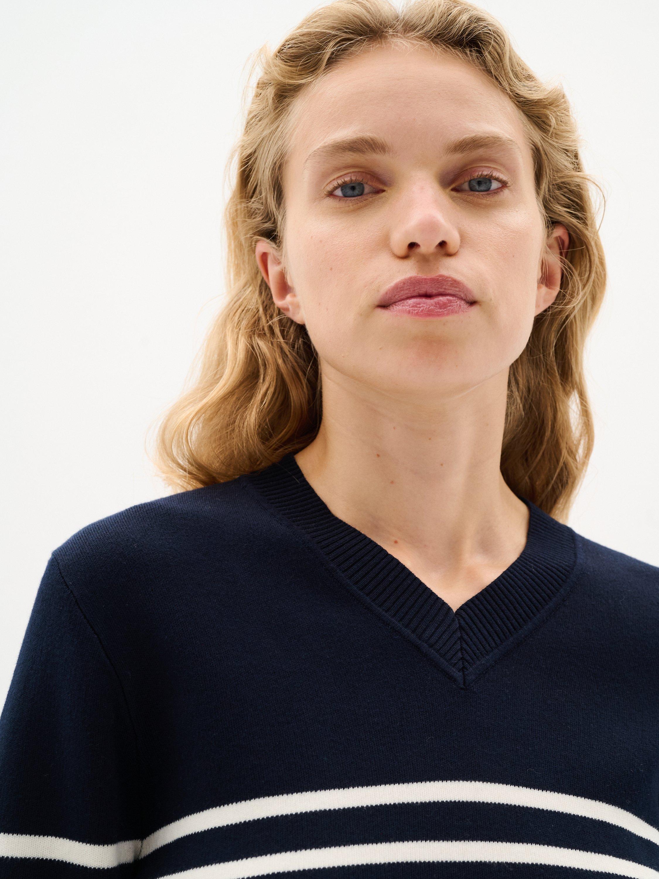 The Wallis pullover is a simple everyday style that will add a casual touch to any outfit. It has a V-neck and a regular fit, and it is made in a soft cotton knit. The sleeves are long with a tapered fit, and the pullover is cut at the hips.