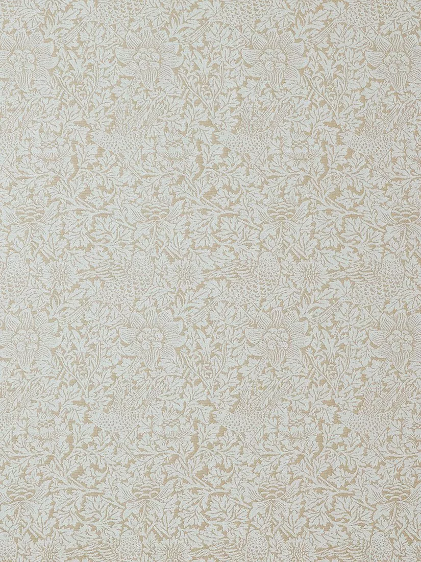 Iris was originally created in 1887 as a wallpaper design and features a lively arrangement of marigolds, iris flowers and small birds woven among hawthorn branches. Printed on cotton, this design beautifully evokes the vibrant blooms of an English country garden.