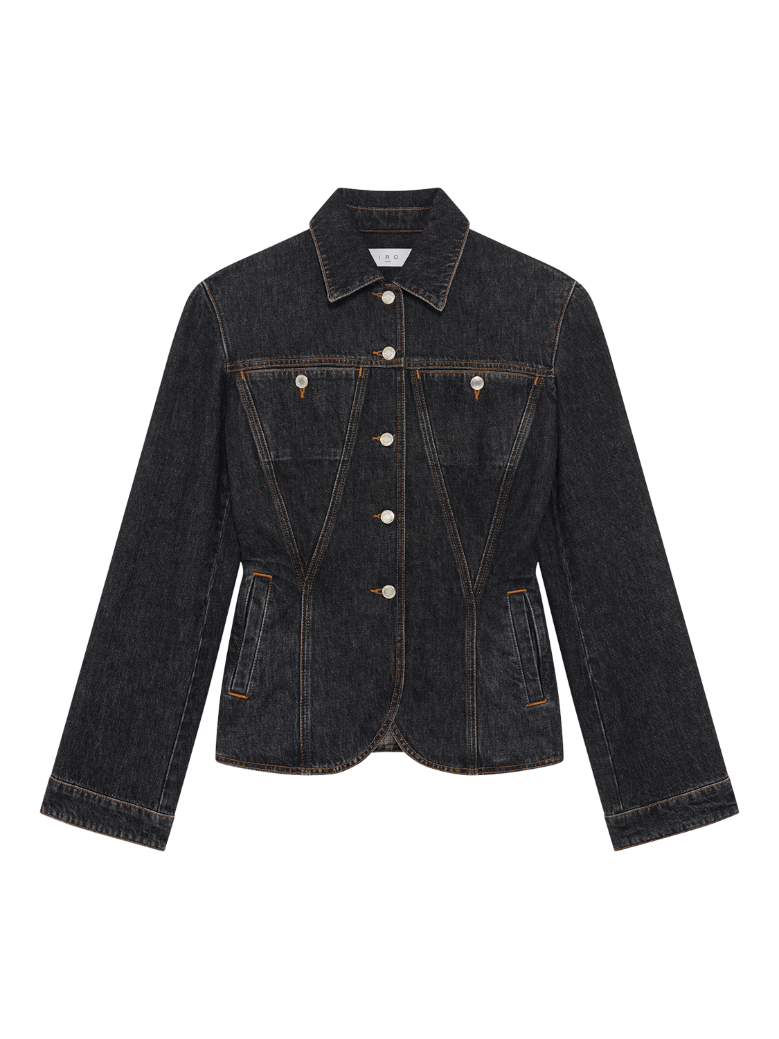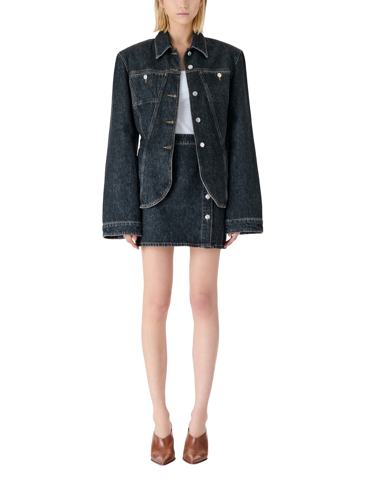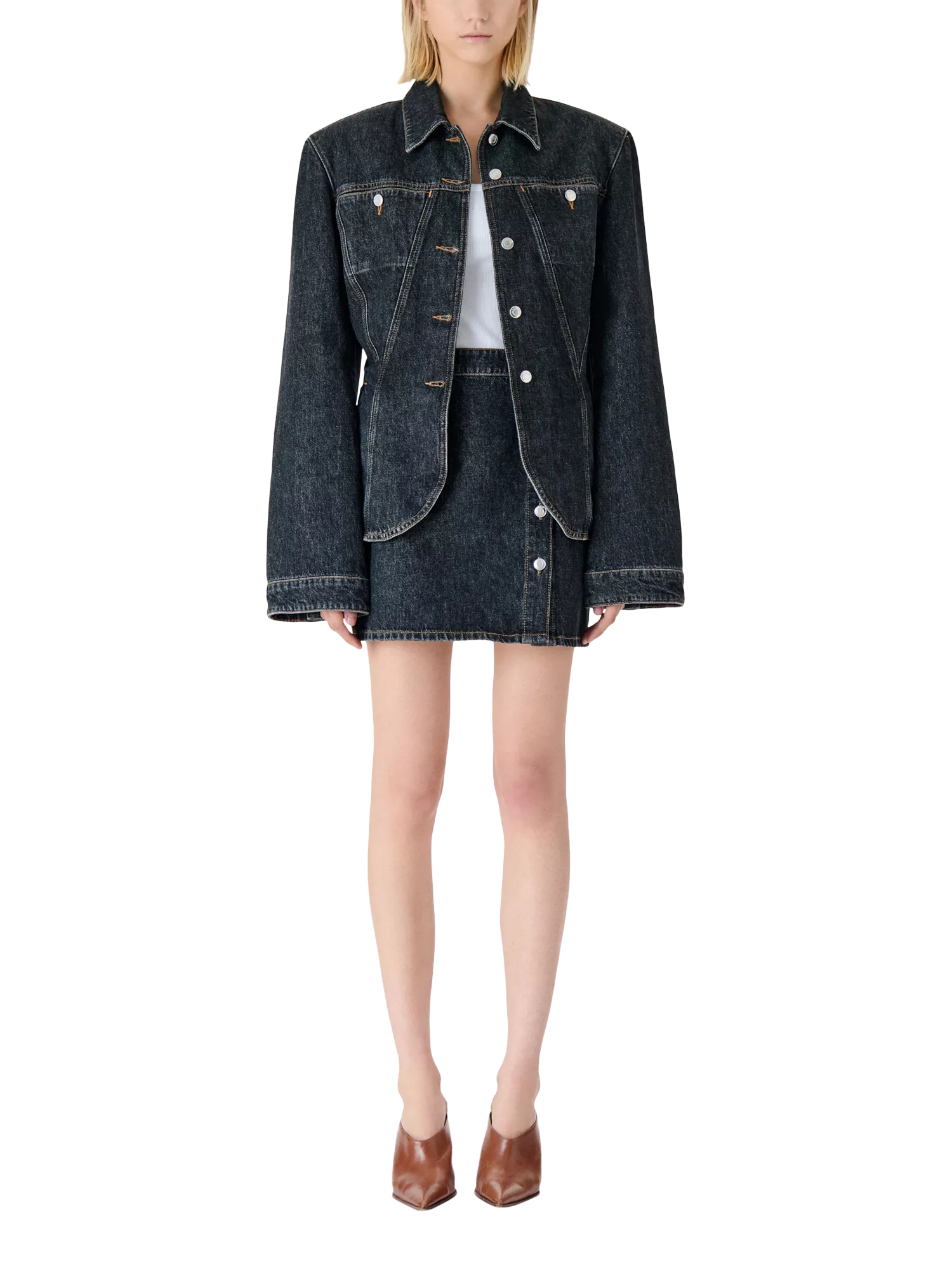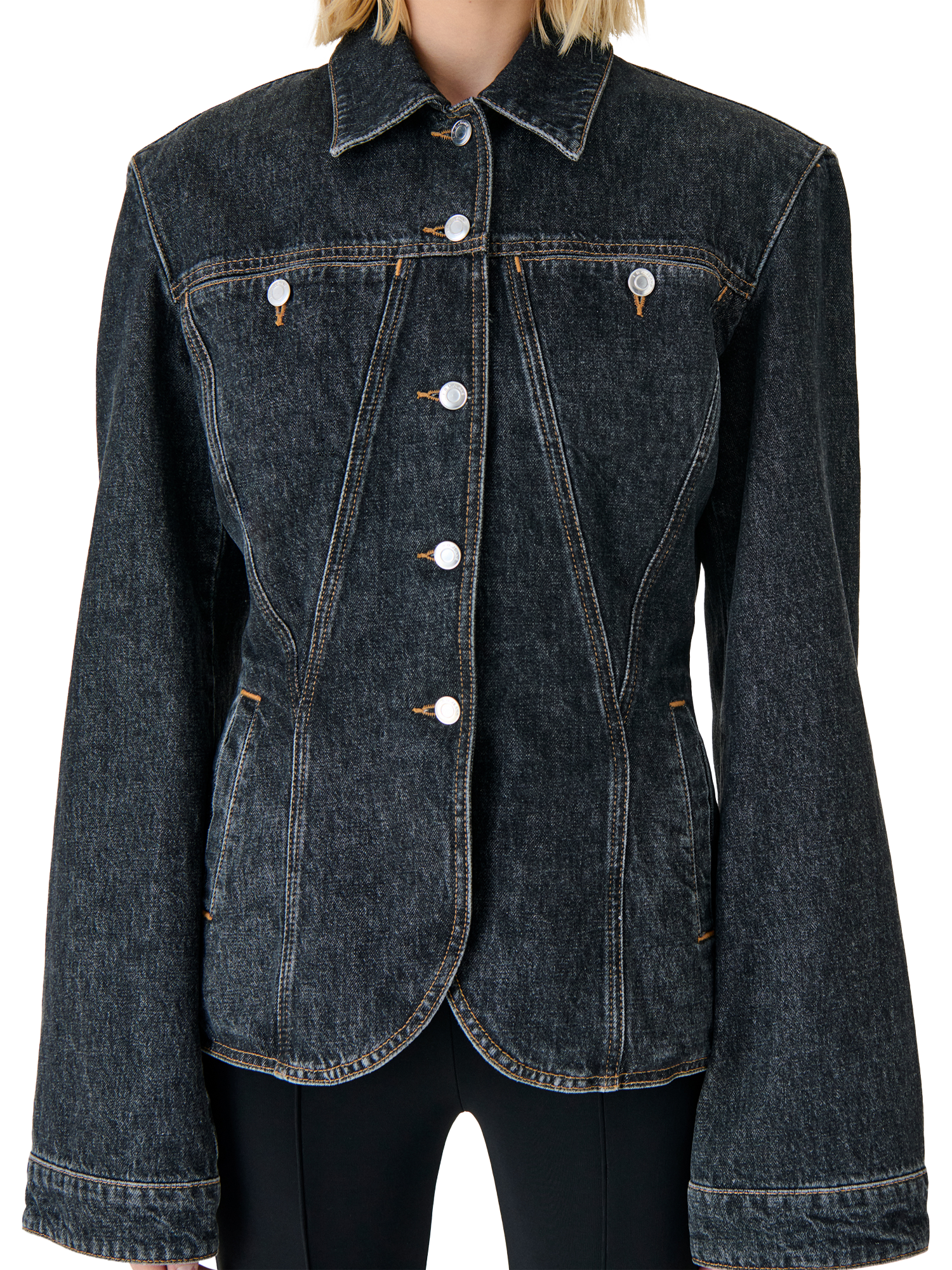 Oversized sleeves and stitched detailing add a modern edge to this denim jacket. Completed with a collar, pockets and a rounded hem opening.