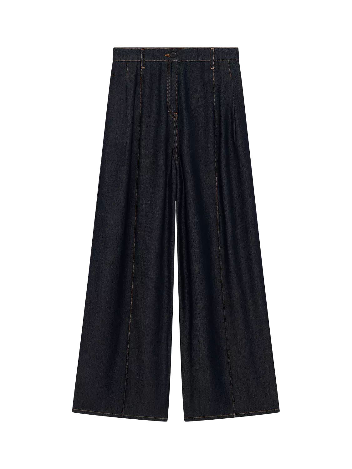 Wide-leg denim jeans with belt loops, a single button and zip-fly fastening, and contrasting stitch detailing down the front of the leg