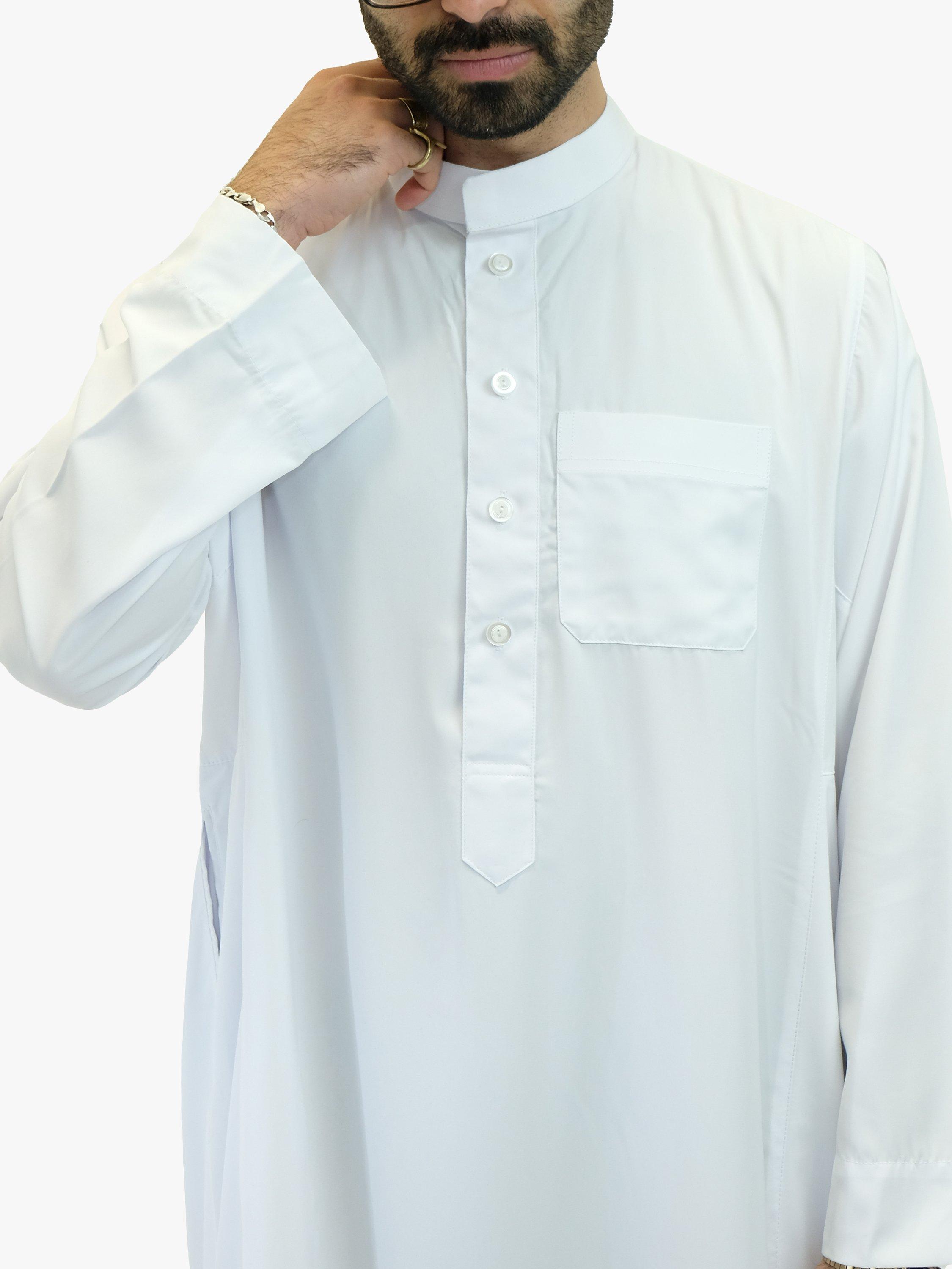 The Islamic Impressions full-length robe is commonly known as a thobe or jubbah depending on the region in the Middle East. This collared Thobe has a round collar often worn in Qatar, Kuwait or Saudi Arabia. Worn at faith events, social gatherings or as loungewear.