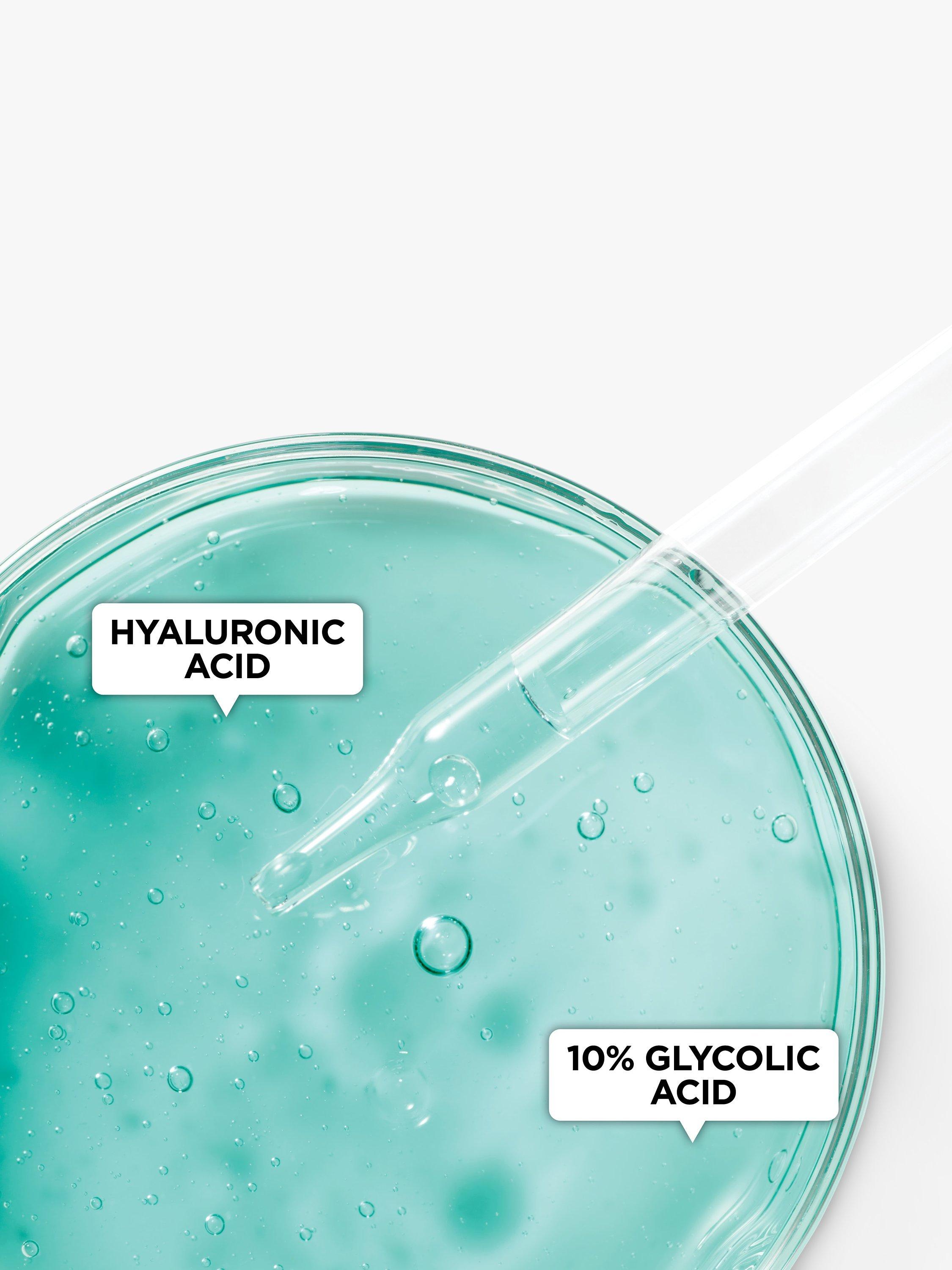 - Formulated with 10% glycolic acid, plus hyaluronic acid