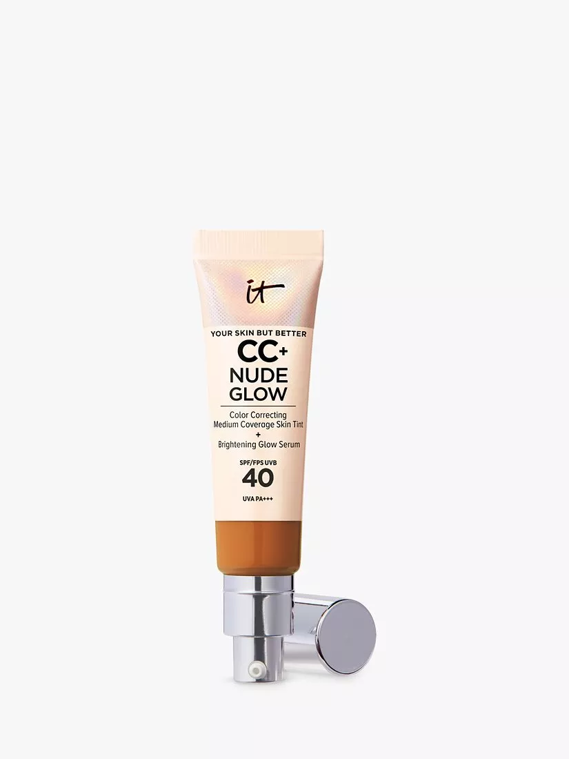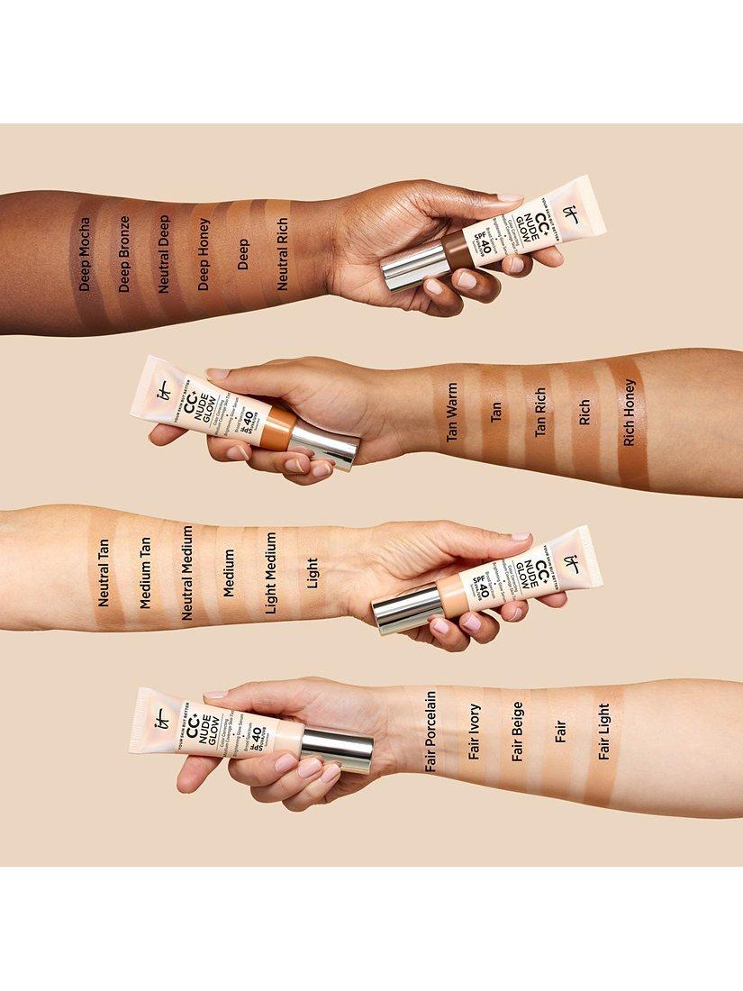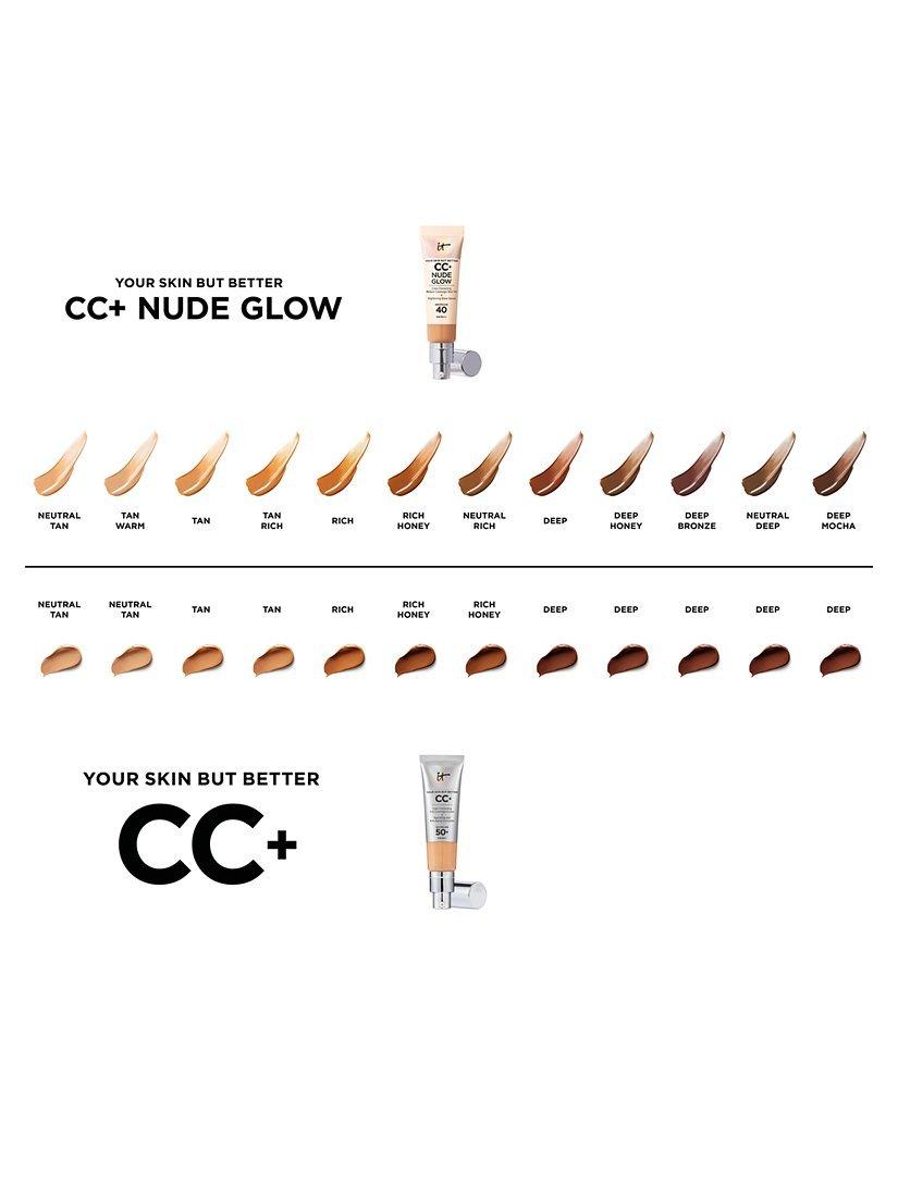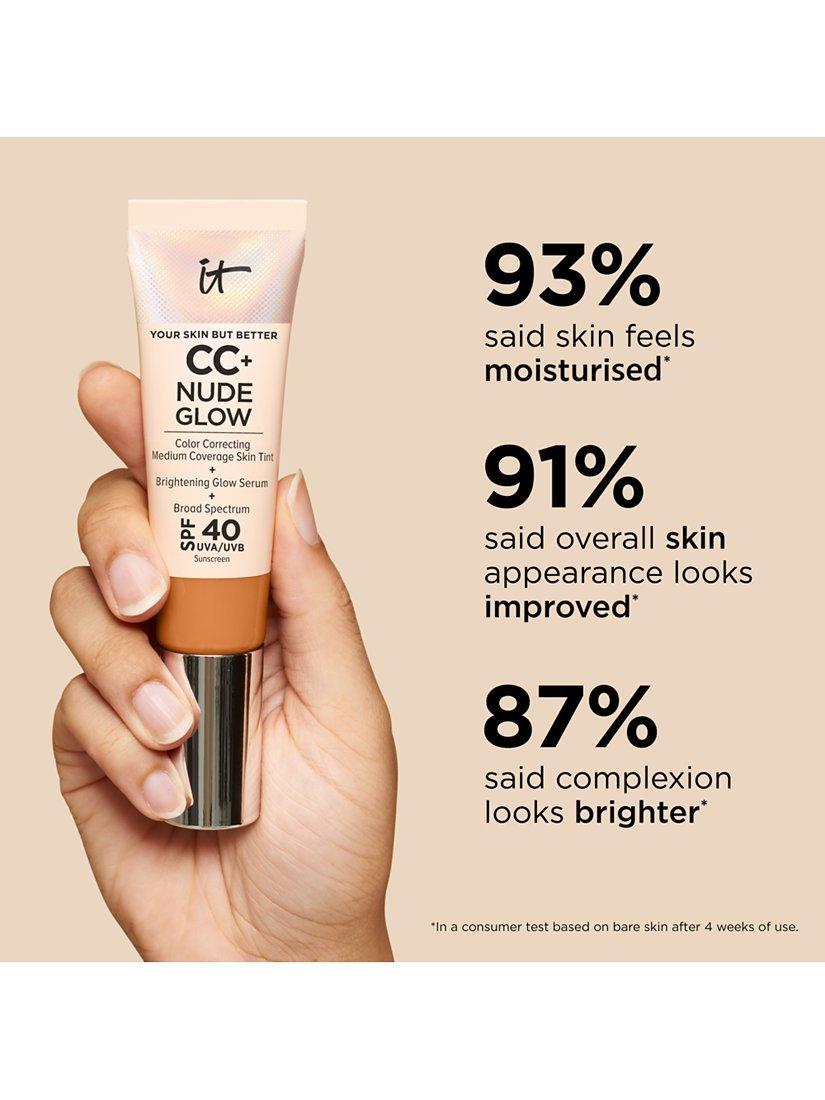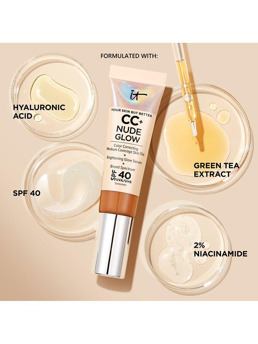 Discover IT® Get glowing with brighter, hydrated skin instantly and over time with CC+ Nude Glow SPF 40 - a lightweight medium coverage skin tint with a healthy glow finish in your shade of nude. Featuring 90% skincare, our patent-pending formula is infused with a Brightening Glow Skincare base with 2% niacinamide, hyaluronic acid, green tea extract and SPF 40.