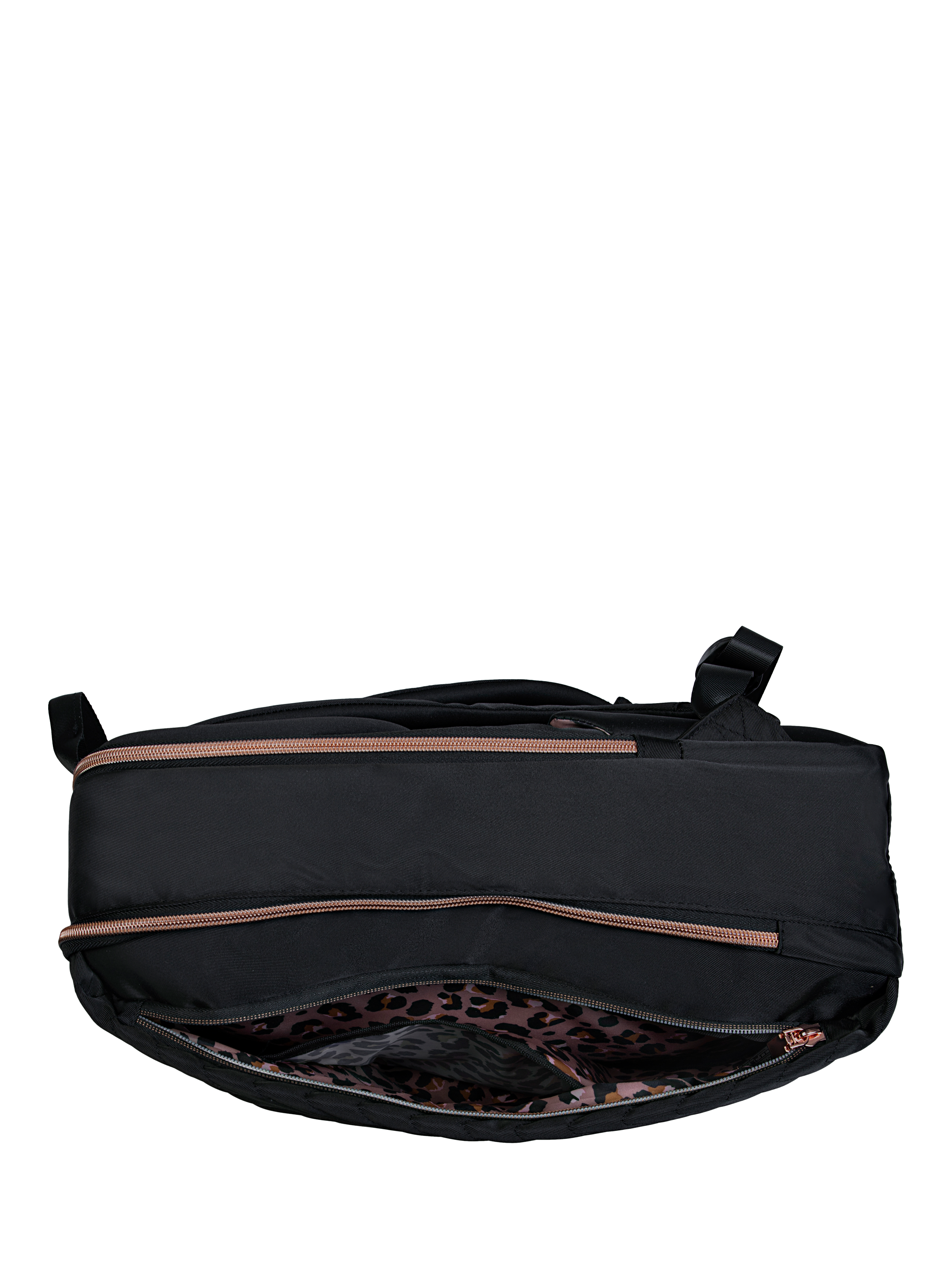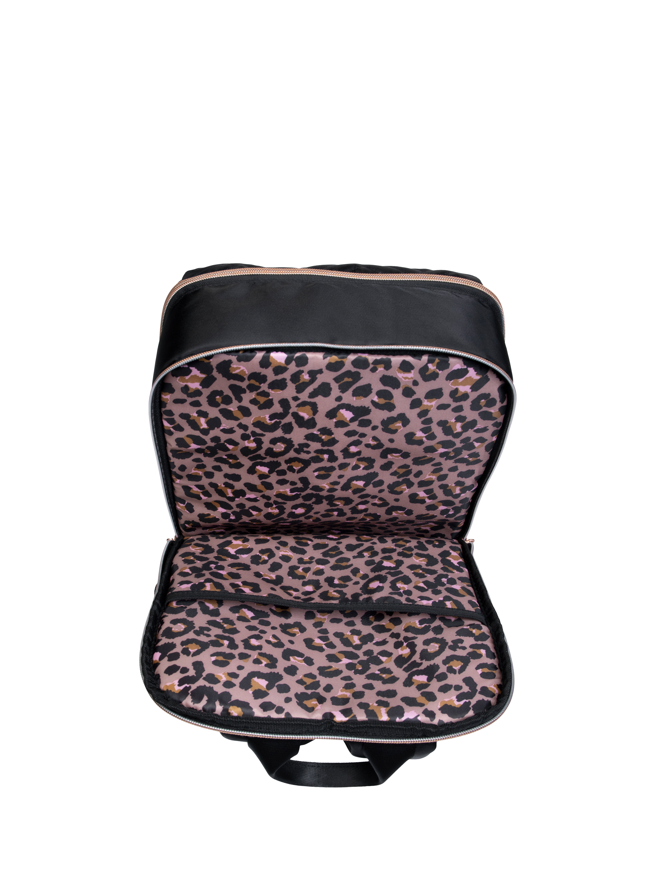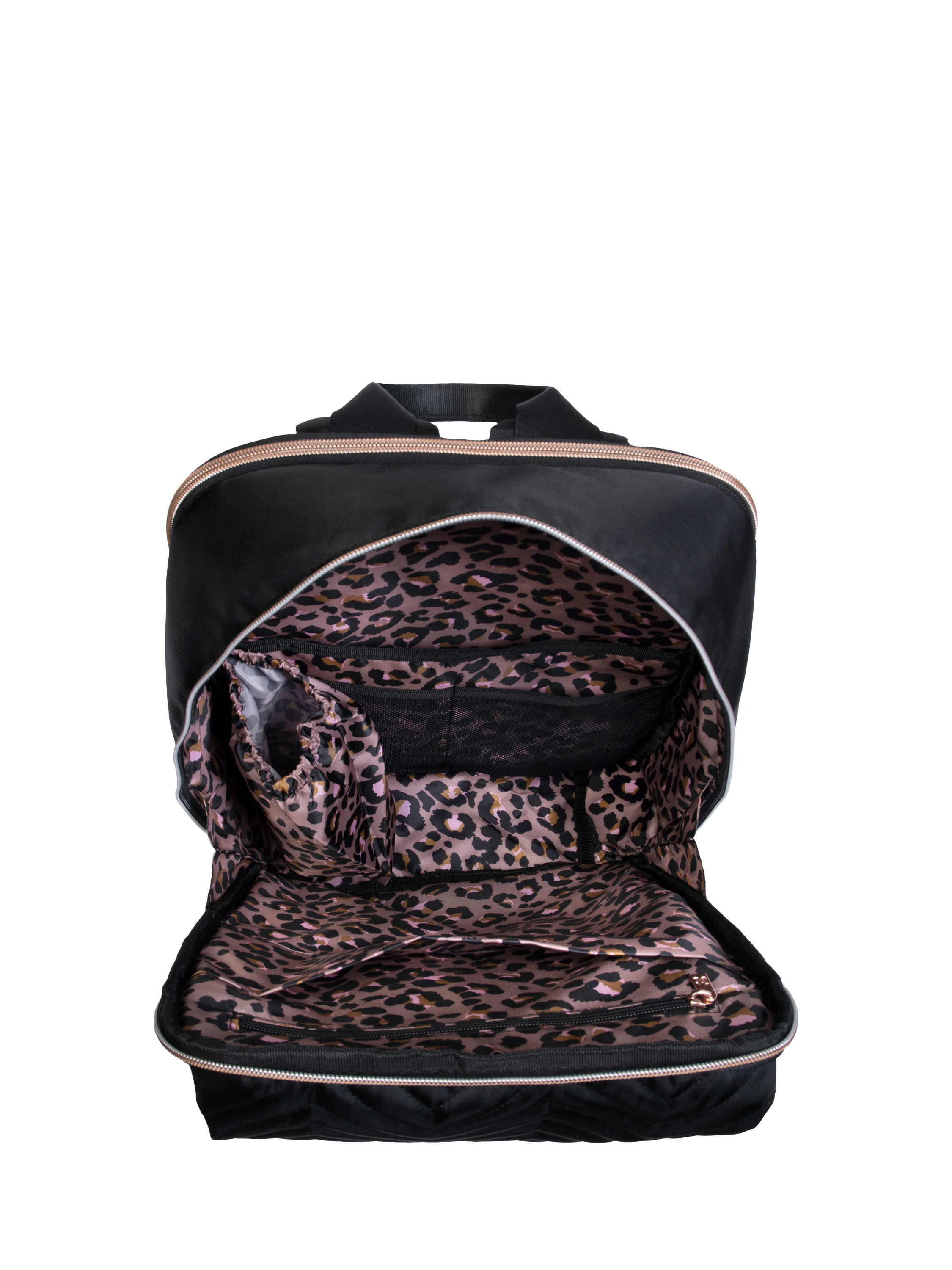 It's part of the stunning Bewitching suitcase collection, so you can complete your travel ensemble with matching flair. Featuring a chic chevron quilted front panel, rose gold detailing, and luxe hardware, the Bewitching Backpack gives you that designer vibe without the designer price tag. Inside, a bold leopard-print lining adds a fun pop of personality.