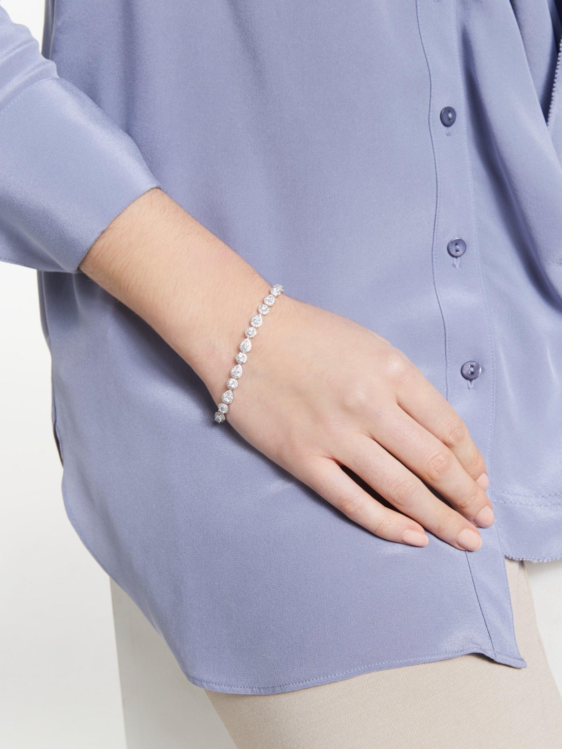 With subtly-shaped teardrop elements, the bracelet arranges them in a single row with sparkling faceted crystals. The folding clasp is designed for a peace of mind and secure wear.