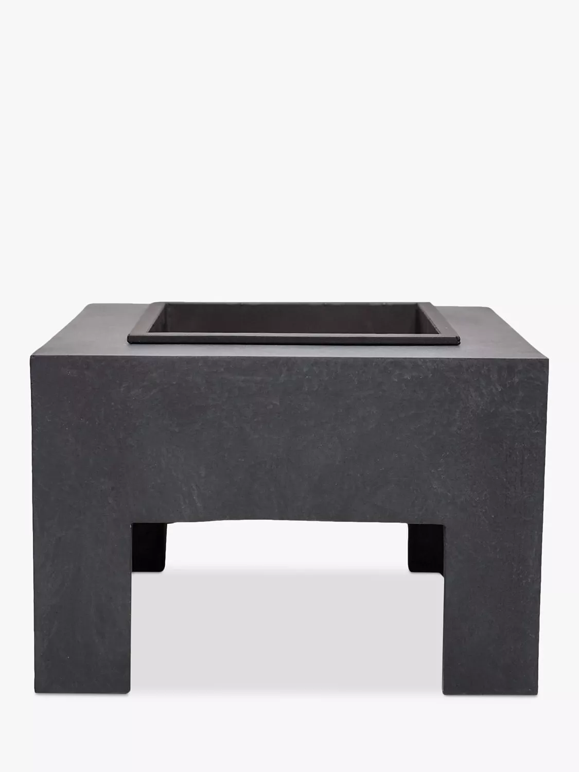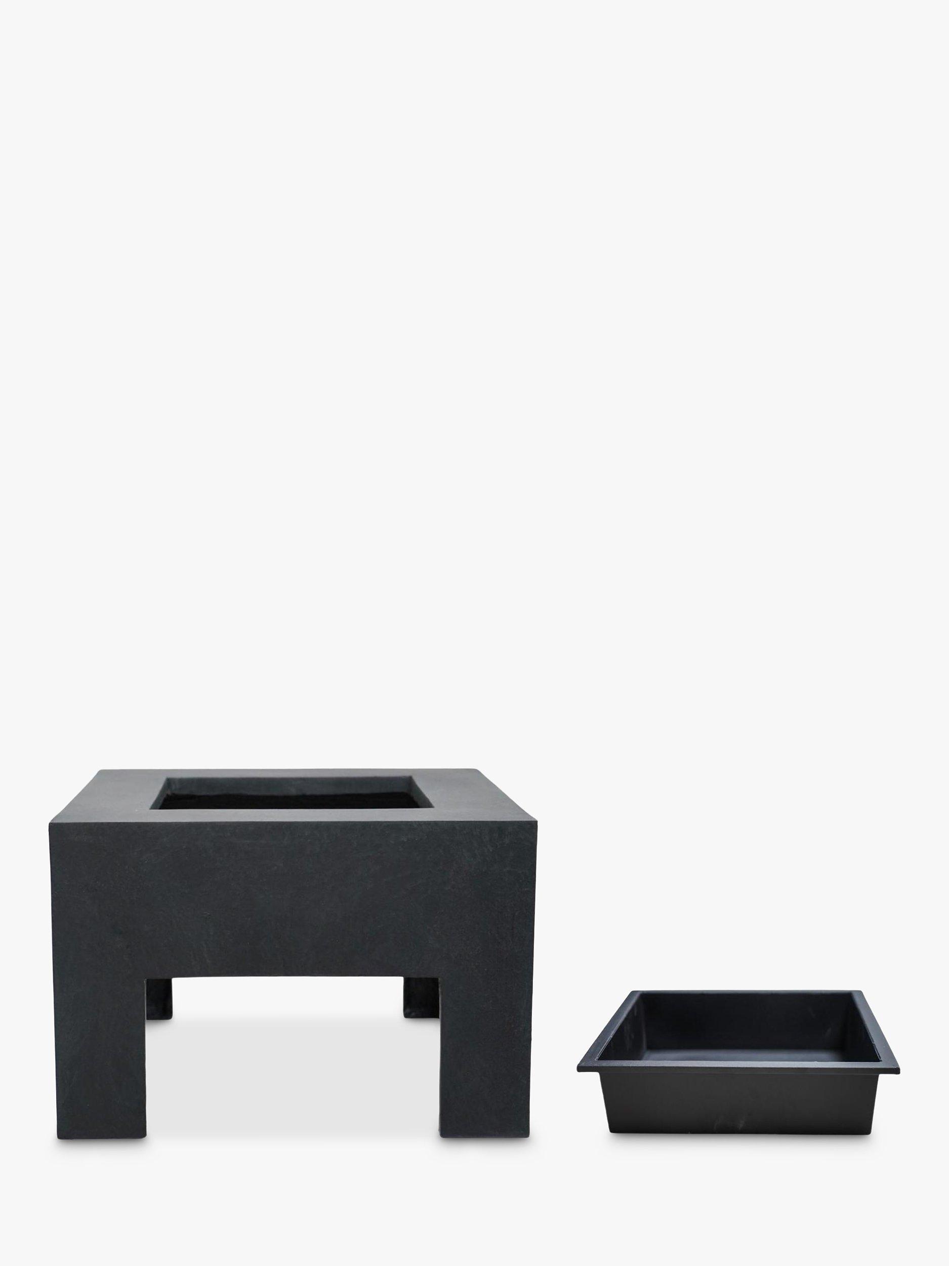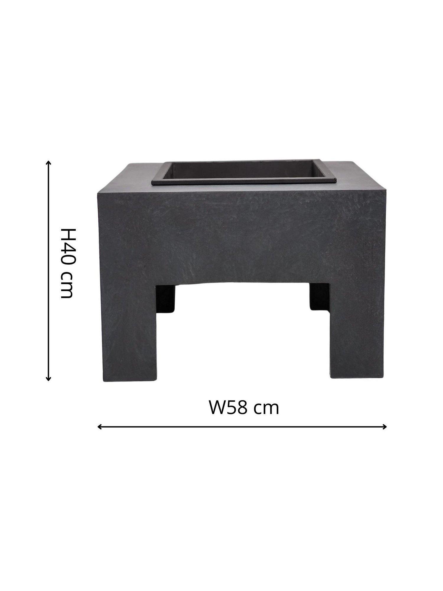 Square fire pit from Ivyline, a UV-stable and frost-resistant ultra-modern design to make a striking statement outdoors. Four thick legs ensure a sturdy build for your fire and the surrounding surface space gives you the perfect place to rest drinks. The central square tray is removable for easy cleaning, once cooled.