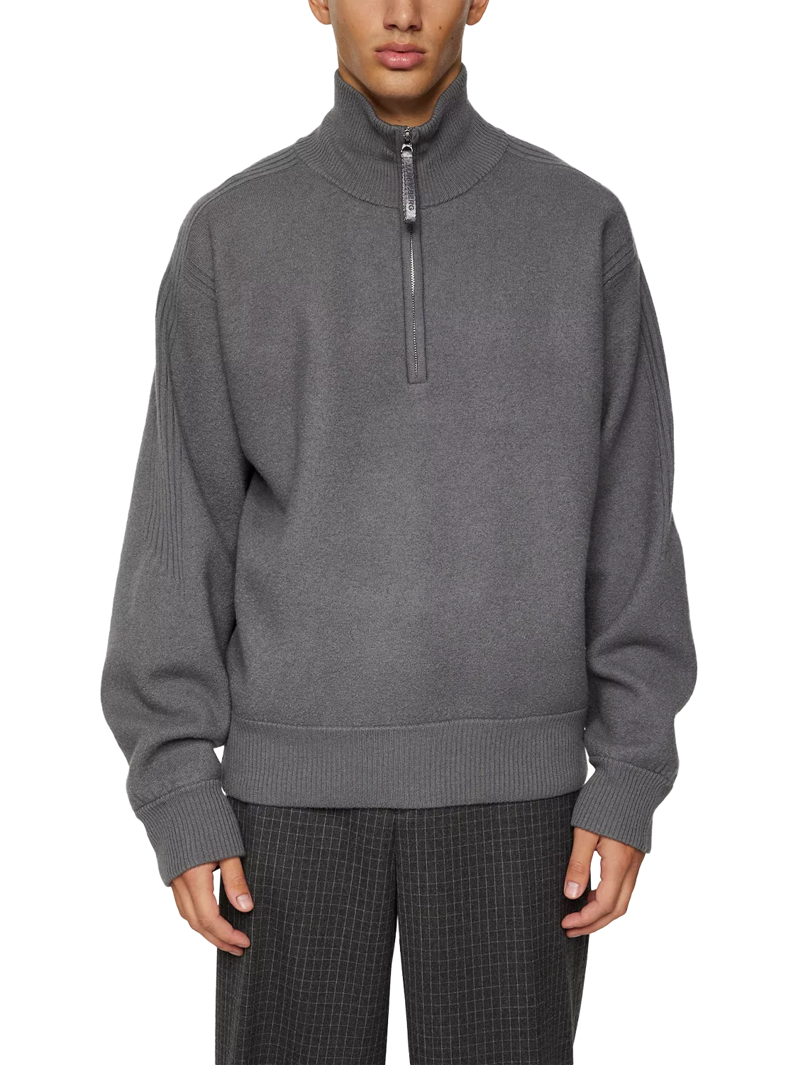 The Bon Boiled Wool Quarter Zip blends a relaxed fit with a rich texture. Its boiled wool composition and ribbed details offer a tactile, cosy feel, perfect for layering or as a standalone piece.