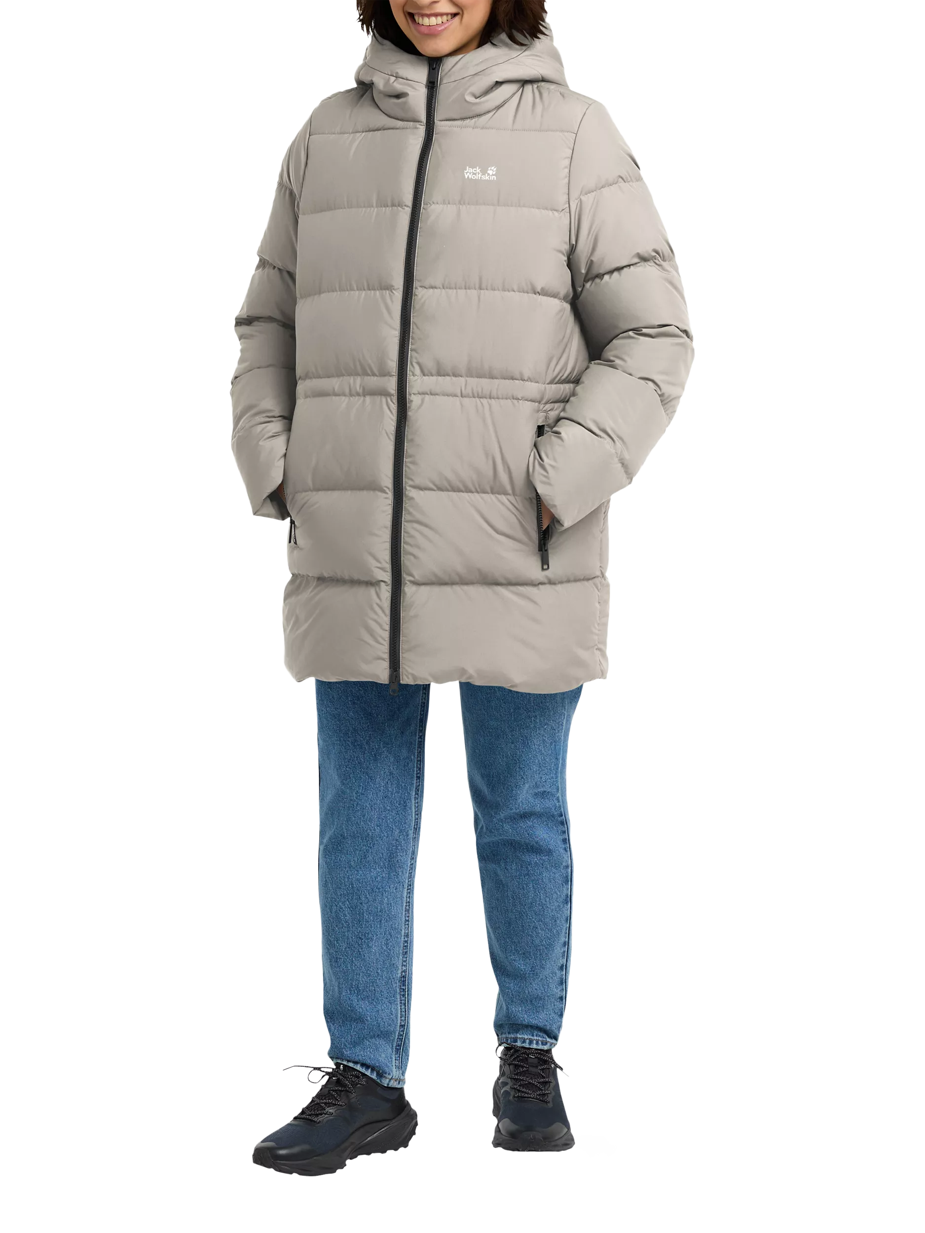 Embrace winter weather in this long winter coat. Grey duck down insulation offers cosy comfort, while windproof fabric repels water. Extra length and an attached hood add coverage. The adjustable waist offers a feminine fit. Three pockets keep essentials close at hand.