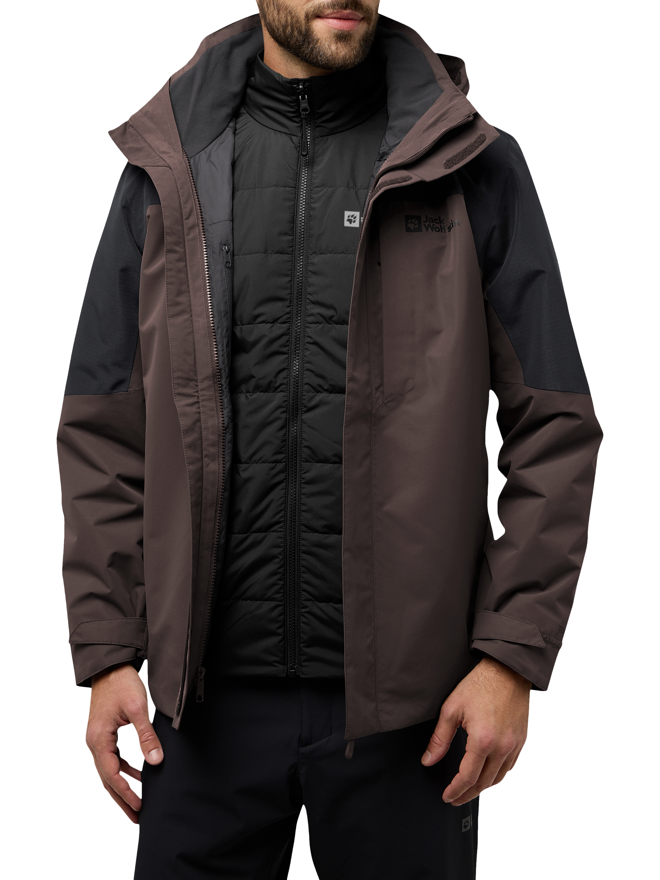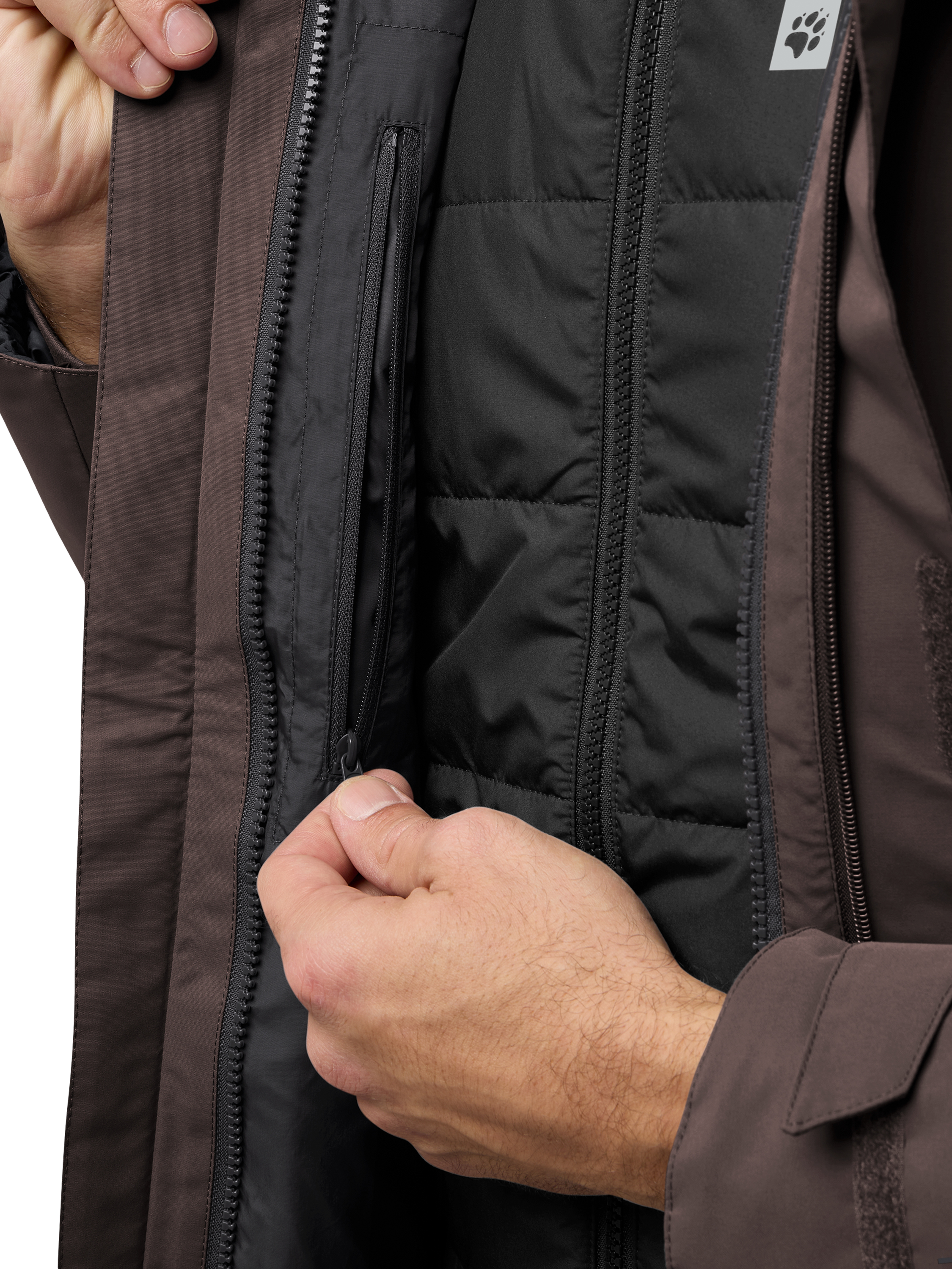 If you’re planning to go hiking in cold, wet weather, don’t leave home without this jacket. The outer jacket is made of waterproof, windproof and breathable TEXAPORE CORE and is very robust. The articulated elbows provide good freedom of movement. The hood is detachable and fully adjustable. Three outer pockets and a secret pocket offer plenty of room for hiking essentials. The windproof and water repellent inner jacket has a fill made of recycled synthetic fibre.