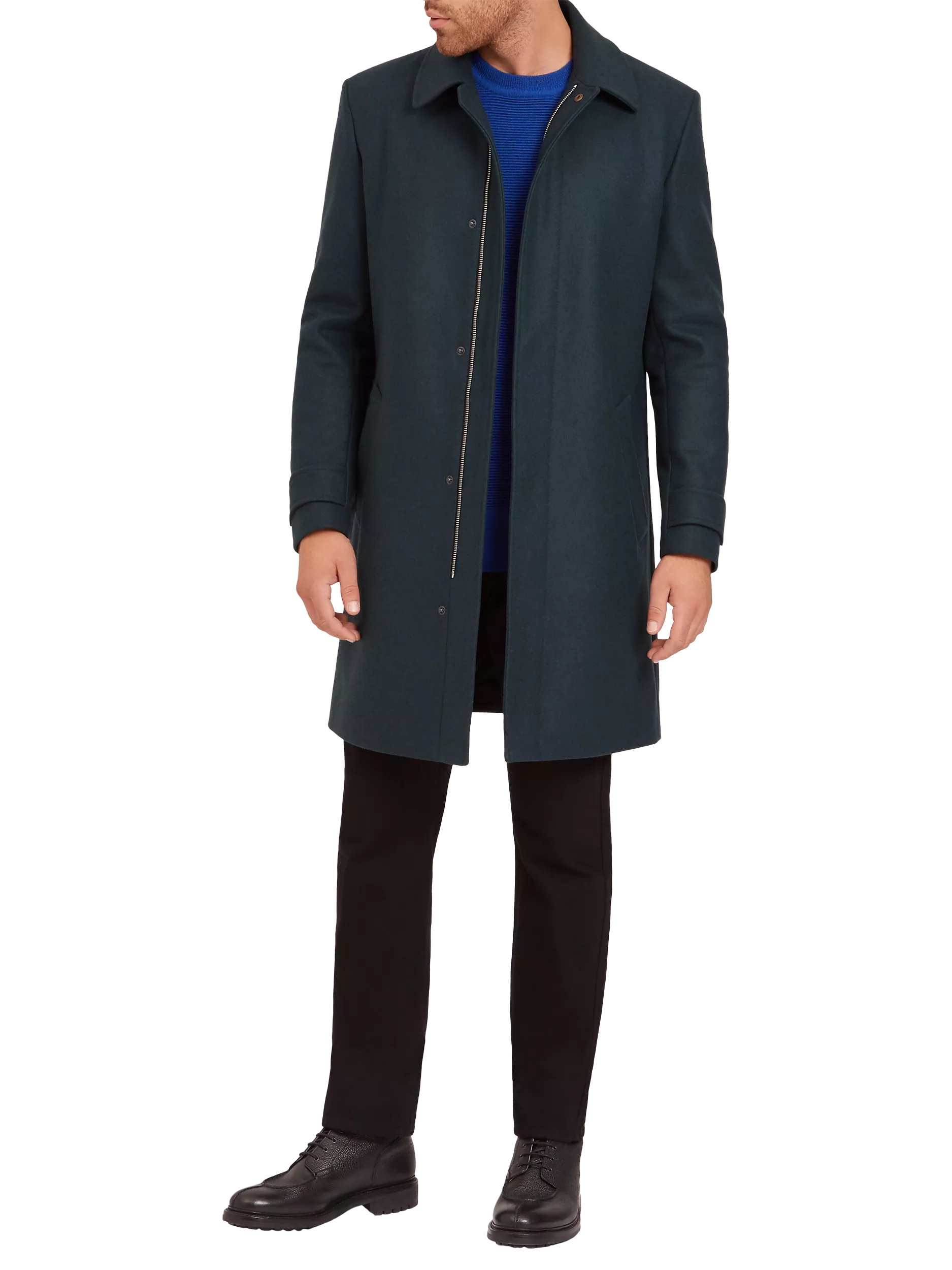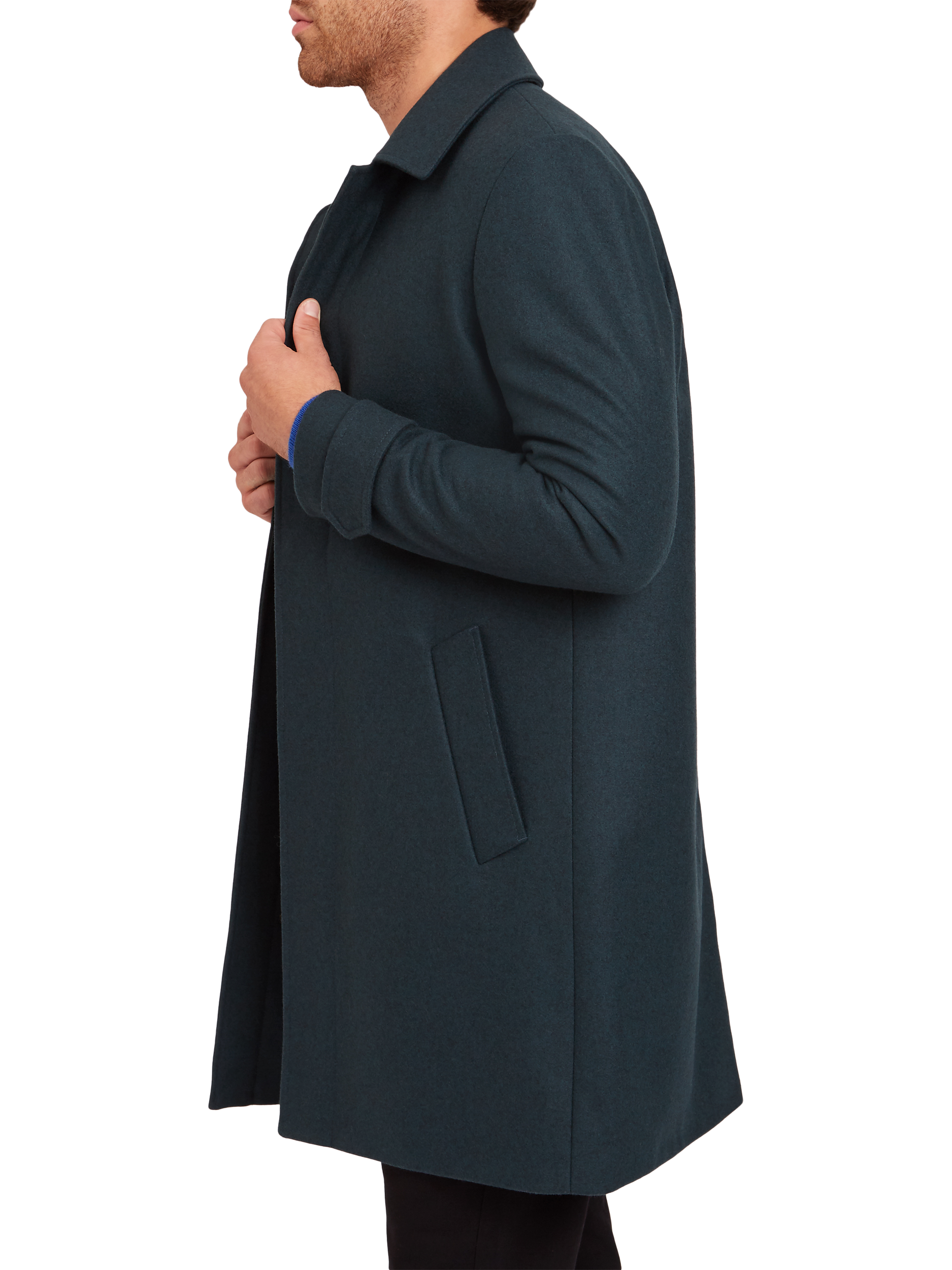 Cut to a mid length in a slim fit for a sharp silhouette, it features a zip front concealed by a press stud front for a streamlined look, it features a classic collar, slanted side pockets, cuff tabs and single vent to the reverse.