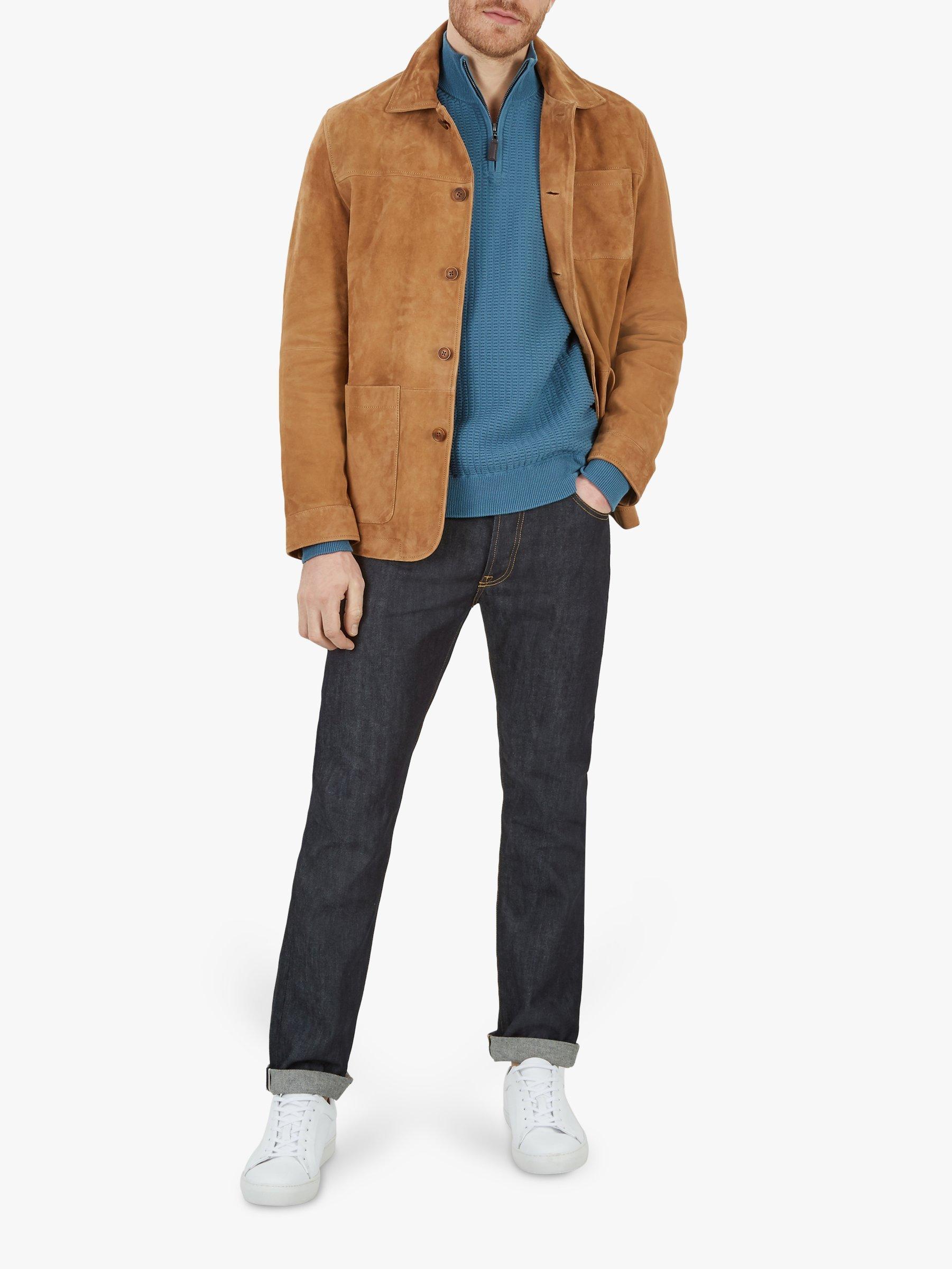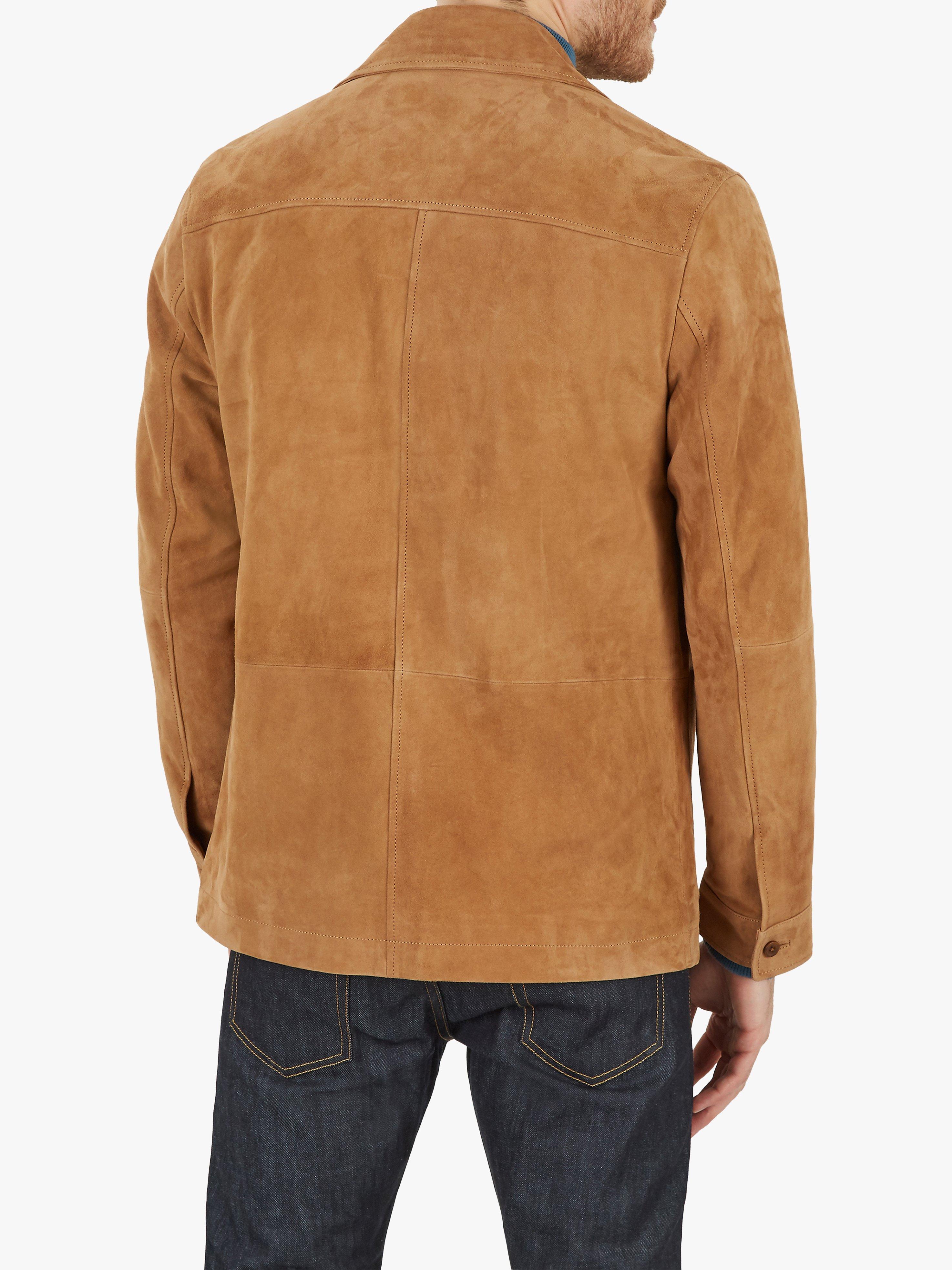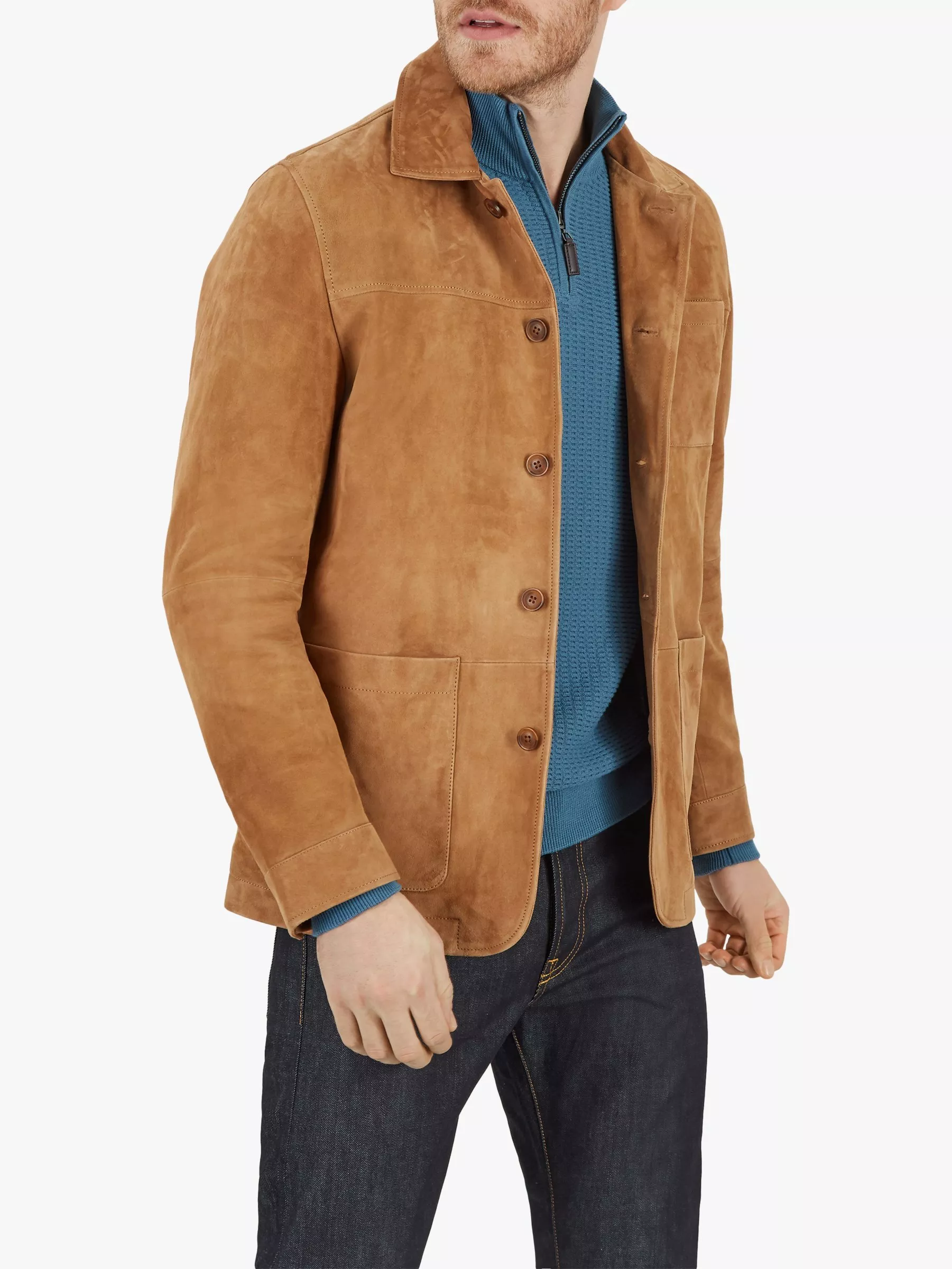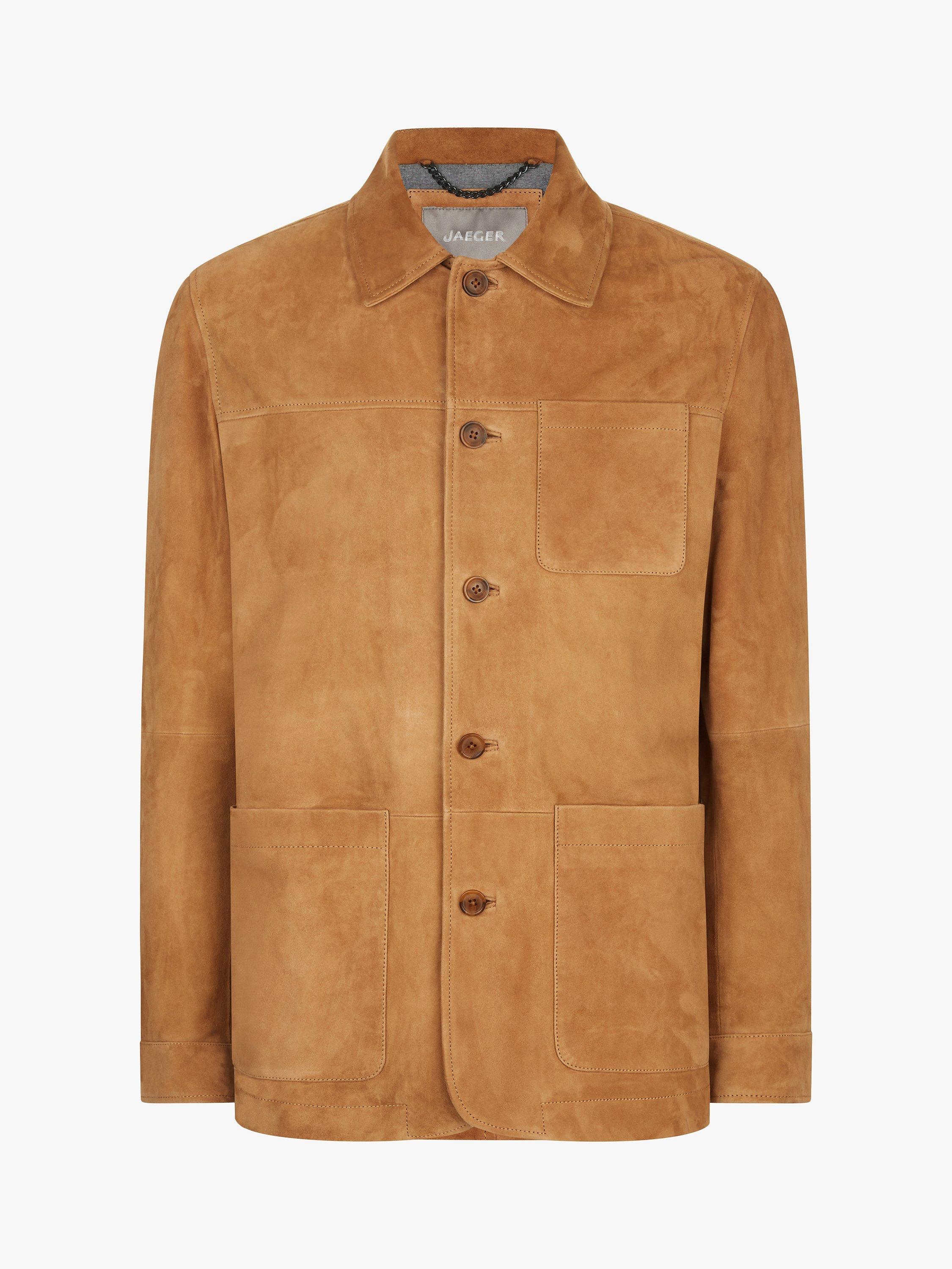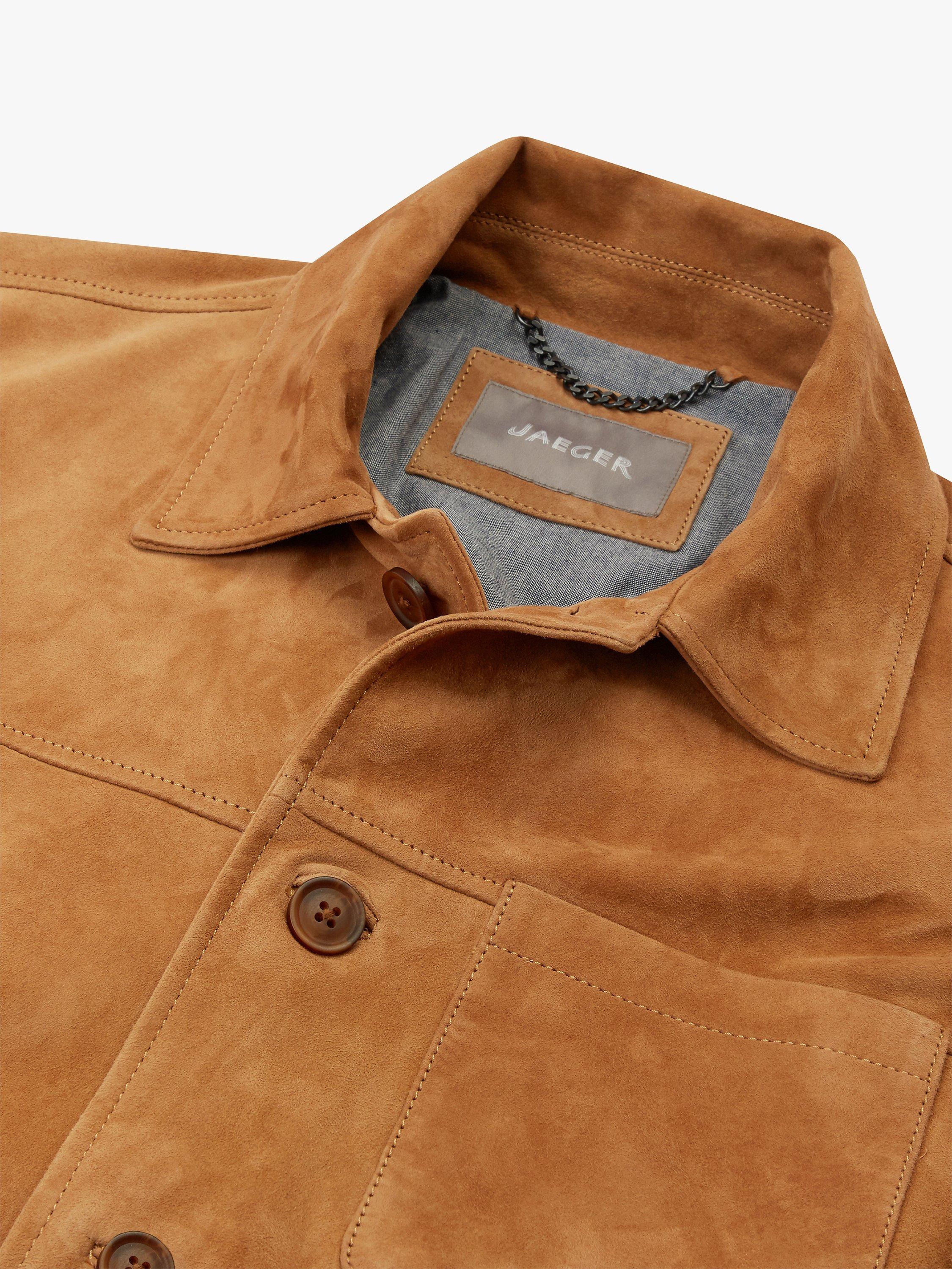 Crafted from soft suede, it features intricate stitching detail, three large pockets and pointed collar.