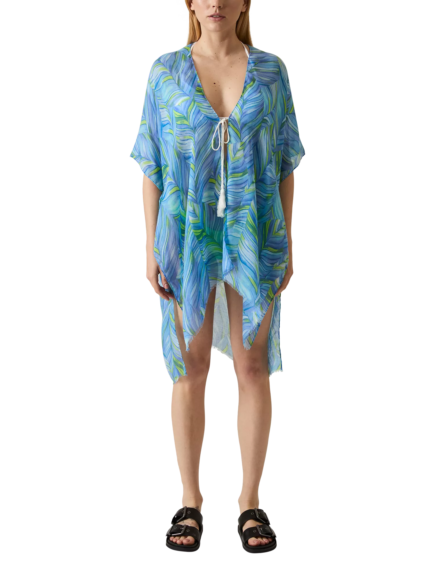A vibrant statement piece, this Abstract Print Kaftan by James Lakeland features flowing fabric adorned with bold abstract swirls. Its deep V-neckline, tied with a delicate string and tassels, adds an elegant touch. Perfect for layering over trousers or swimwear, this kaftan blends effortless chic with eye-catching design.