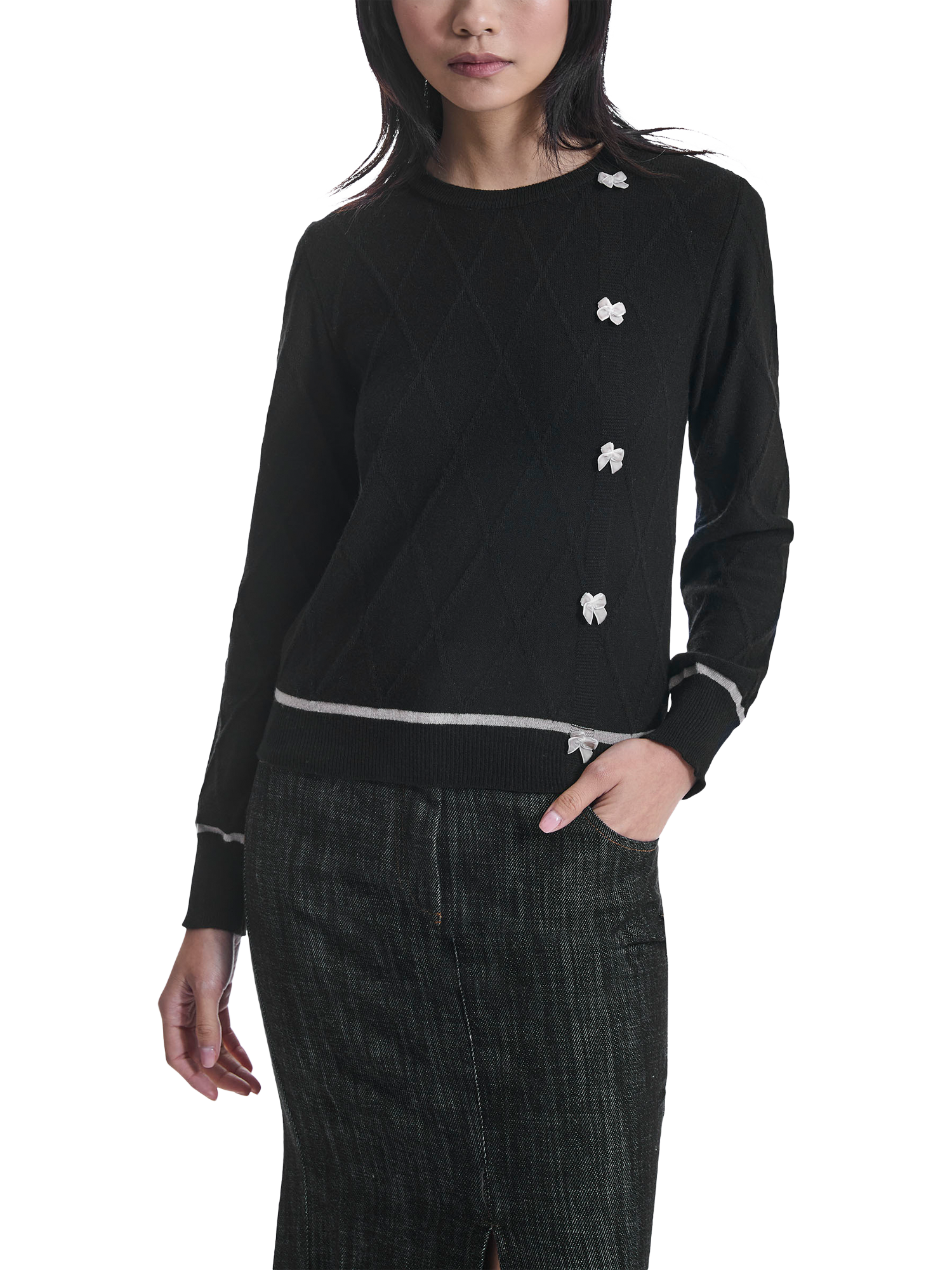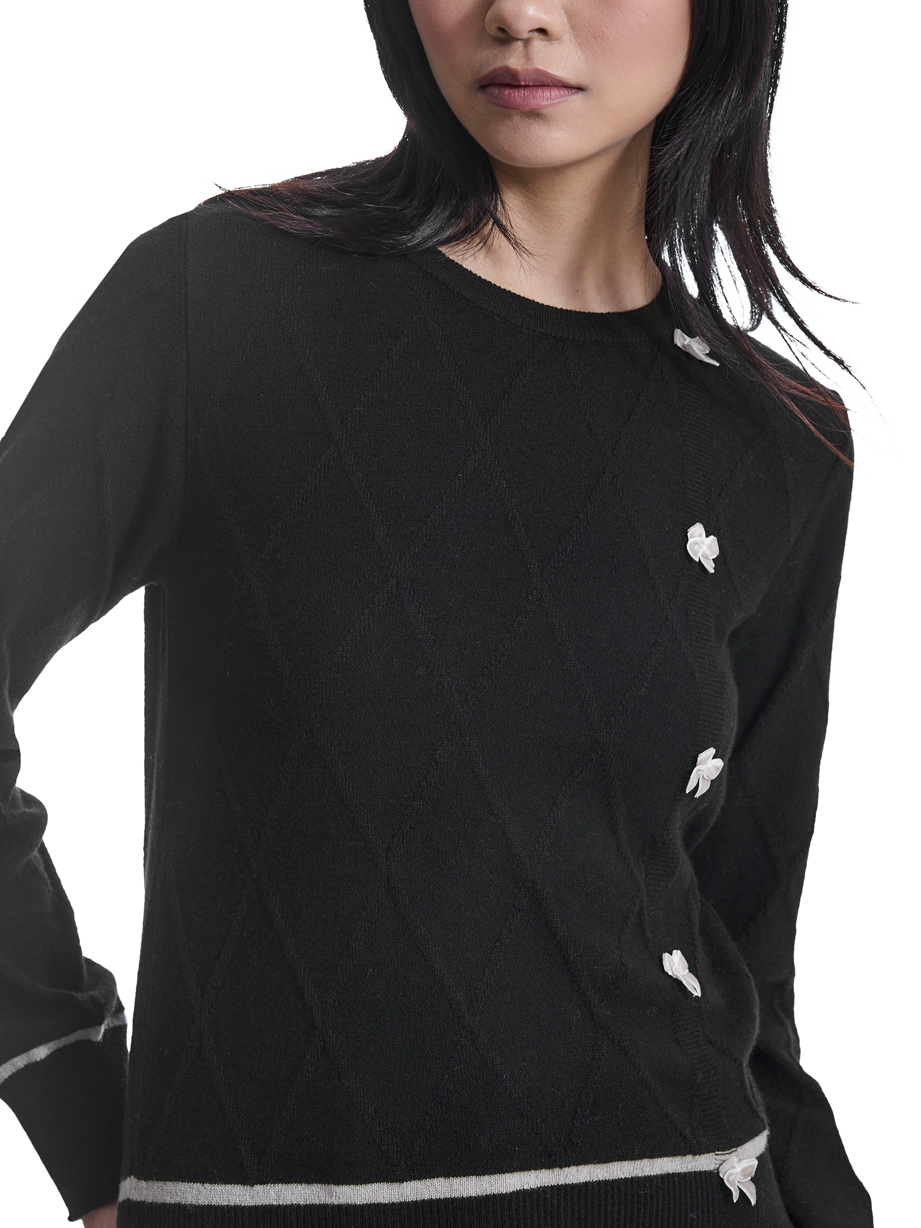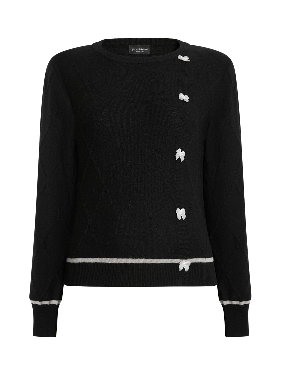Wrap yourself in James Lakeland's cosy elegance with this knitted jumper featuring a stunning diamond-shaped stitch pattern. Adorned with five charming bows cascading down the left front, it exudes playful sophistication. The ribbed stripe at the hem and cuffs adds a touch of modern flair, making this piece perfect for any stylish occasion.