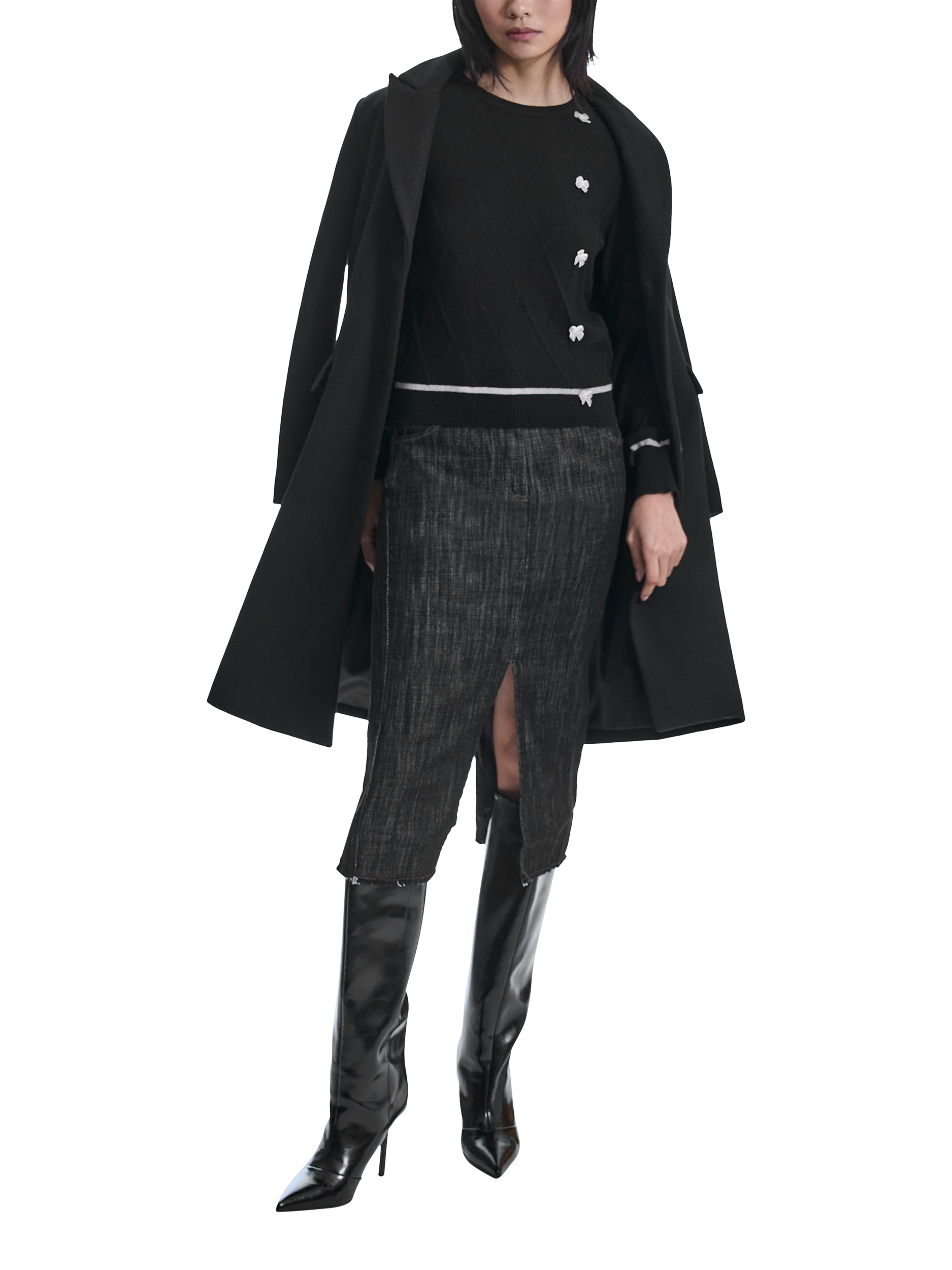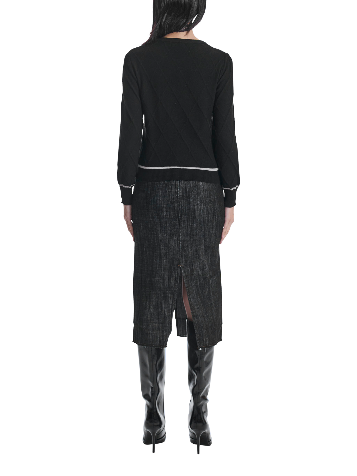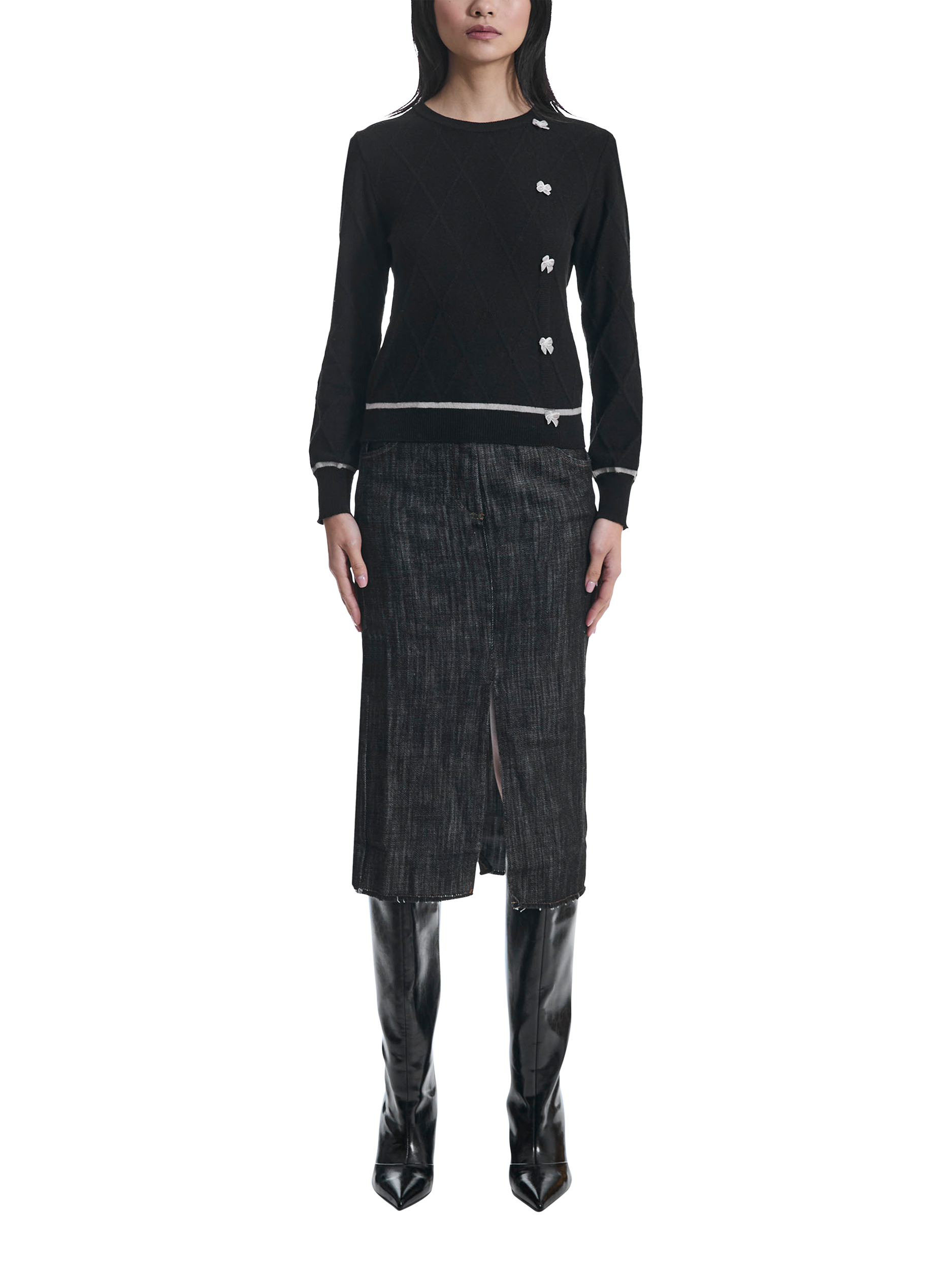 Wrap yourself in James Lakeland's cosy elegance with this knitted jumper featuring a stunning diamond-shaped stitch pattern. Adorned with five charming bows cascading down the left front, it exudes playful sophistication. The ribbed stripe at the hem and cuffs adds a touch of modern flair, making this piece perfect for any stylish occasion.
