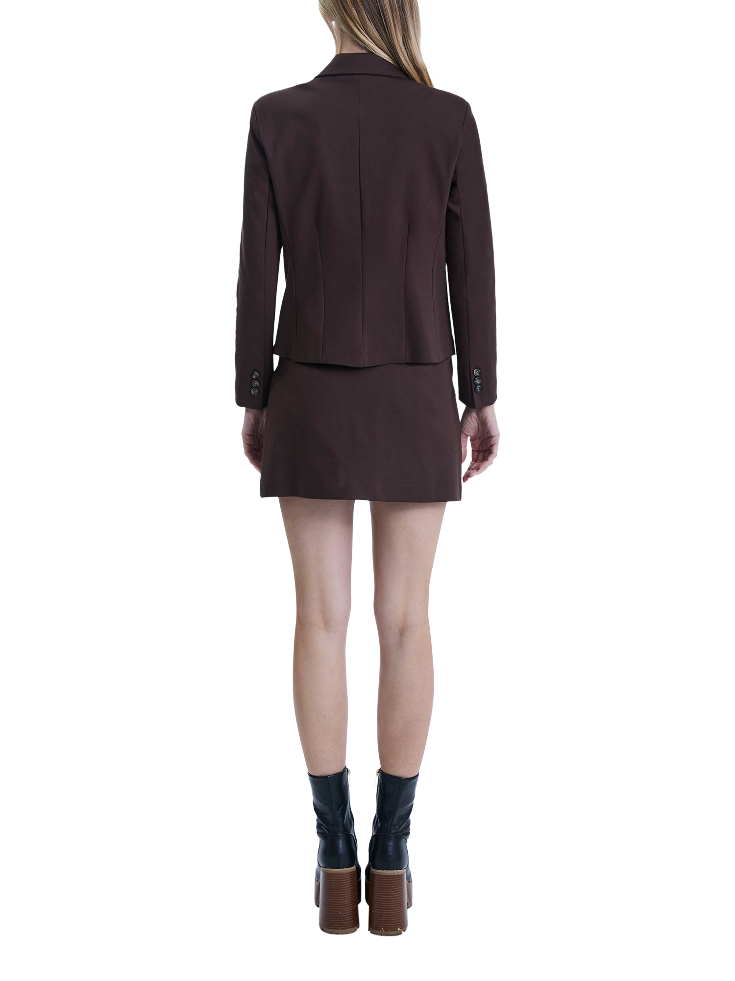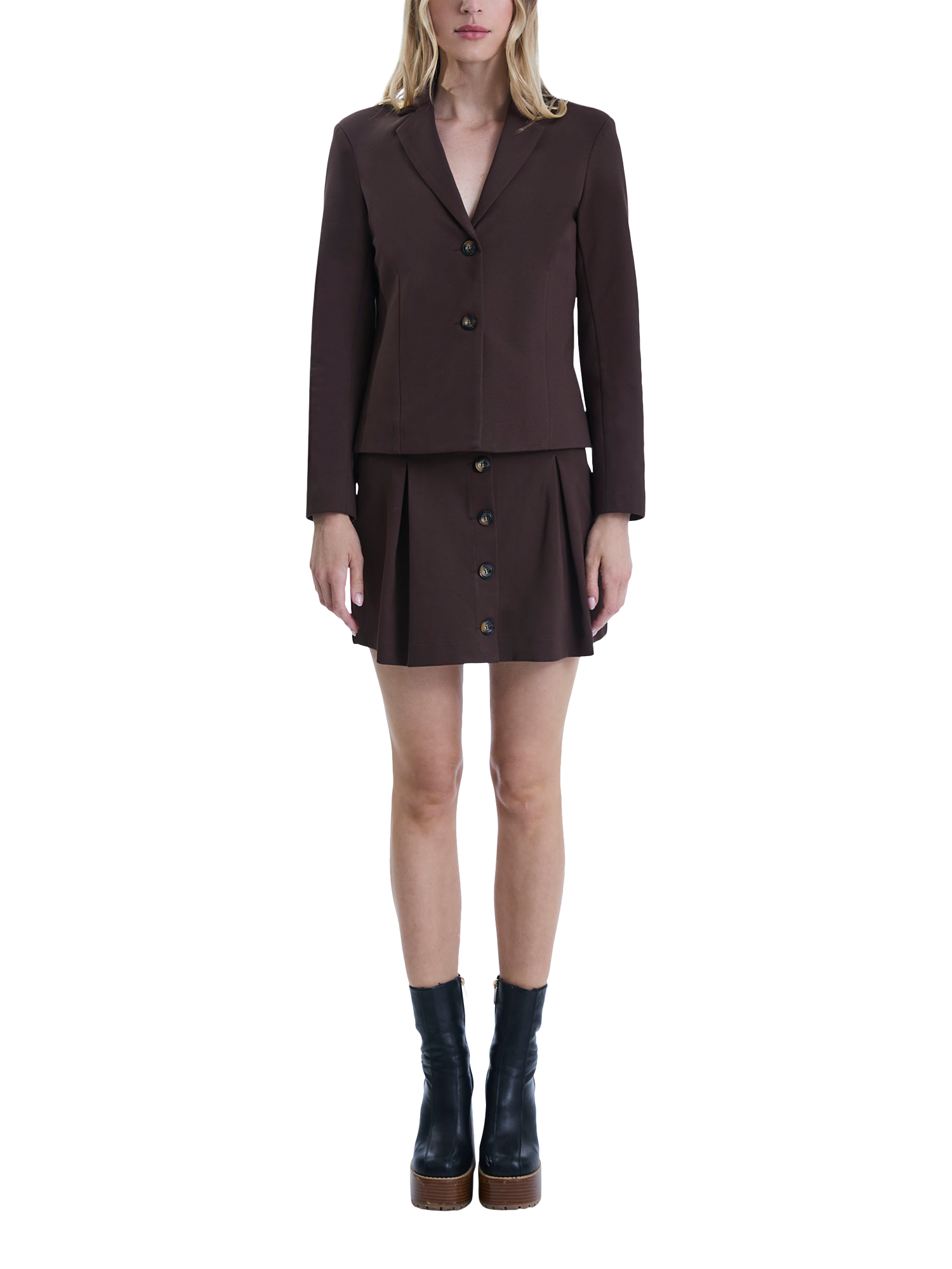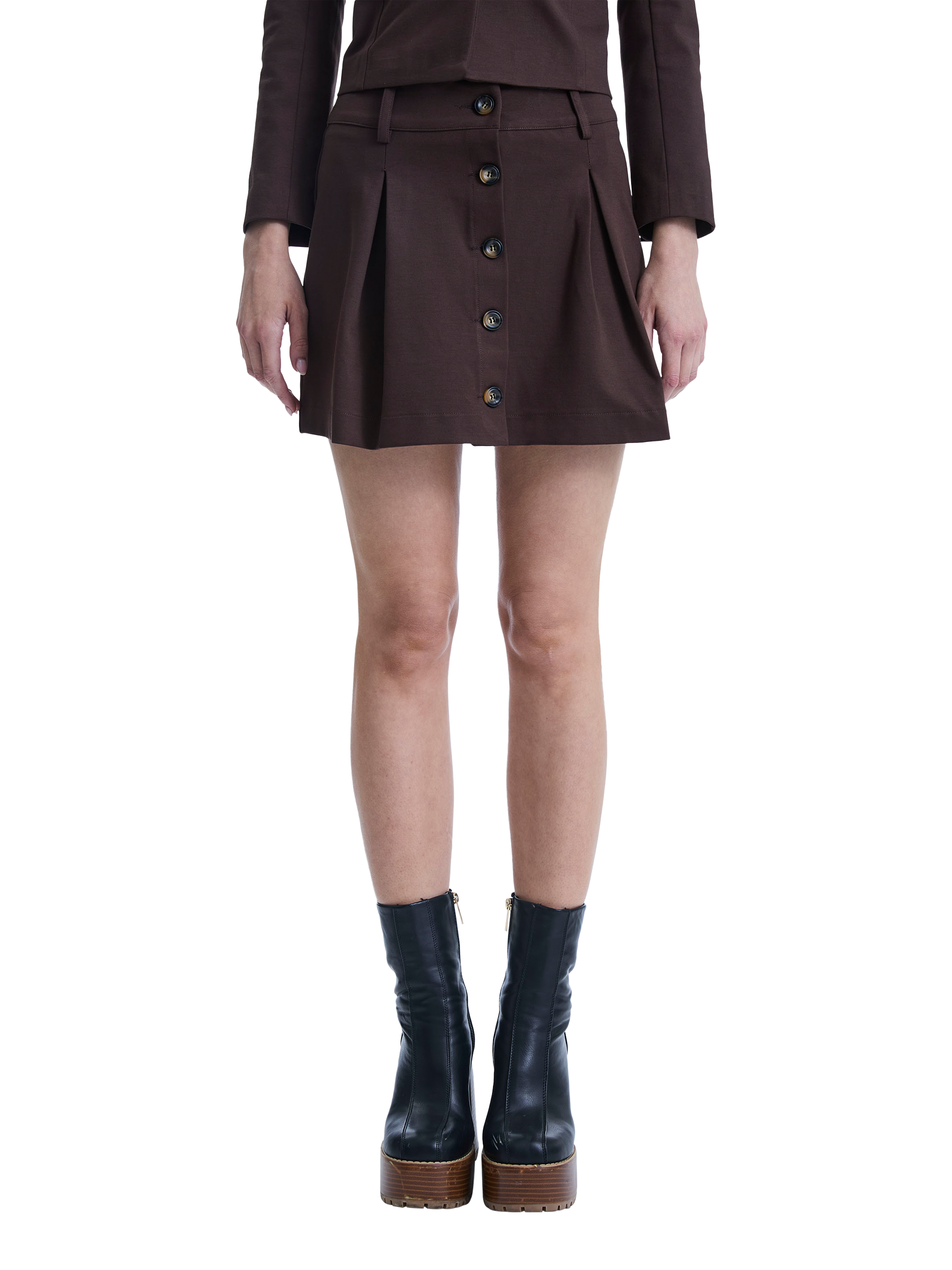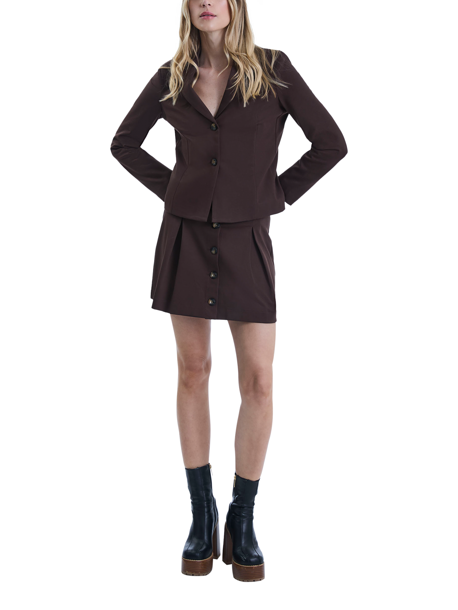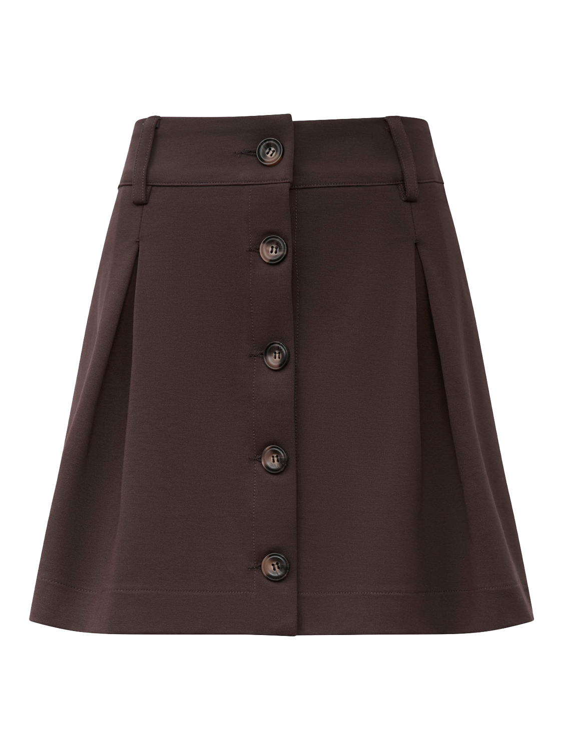 The short James Lakeland Skirt is a fresh new design. Made in a hefty yet stretchy jersey fabrication, allowing great comfort. Buttoning down with faux horn buttons, this mini skirt can be belted at the waist. Featuring pin tuck pleats at the front and tailoring throughout, offering a great fit. Perfectly pair with the Two button blazer for the ideal ensemble.