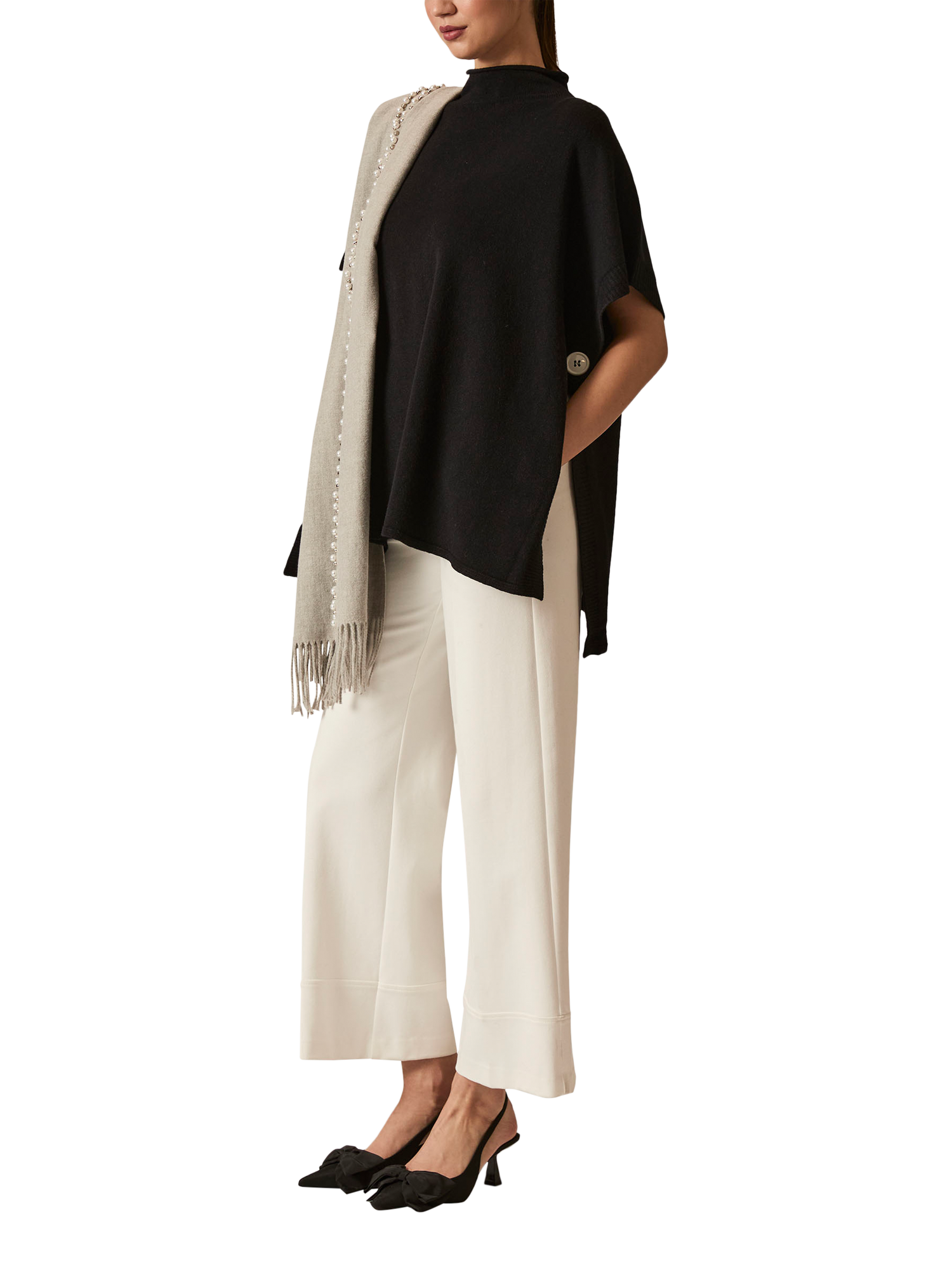 James Lakeland’s Black Poncho is a one-size, easy-to-style layer with a relaxed round neckline and short sleeves. Finished with one cream button on each side for subtle contrast, it offers effortless elegance and versatility for transitional dressing.