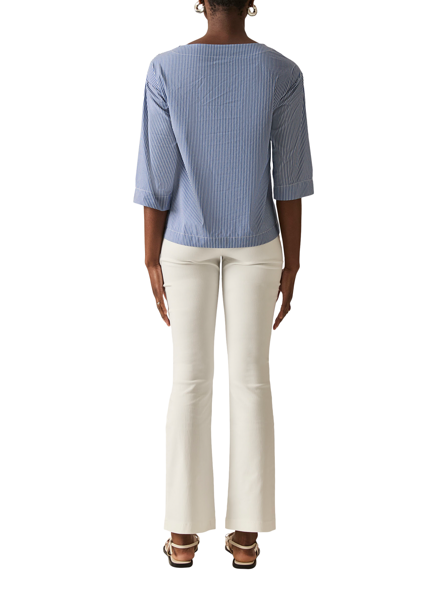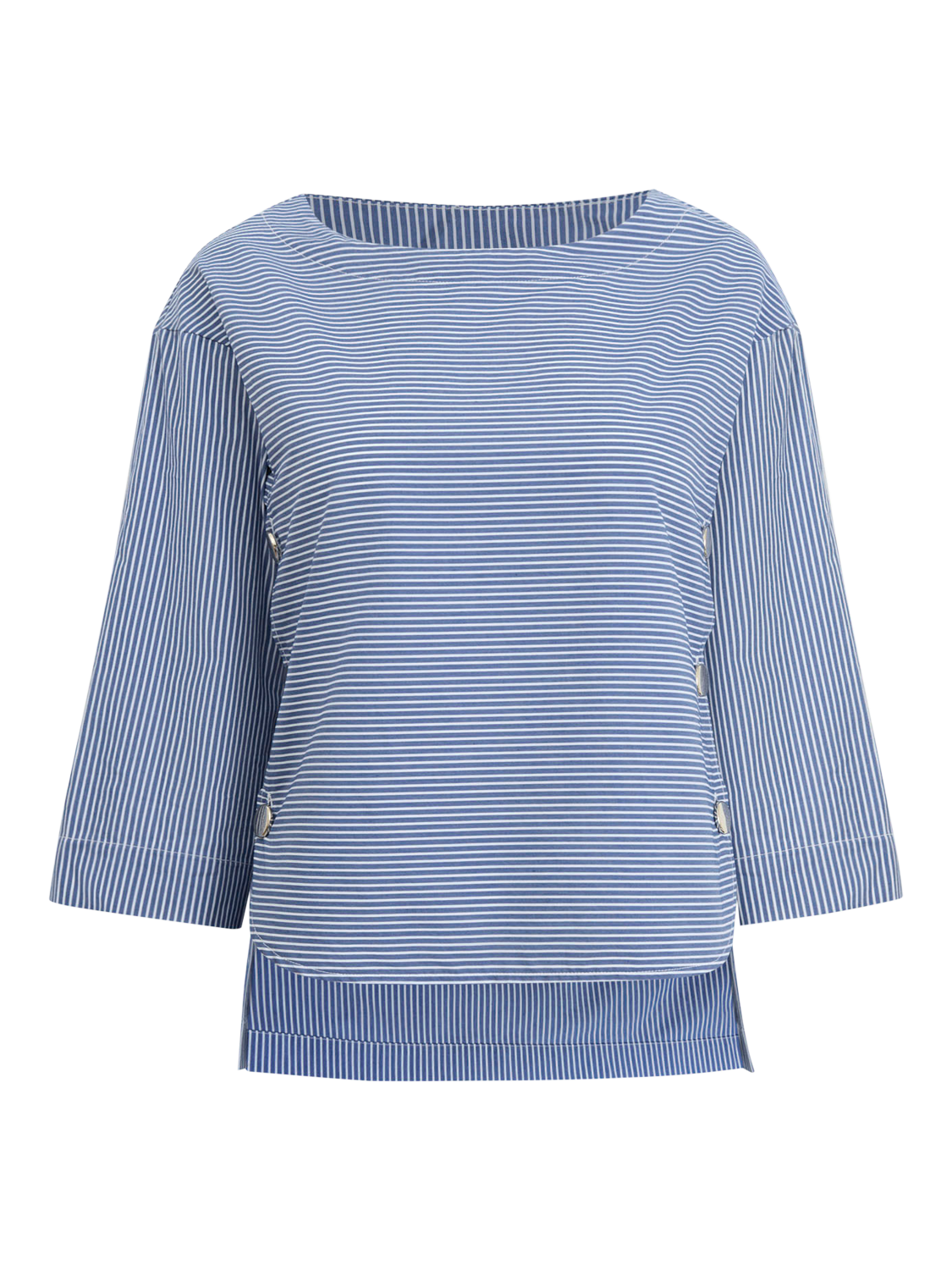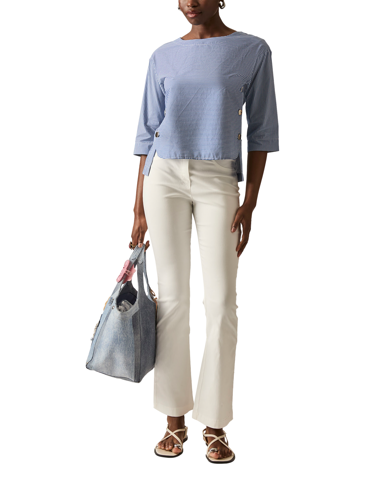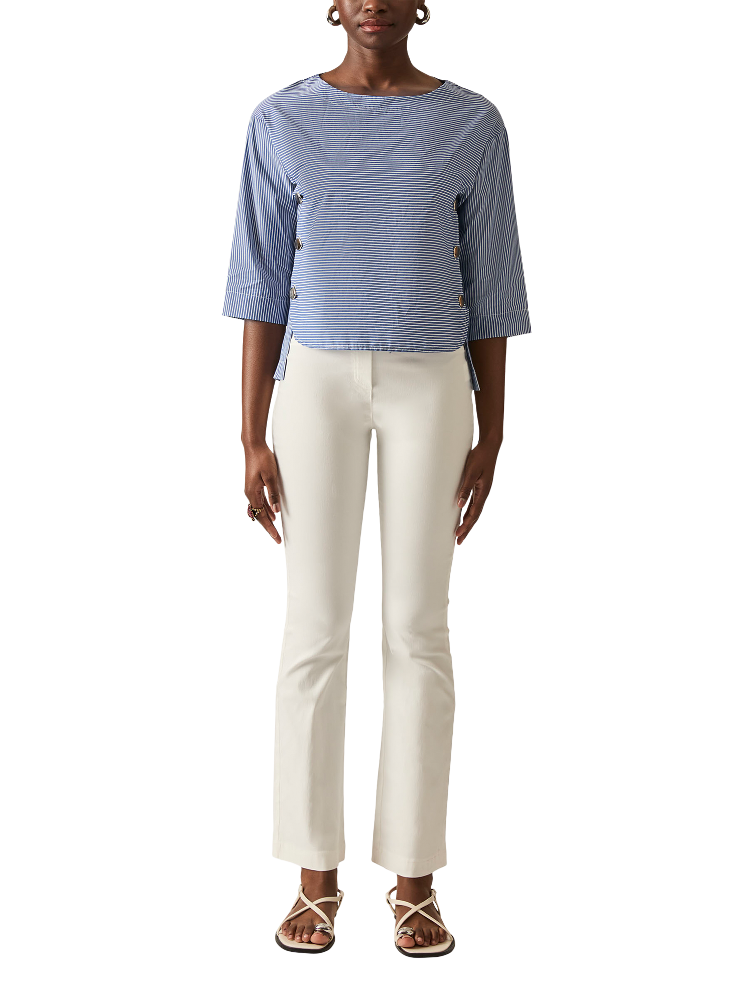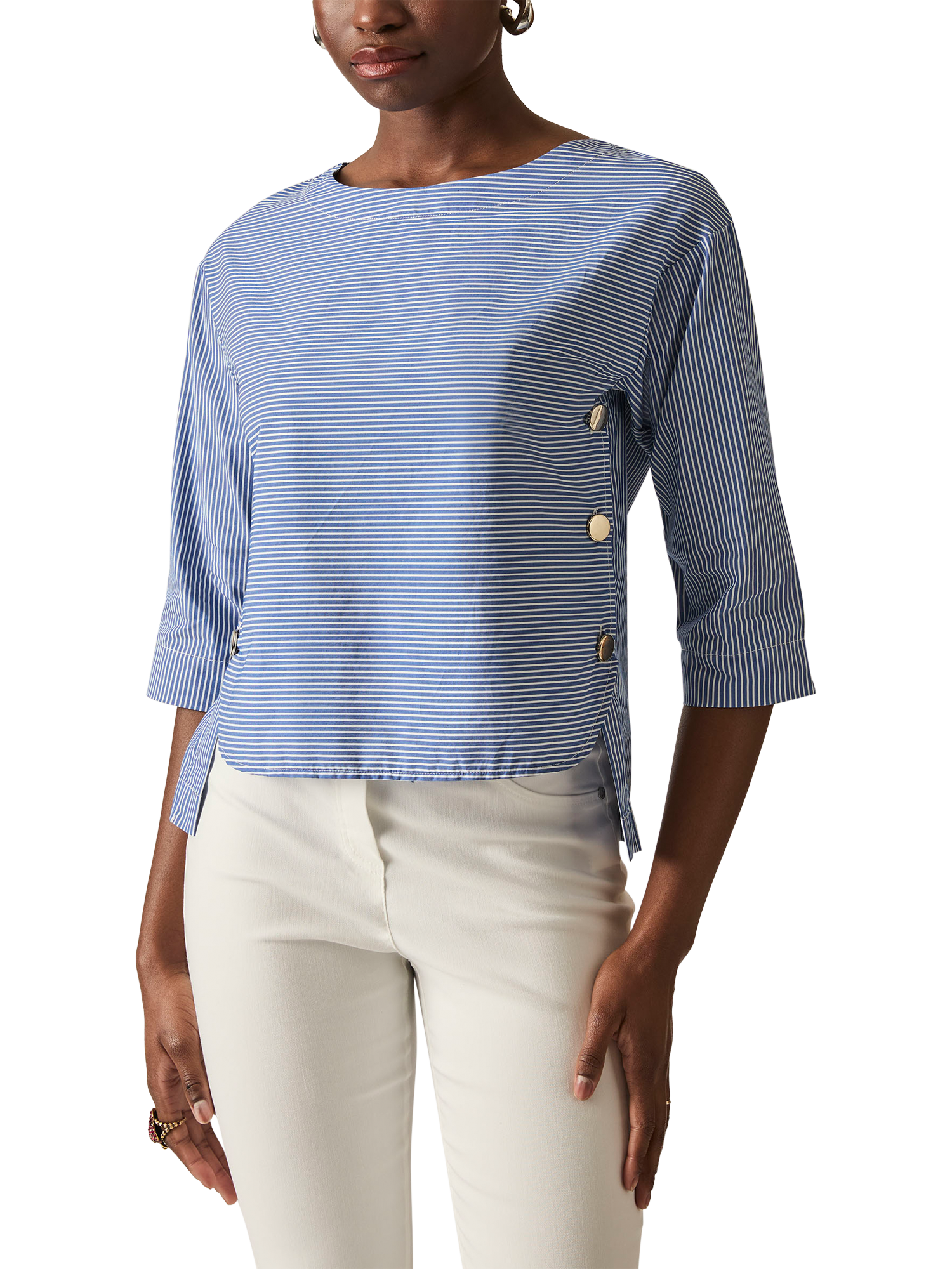 This James Lakeland cropped side button navy stripe top is a summer must-have, crafted from light cotton for a fresh feel. The wide boat neck and golden buttons add a touch of luxury, while the three-quarter sleeves and slightly shorter front make it the perfect blend of style and comfort for the warmer season.